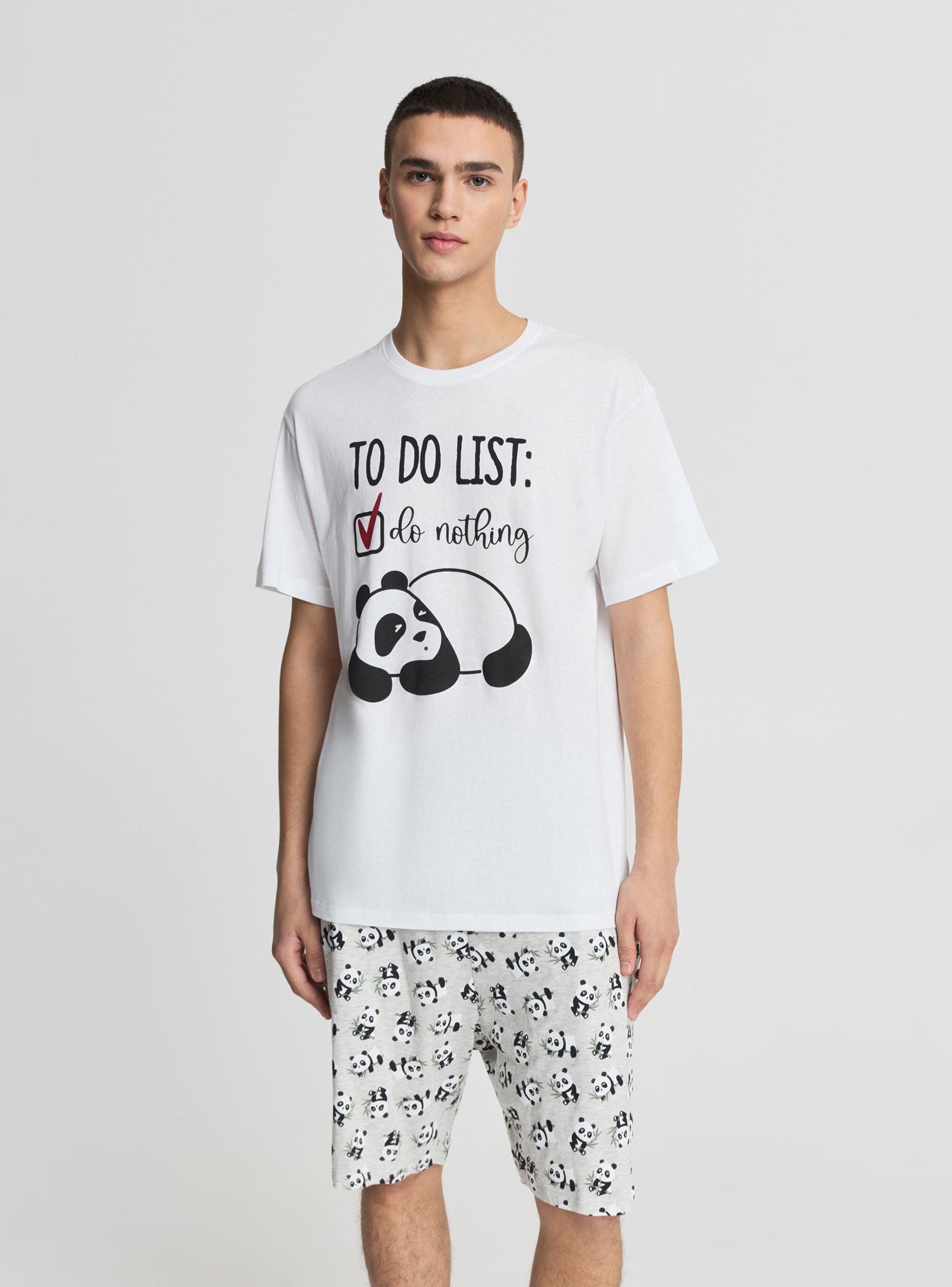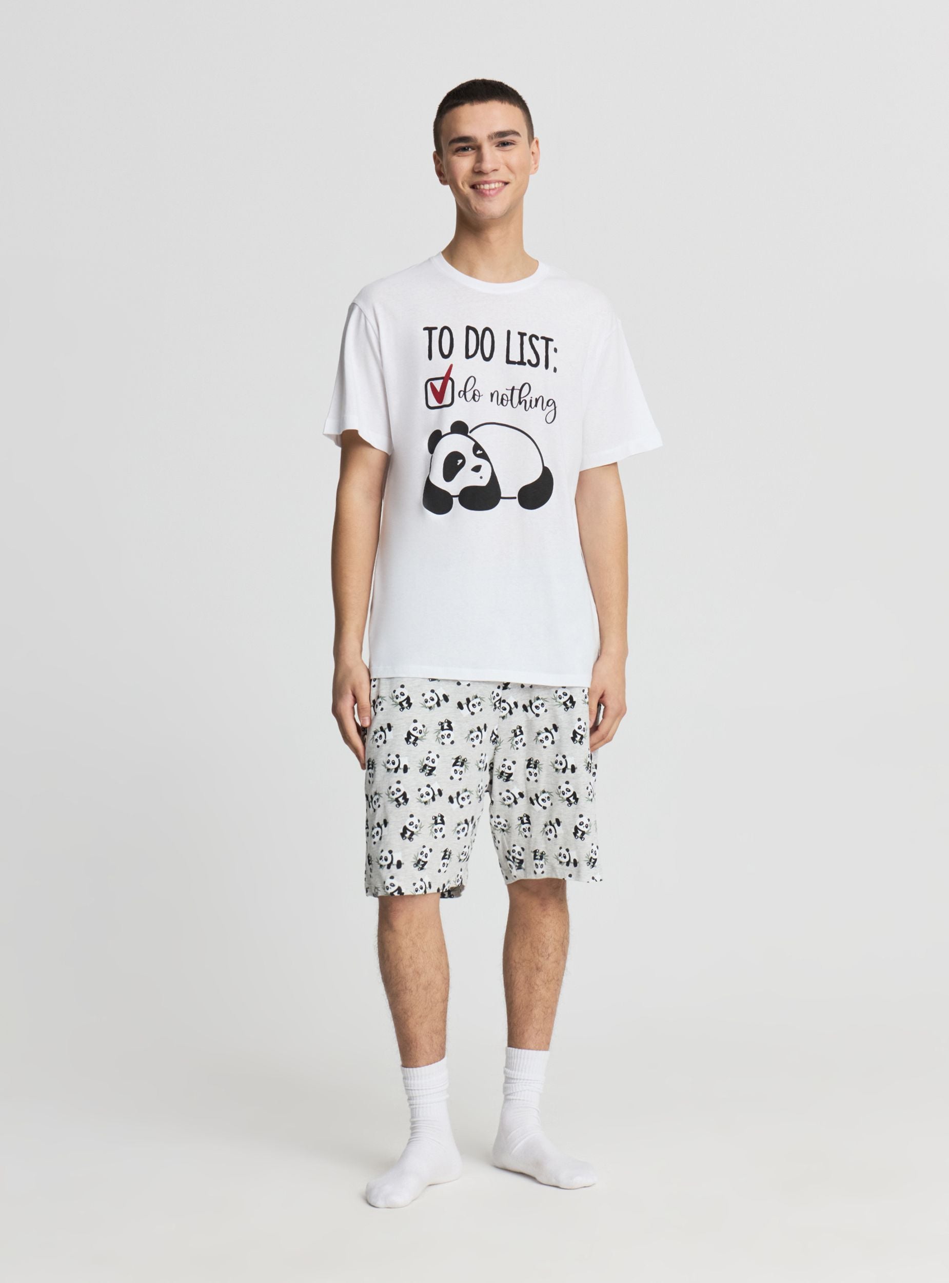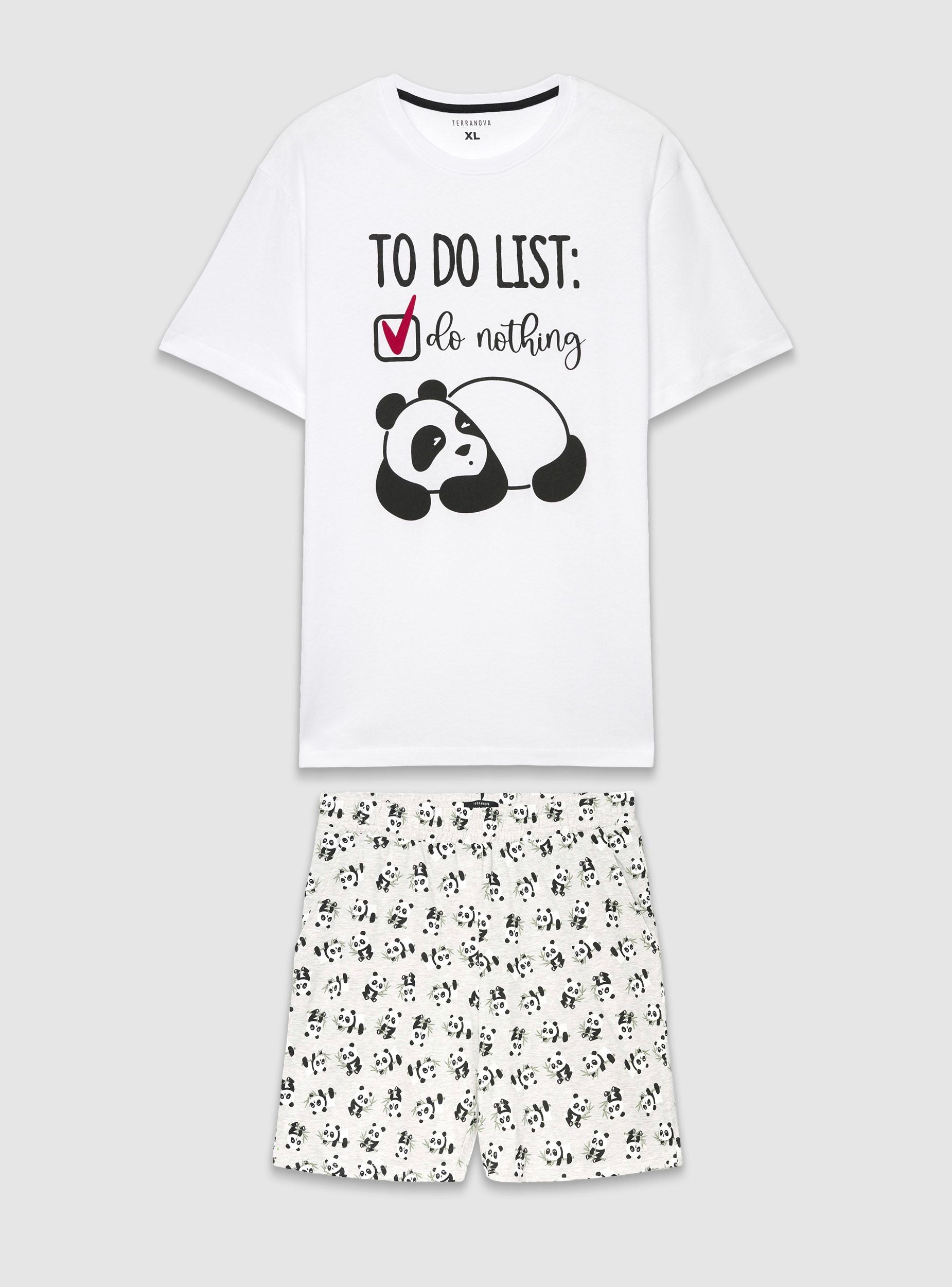 Pigiama da uomo composto da maglietta a maniche corte con girocollo e stampa con scritta e panda sul davanti, ideale per il relax. Bermuda coordinati con elastico in vita e fantasia all over di panda, pensati per garantire comfort nei momenti di riposo. Set pratico da abbinare anche a ciabatte e vestaglia nelle serate in casa.Dettagli