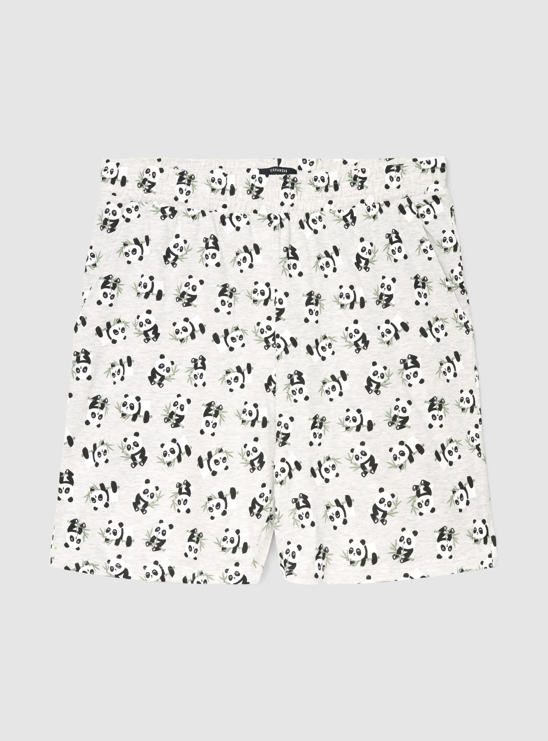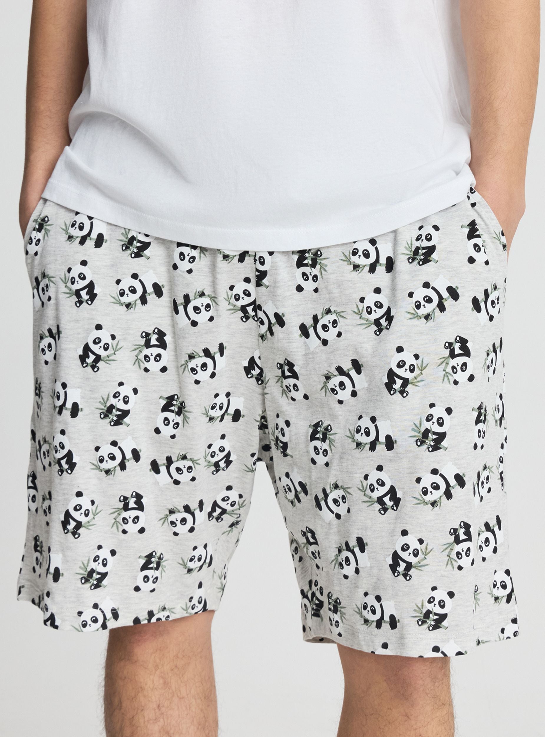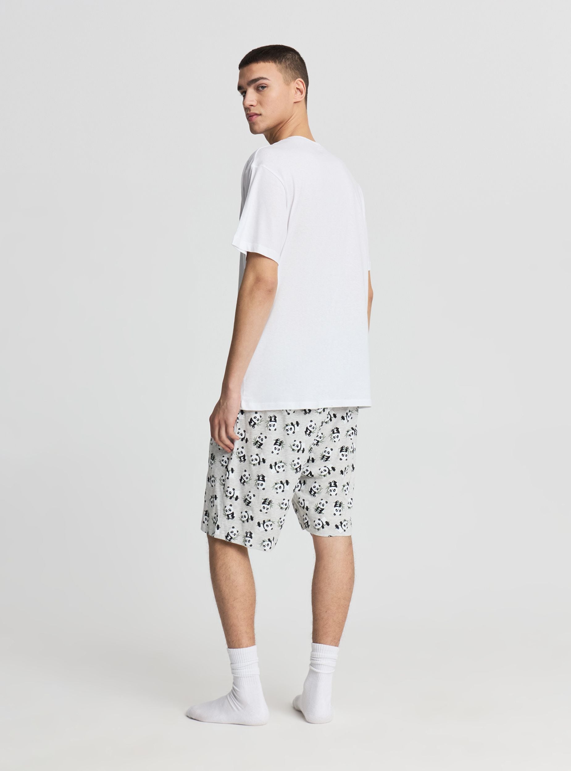 Pigiama da uomo composto da maglietta a maniche corte con girocollo e stampa con scritta e panda sul davanti, ideale per il relax. Bermuda coordinati con elastico in vita e fantasia all over di panda, pensati per garantire comfort nei momenti di riposo. Set pratico da abbinare anche a ciabatte e vestaglia nelle serate in casa.Dettagli