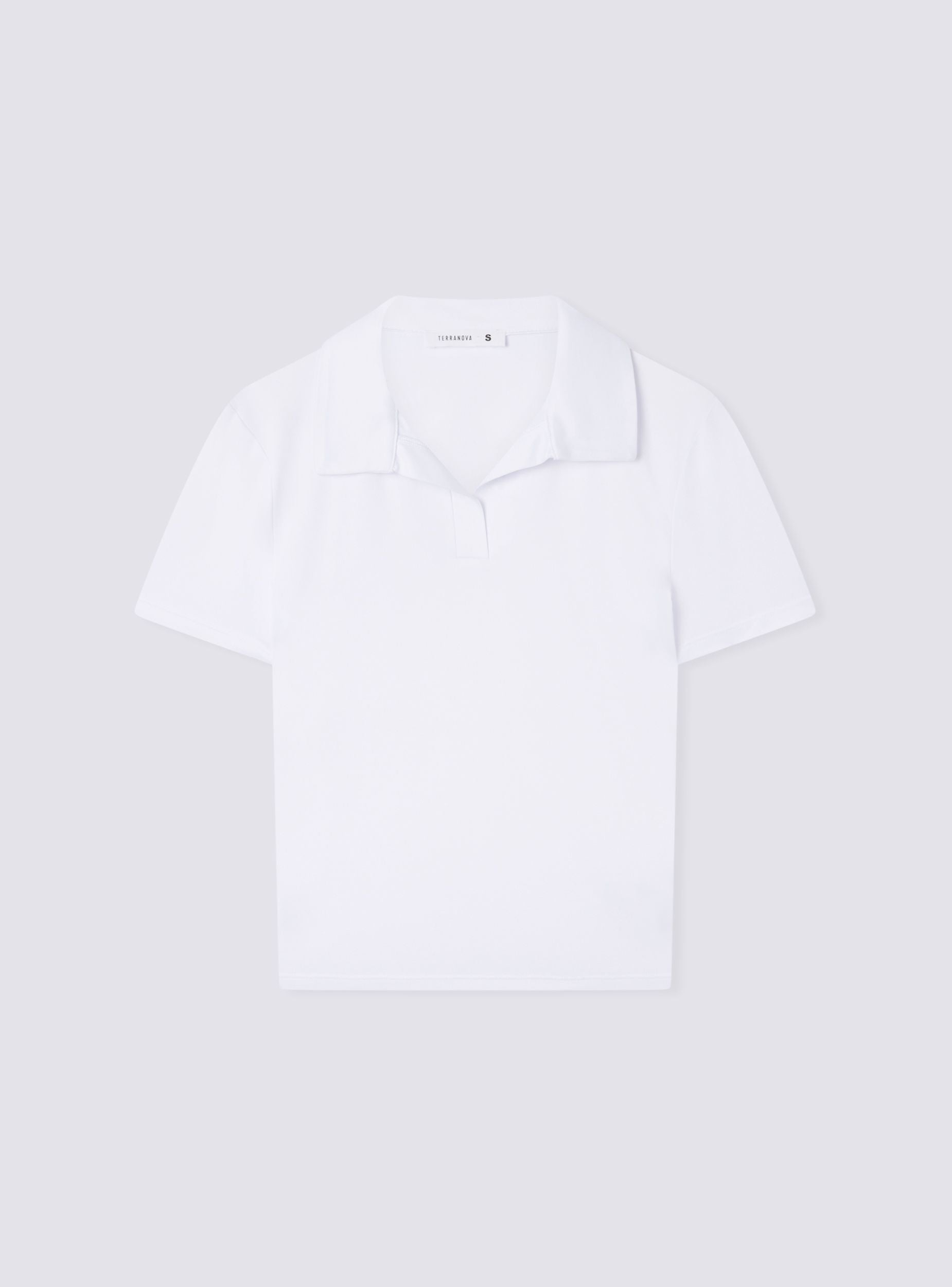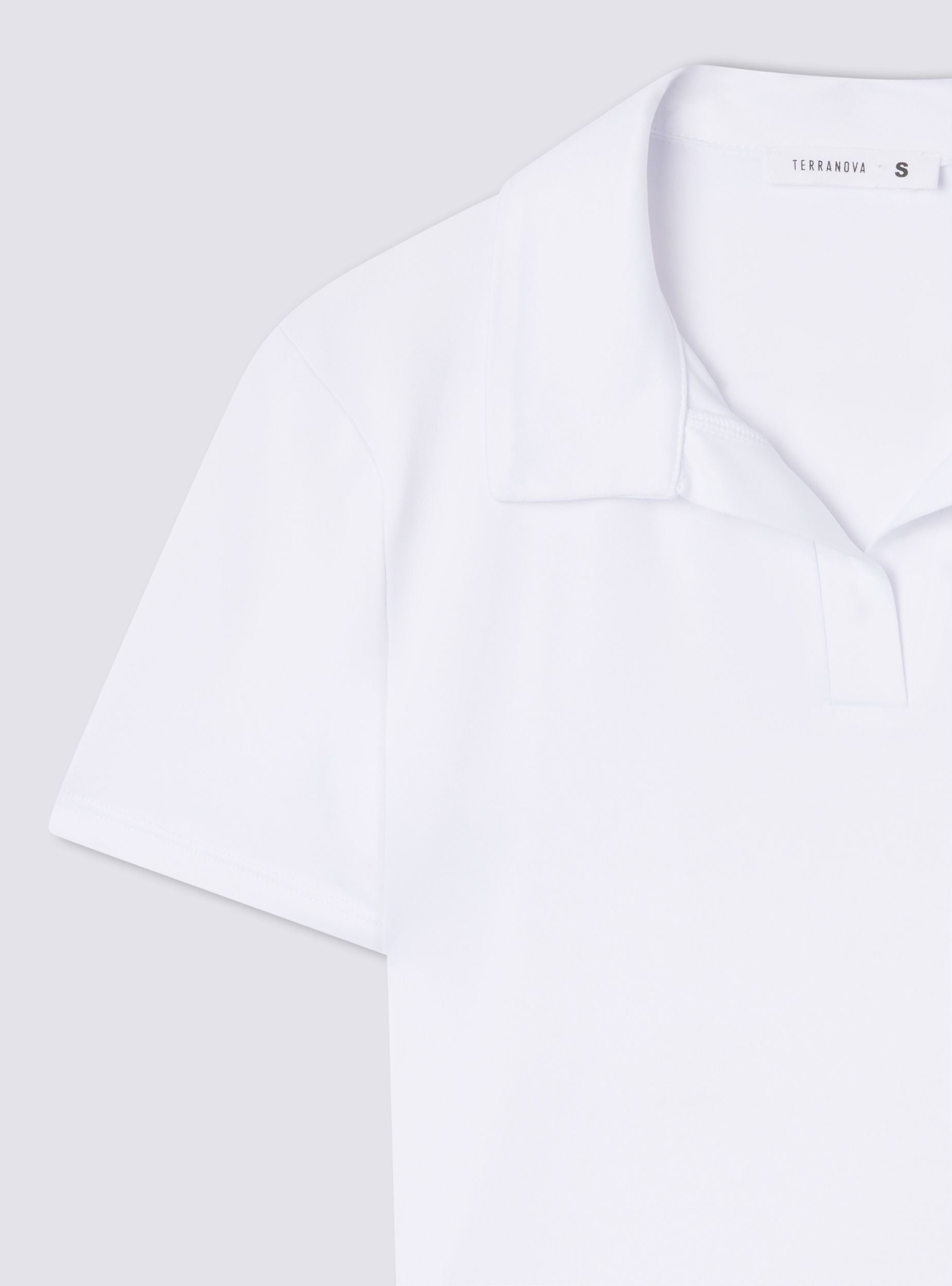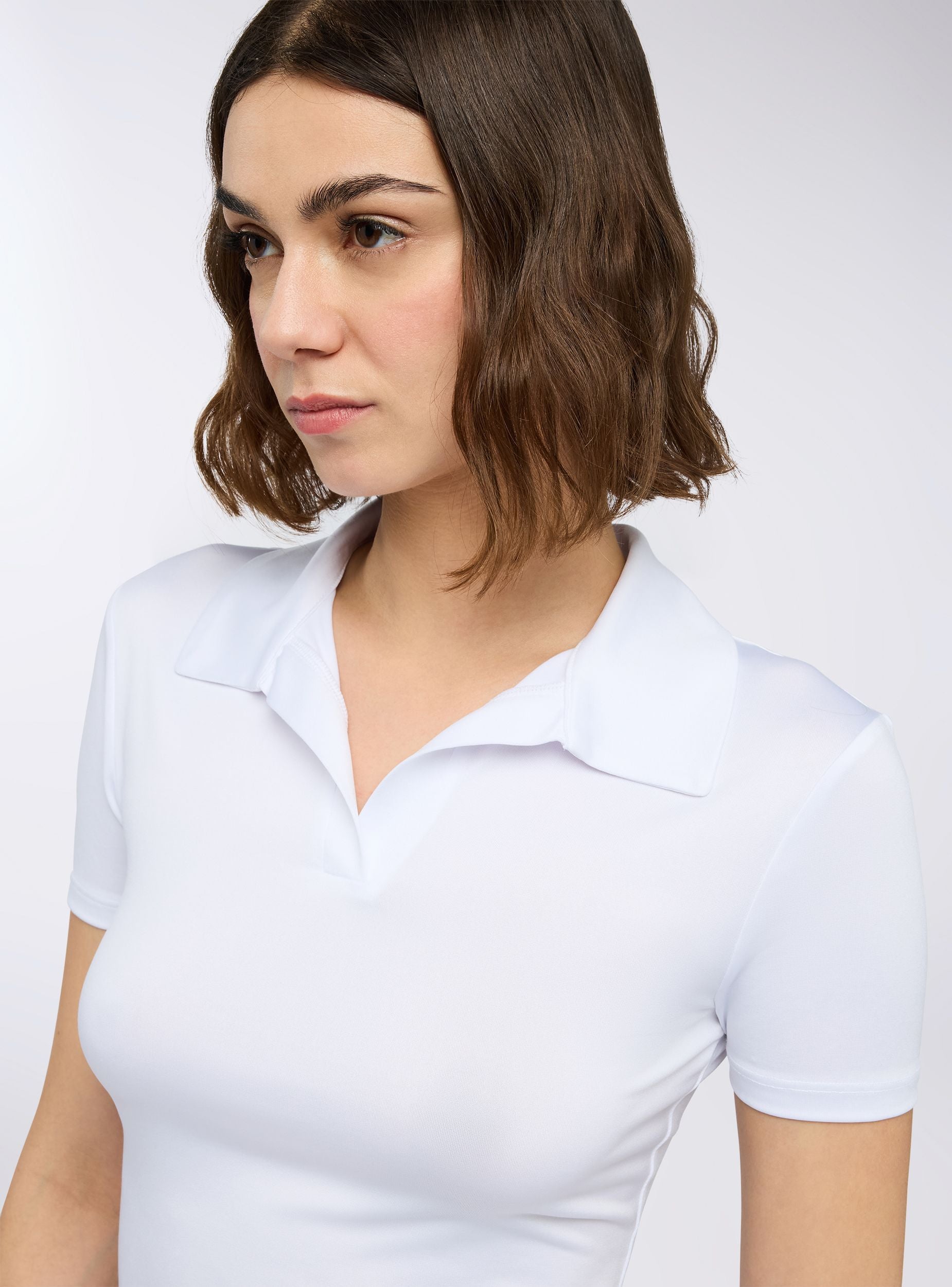 Maglietta da donna modello polo con vestibilità slim fit, caratterizzata da un colletto classico e una scollatura a V. Le maniche corte conferiscono al capo un aspetto casual e versatile, ideale per un look sporty-chic o per essere abbinata a pantaloni eleganti per un outfit più raffinato. Perfetta da indossare sia per un’occasione informale che per un look più curato, mantenendo sempre un tocco di eleganza grazie al taglio aderente.Dettagli
