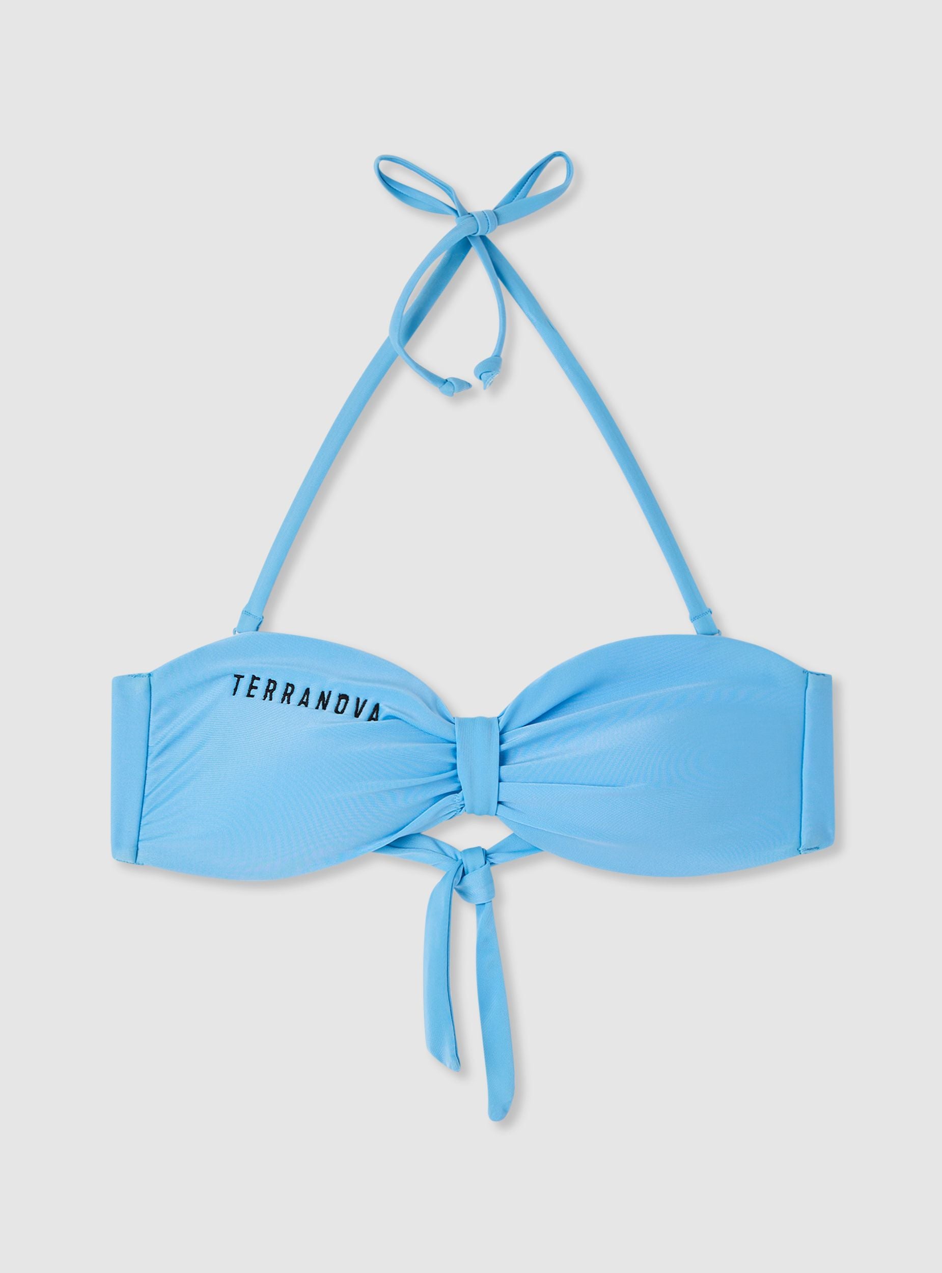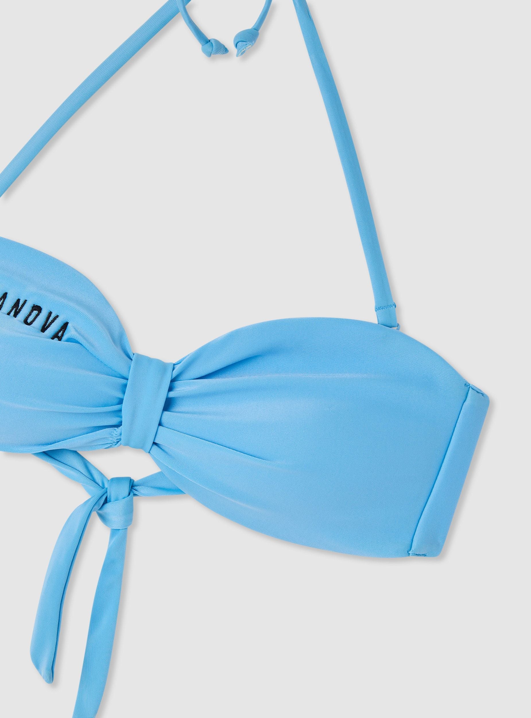 Reggiseno bikini da donna a fascia, in tinta unita, con spalline rimovibili da annodare al collo e chiusura con fiocco che crea un elegante nodo centrale. Coppe sagomate per una vestibilità stabile e confortevole. Logo con scritta ricamata sul lato. Perfetto per il beachwear, si abbina facilmente a slip coordinati o a fantasia per creare mix & match personalizzati.Dettagli