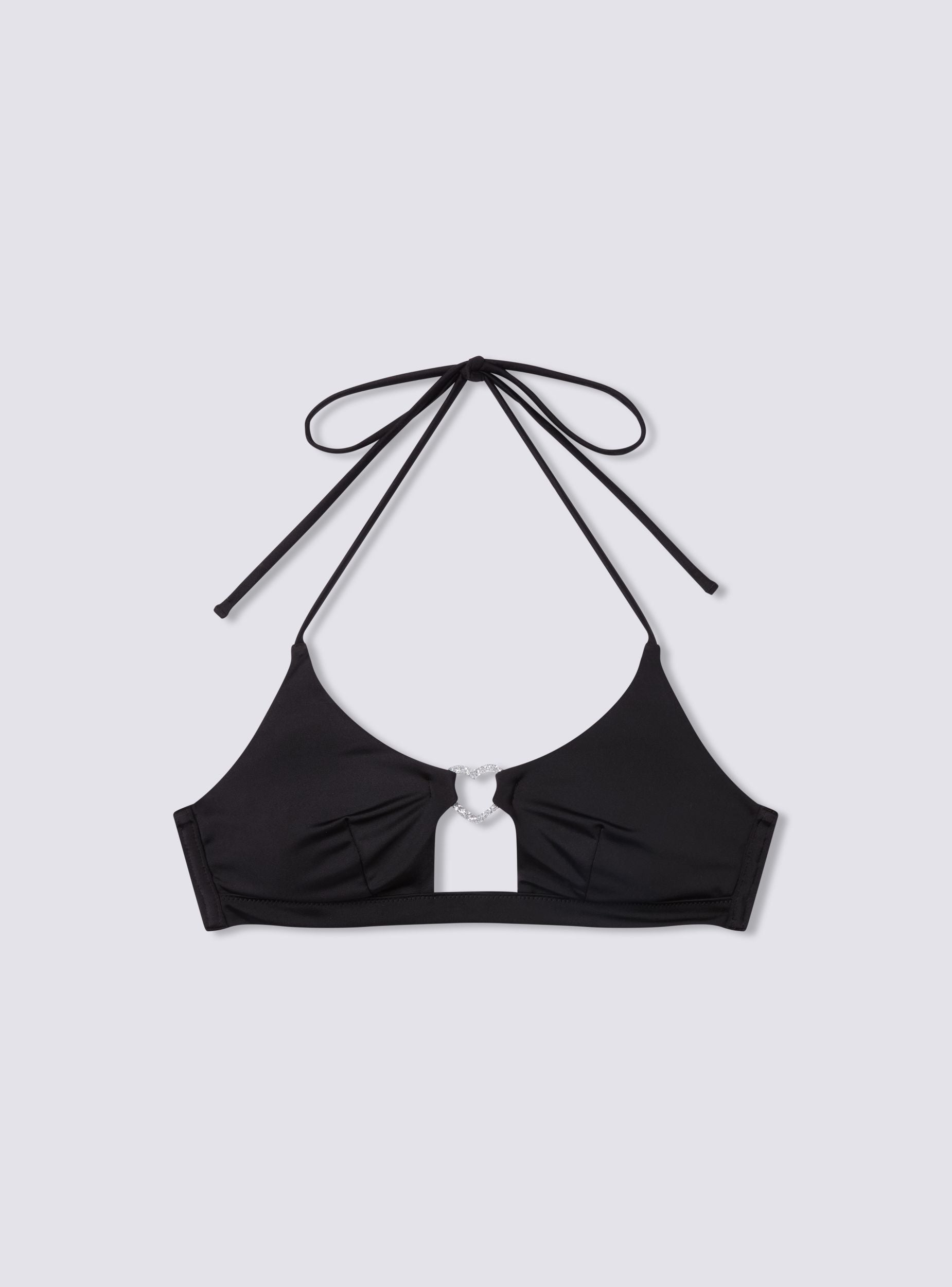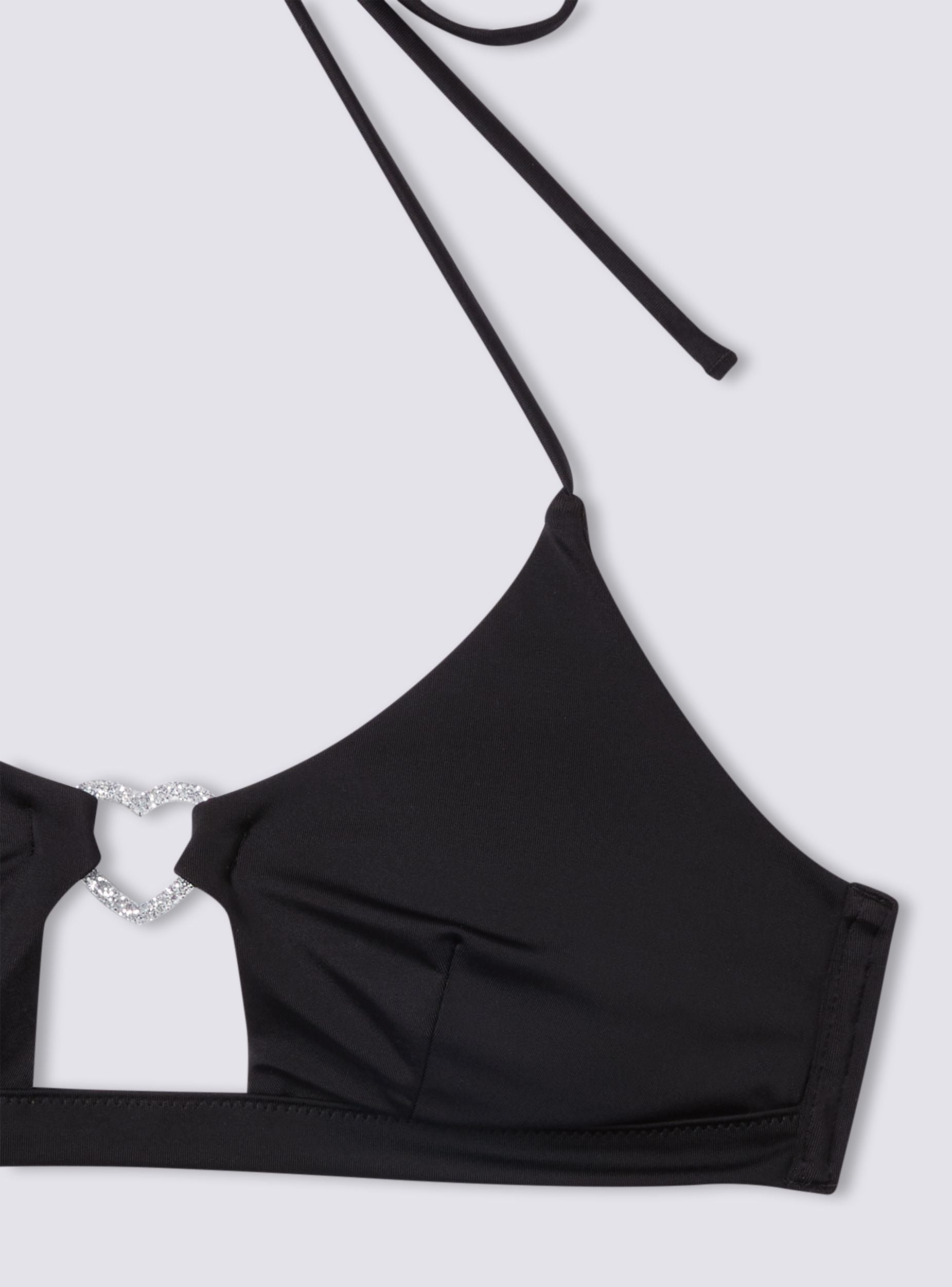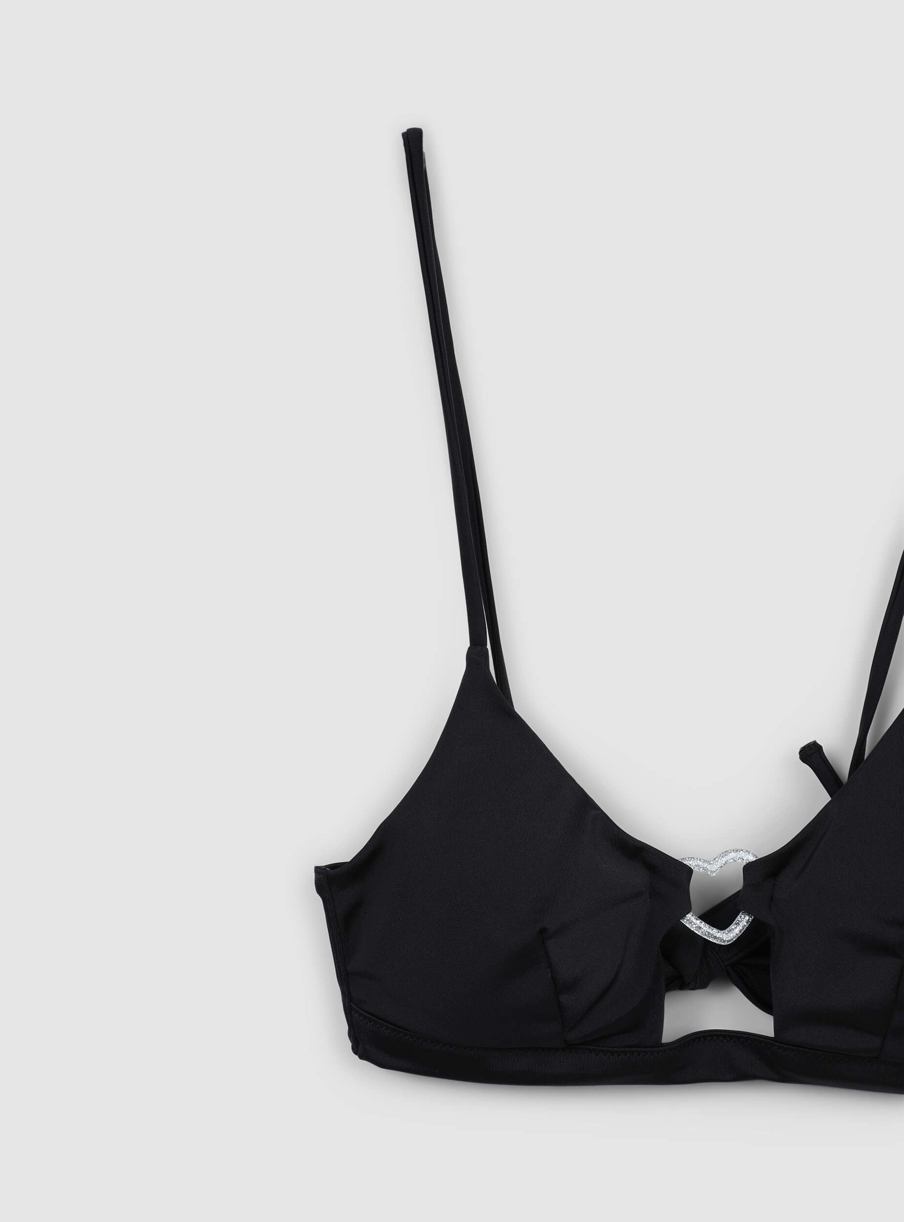 Reggiseno bikini da donna con coppe triangolari e spalline sottili, pensato per valorizzare la silhouette con un tocco femminile ed elegante. Il dettaglio decorativo a forma di cuore al centro del décolleté aggiunge un elemento luminoso e romantico, rendendolo ideale per chi cerca un look raffinato anche in spiaggia o in piscina. Perfetto da abbinare a slip coordinati o mix & match, si adatta a diverse occasioni, dalle giornate al mare ai pool party più chic.Dettagli