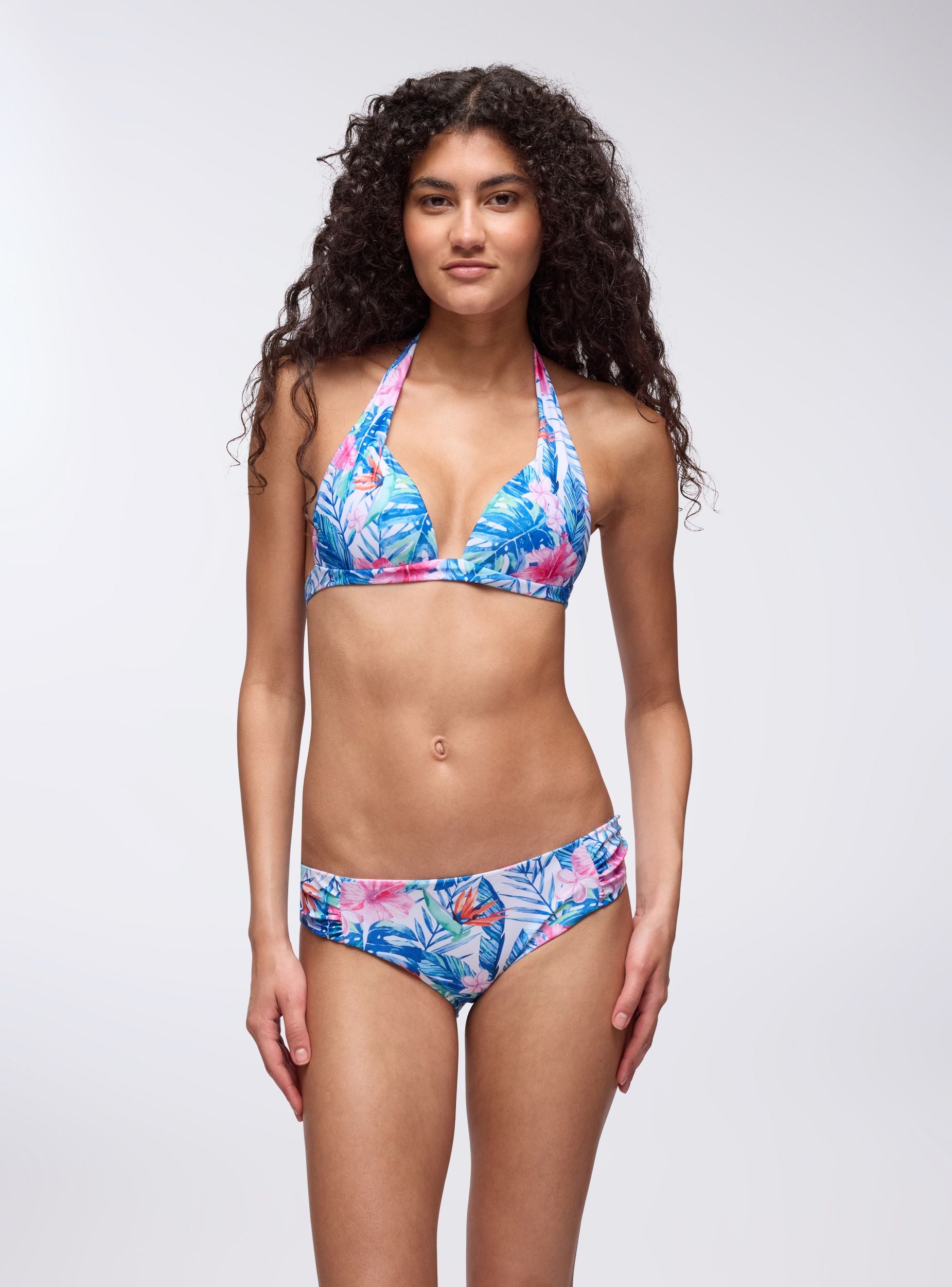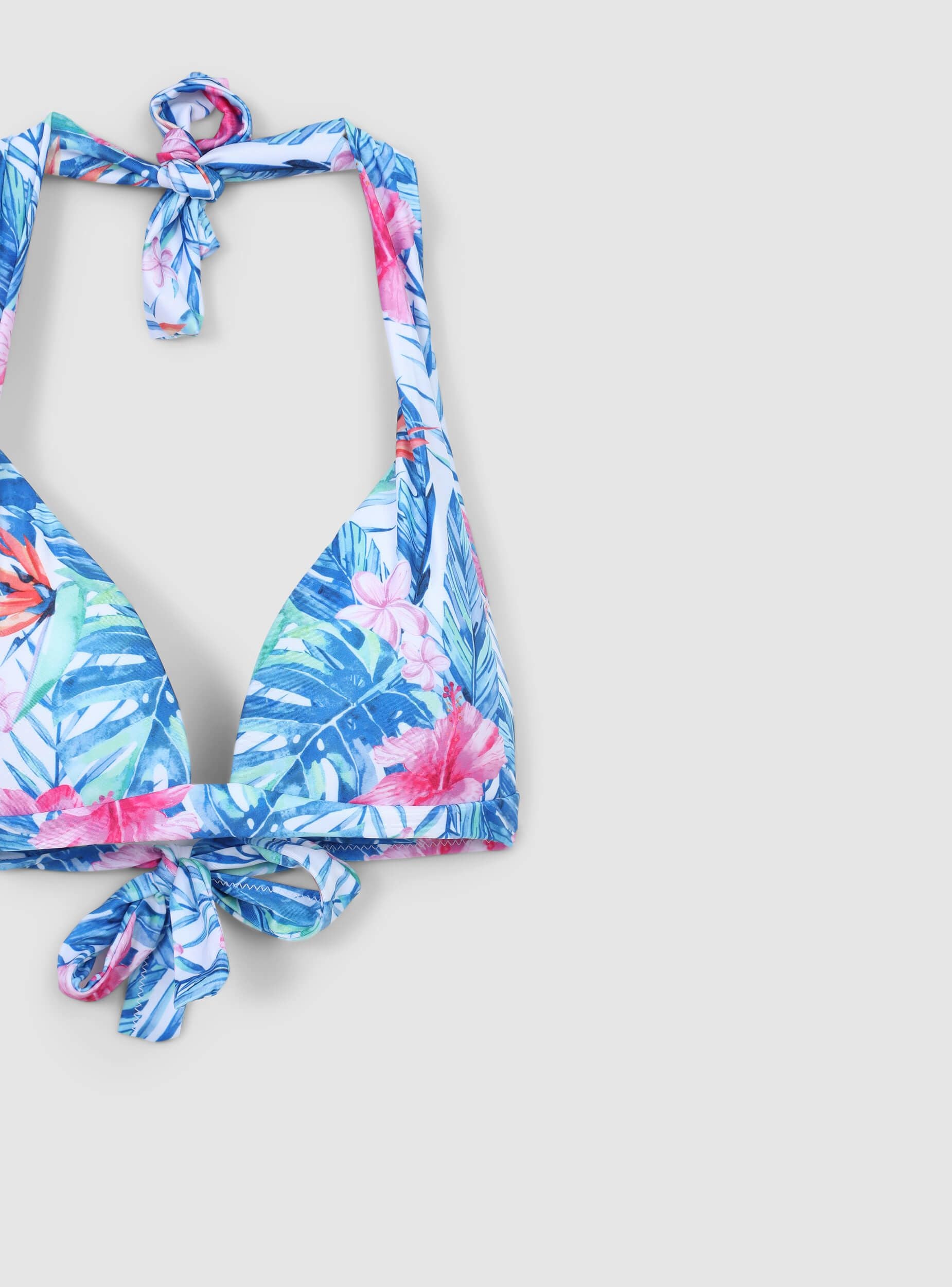 Reggiseno bikini da donna ideale per una giornata al mare o in piscina. Caratterizzato da una vestibilità regolare e un design rigido a triangolo, presenta una stampa tropicale vivace e colorata. Perfetto per chi cerca stile e comfort durante le giornate estive.Dettagli