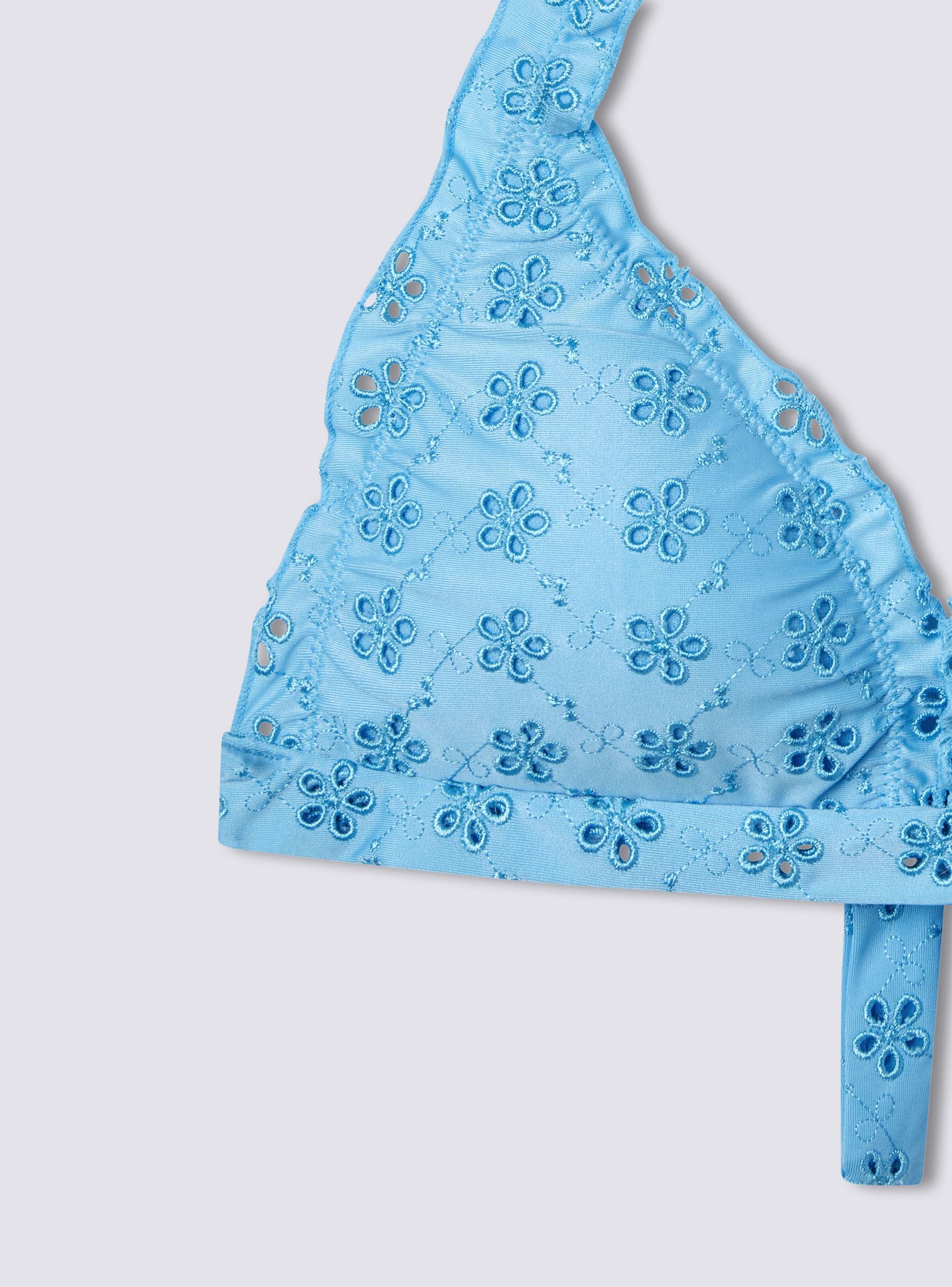 Reggiseno bikini da donna a triangolo rigido, caratterizzato da una raffinata lavorazione sangallo e tinta unita per un look romantico e femminile. Perfetto per le giornate al mare o in piscina, offre un sostegno ideale e una vestibilità comoda grazie alla chiusura regolabile. Da abbinare a slip coordinati o mixare con modelli a contrasto per uno stile personalizzato e trendy.Dettagli