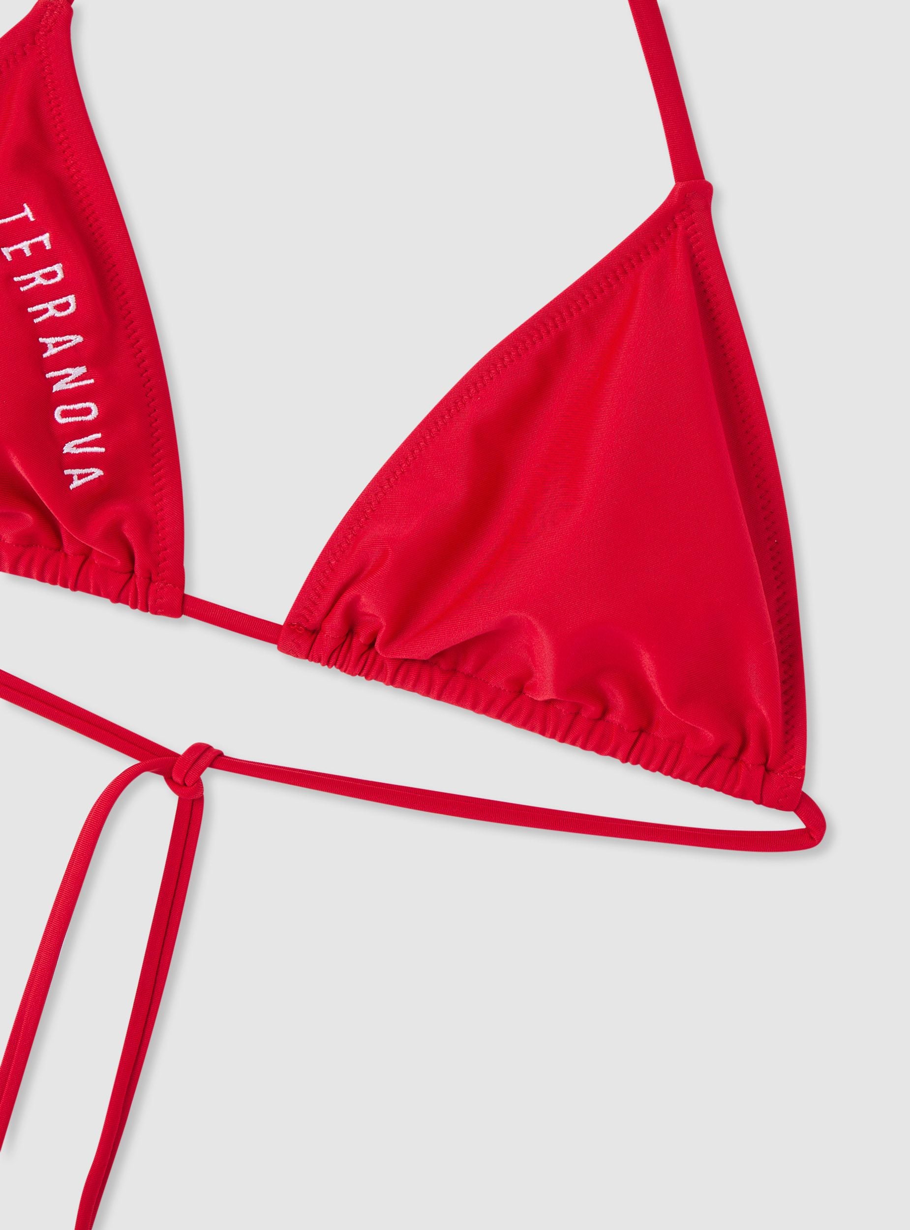 Reggiseno bikini da donna a triangolo tinta unita con scritta sul davanti, ideale per mare e piscina. I laccetti regolabili da annodare dietro al collo e sulla schiena permettono una vestibilità personalizzata e valorizzano il décolleté. Perfetto da abbinare a slip coordinati o mix and match e a un pareo per un look da spiaggia curato.Dettagli