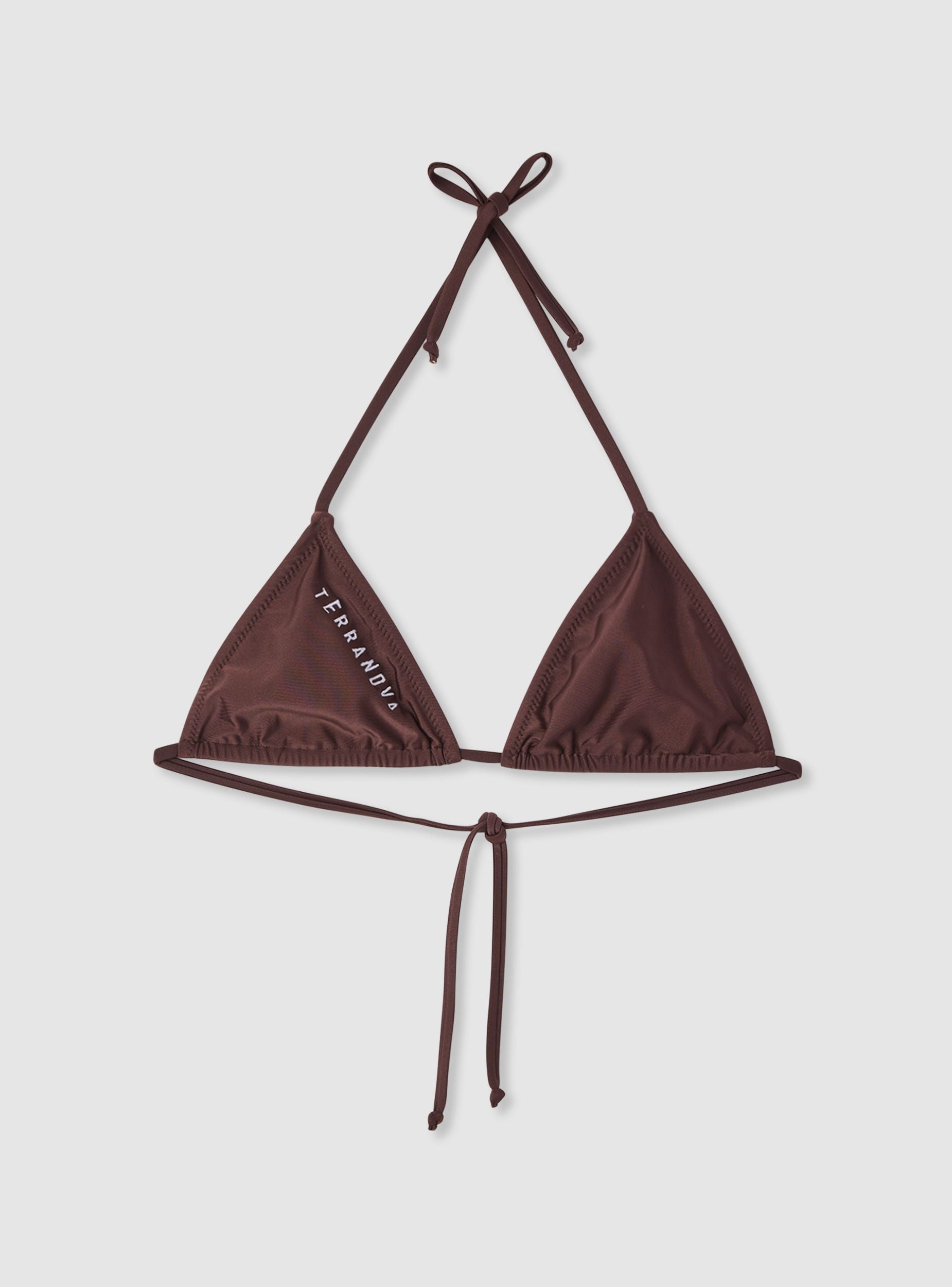 Reggiseno bikini da donna a triangolo tinta unita con scritta sul davanti, ideale per mare e piscina. I laccetti regolabili da annodare dietro al collo e sulla schiena permettono una vestibilità personalizzata e valorizzano il décolleté. Perfetto da abbinare a slip coordinati o mix and match e a un pareo per un look da spiaggia curato.Dettagli