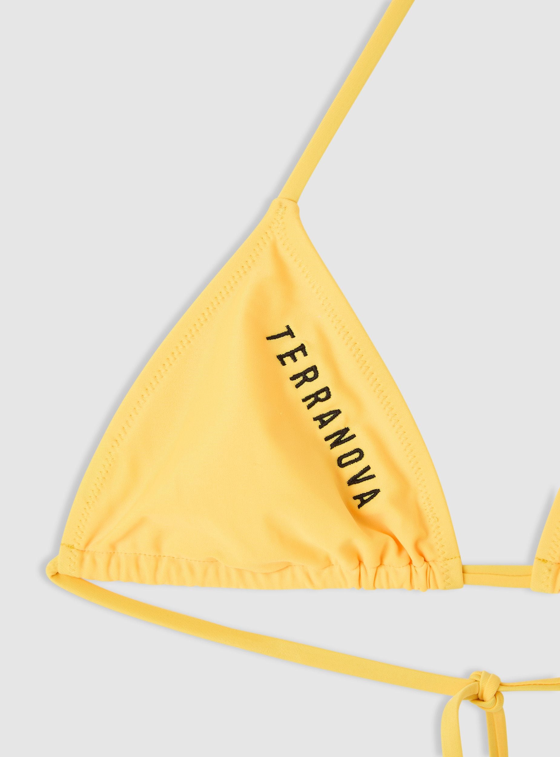 Reggiseno bikini da donna con coppe triangolo scorrevoli e lacci da annodare al collo e sul retro. Design a tinta unita con scritta laterale. Ideale per la spiaggia, si abbina facilmente a slip coordinati o a fantasie a contrasto. Vestibilità regolabile grazie ai laccetti sottili.Dettagli