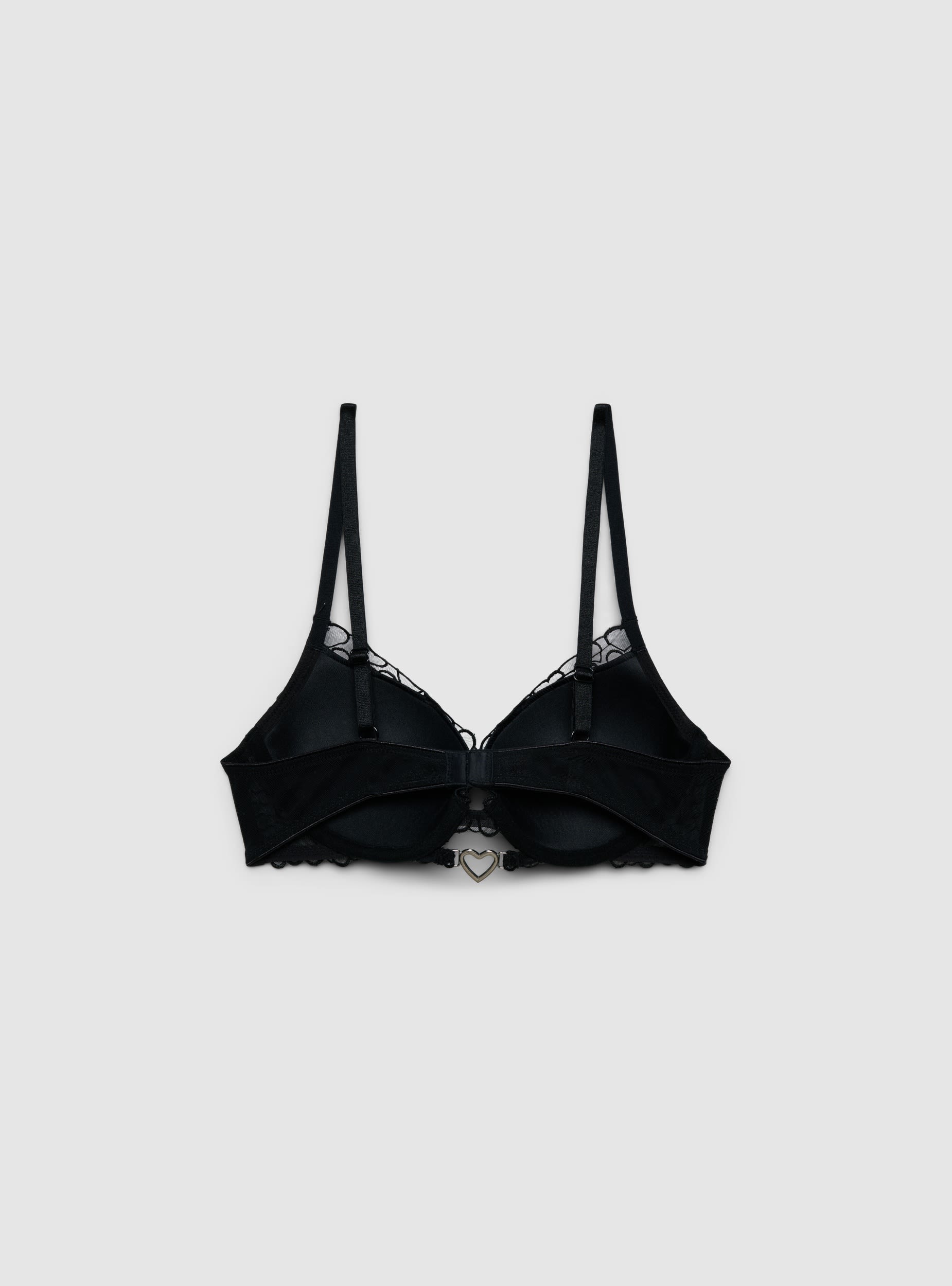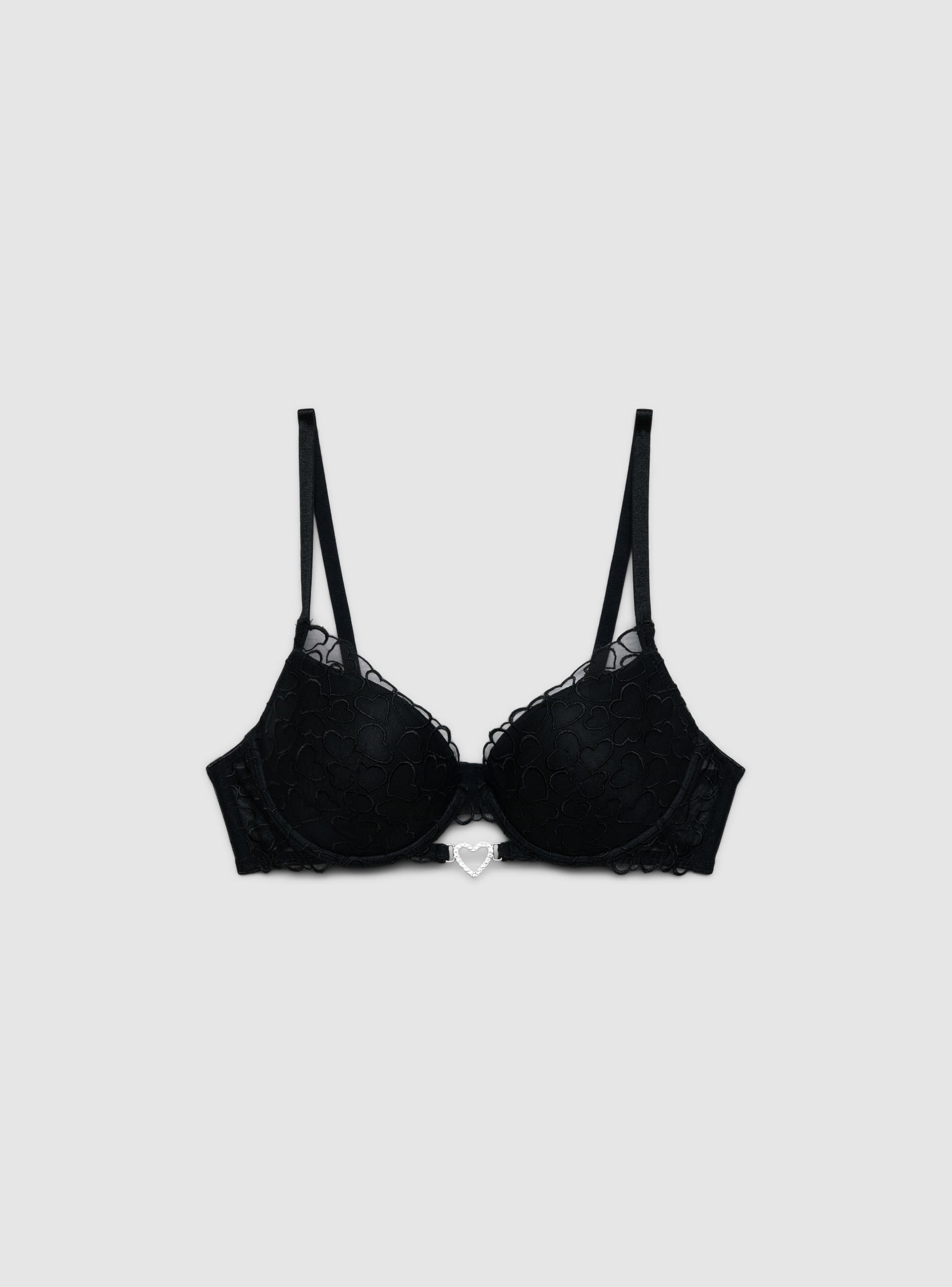 Reggiseno da donna push-up con coppe imbottite e ferretto, fantasia con cuori ricamati e dettaglio pendente a cuore con strass al centro. Spalline regolabili e chiusura posteriore con gancetto, bordi con delicati inserti in pizzo. Perfetto sotto top scollati o camicie, valorizza il décolleté offrendo sostegno e una vestibilità confortevole.Dettagli