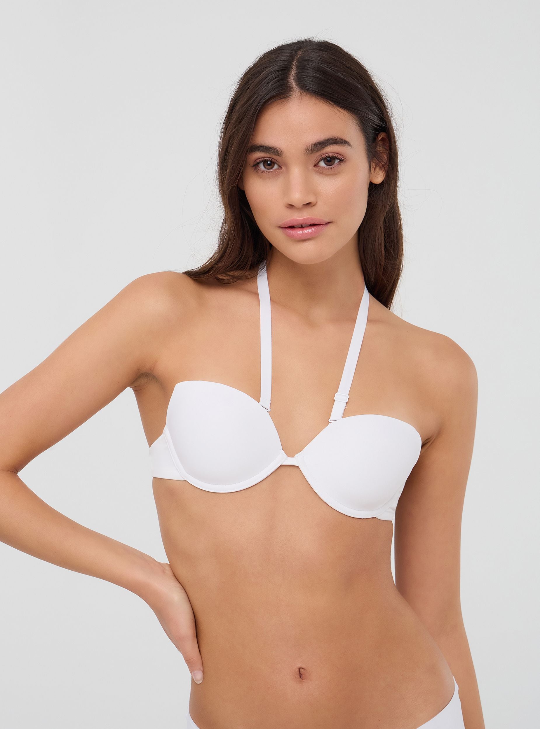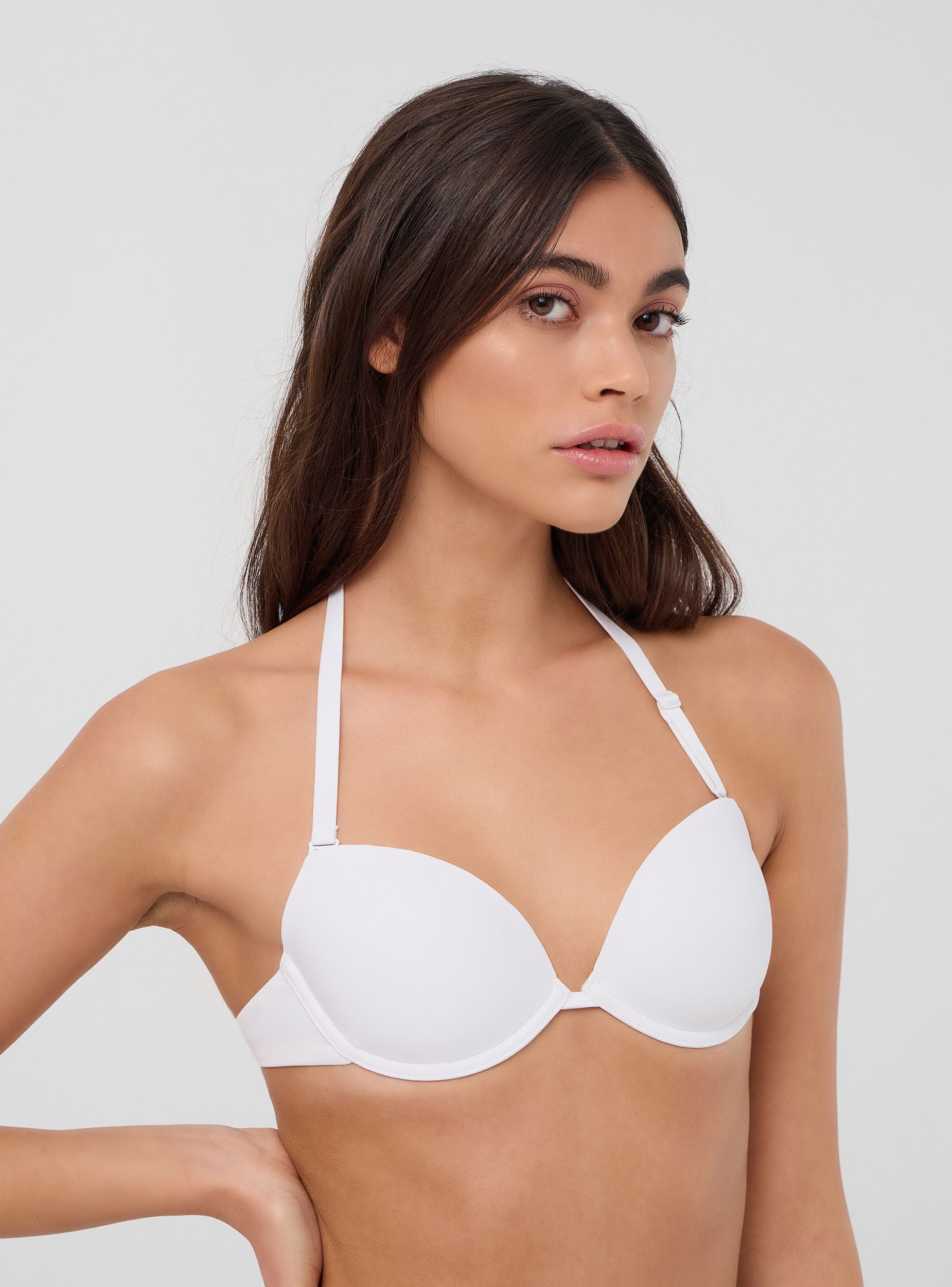 Reggiseno da donna in tinta unita con coppe preformate che garantiscono sostegno e modellano delicatamente il décolleté. Le spalline multiway offrono versatilità, permettendo di indossarlo in diversi modi, tra cui allacciato dietro al collo o incrociato sulla schiena, adattandosi a ogni esigenza di stile. Perfetto per look versatili e multifunzionali.Dettagli