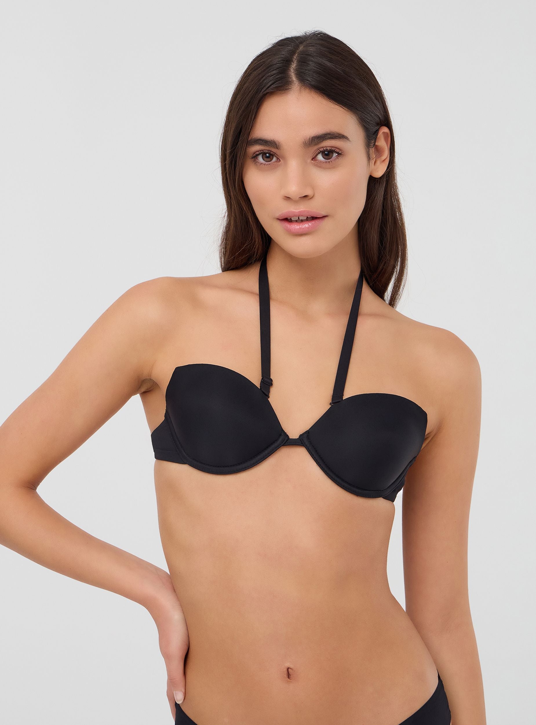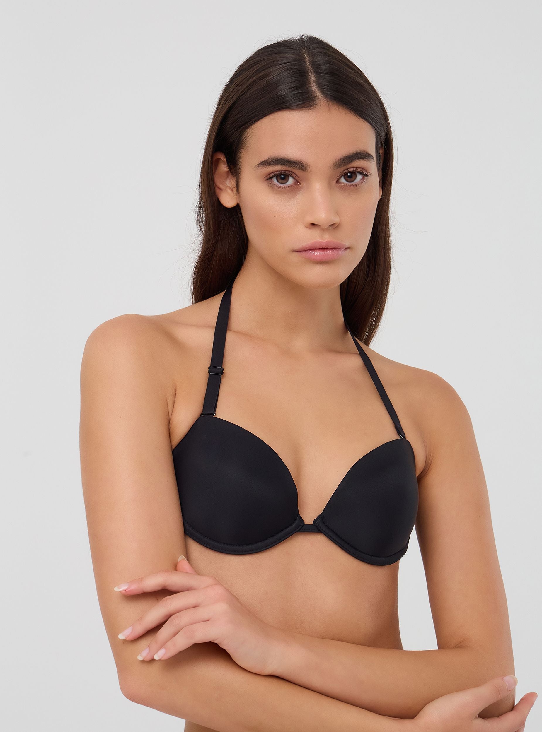 Reggiseno da donna in tinta unita con coppe preformate che garantiscono sostegno e modellano delicatamente il décolleté. Le spalline multiway offrono versatilità, permettendo di indossarlo in diversi modi, tra cui allacciato dietro al collo o incrociato sulla schiena, adattandosi a ogni esigenza di stile. Perfetto per look versatili e multifunzionali.Dettagli