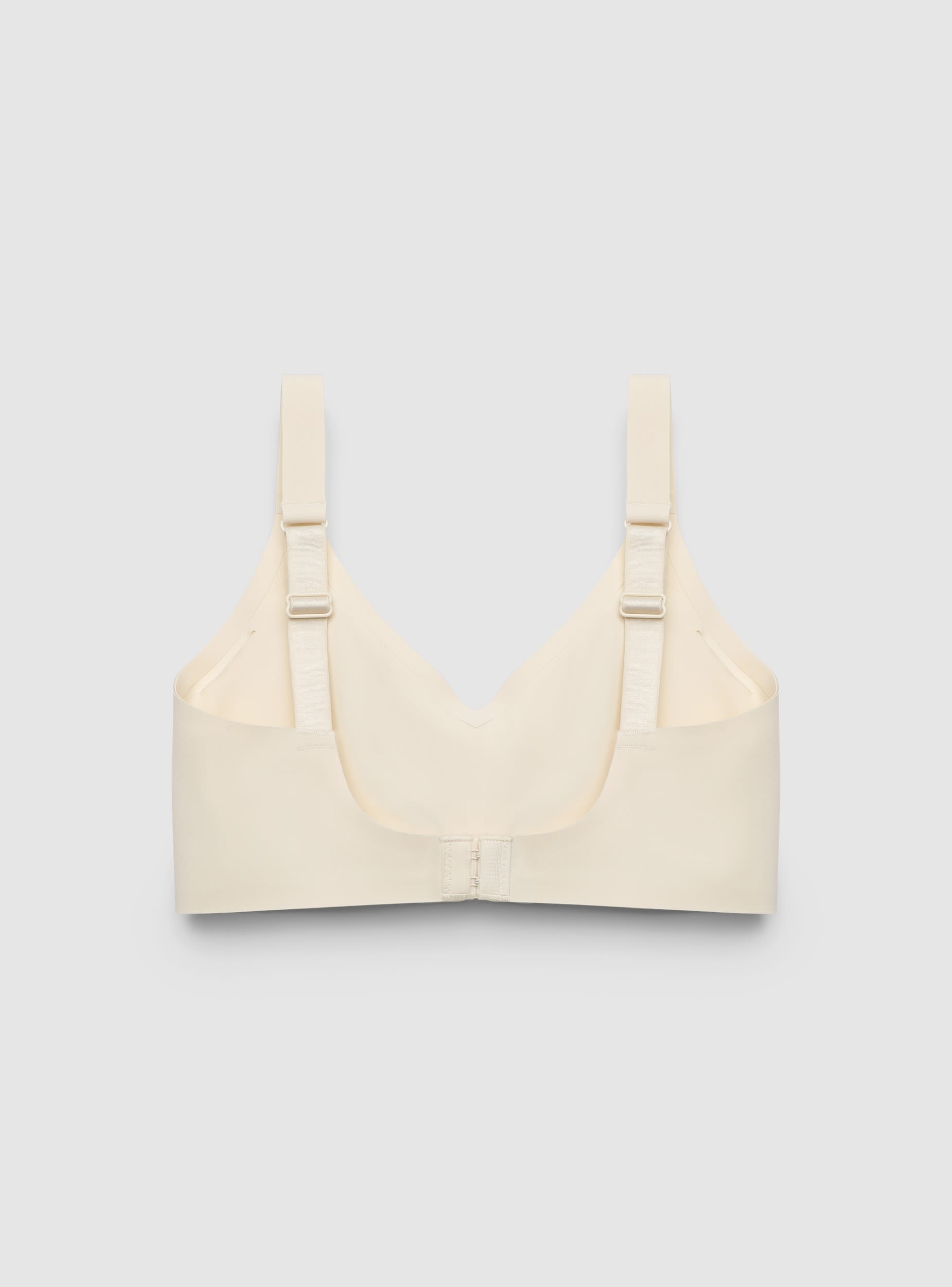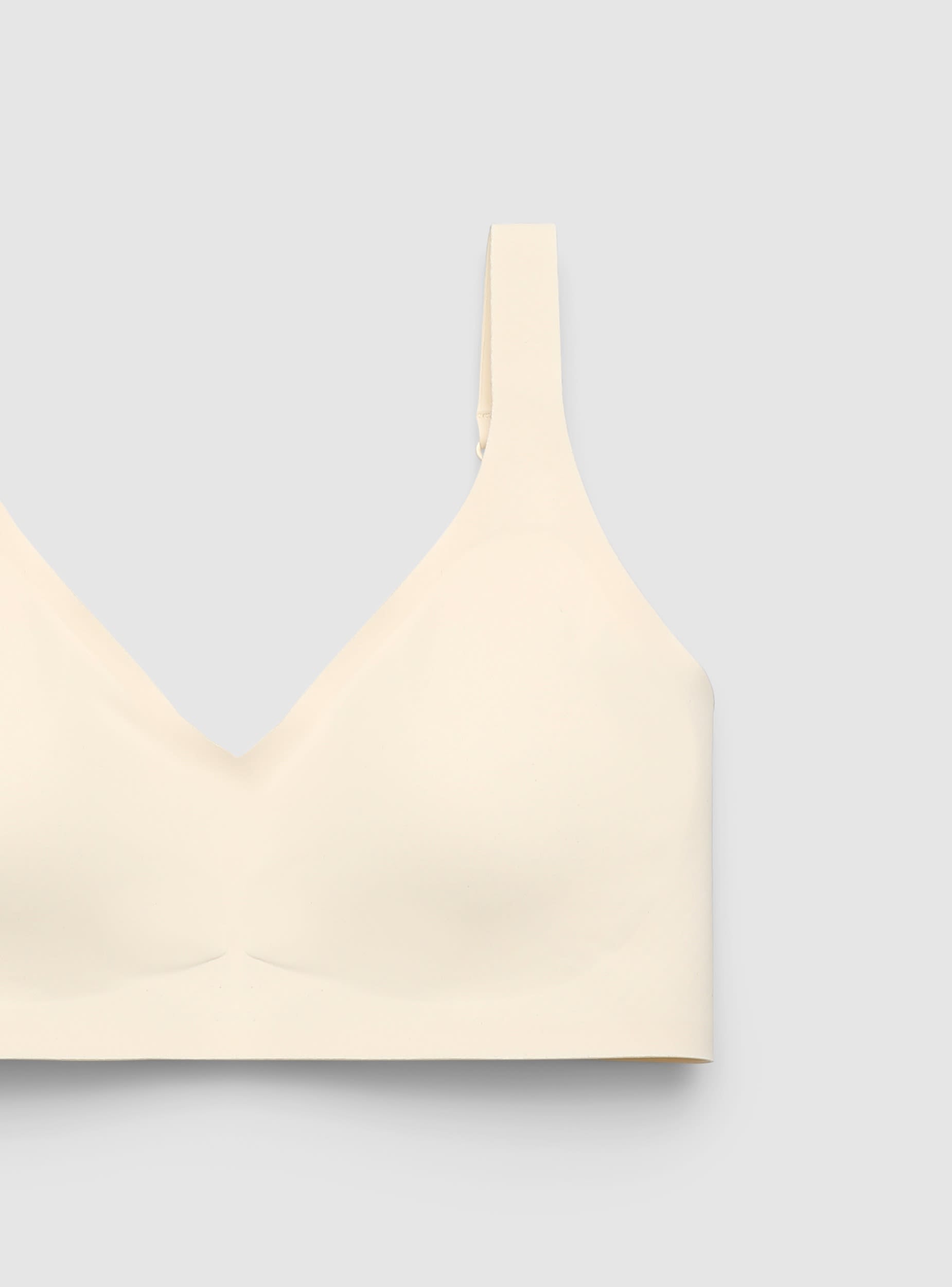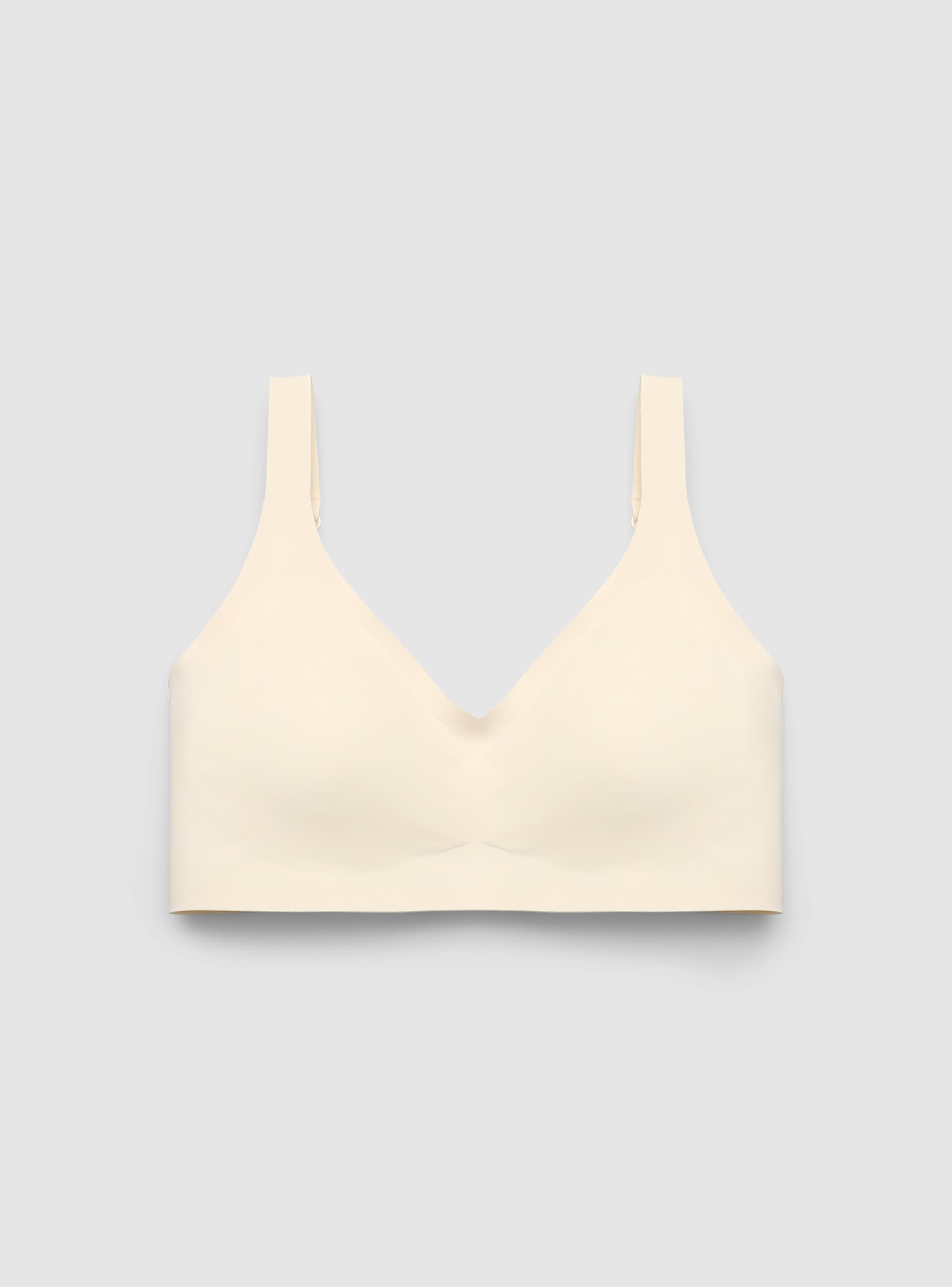 Reggiseno da donna a tinta unita senza ferretto e scollo a V. Spalline regolabili e chiusura posteriore con gancetti assicurano sostegno e comfort. Taglio vivo e finitura liscia per risultare invisibile sotto i vestiti, ideale per l’uso quotidiano o sotto capi aderenti. Vestibilità confortevole che segue le forme, perfetto con camicie, magliette e abiti per un look pulito e discreto.Dettagli