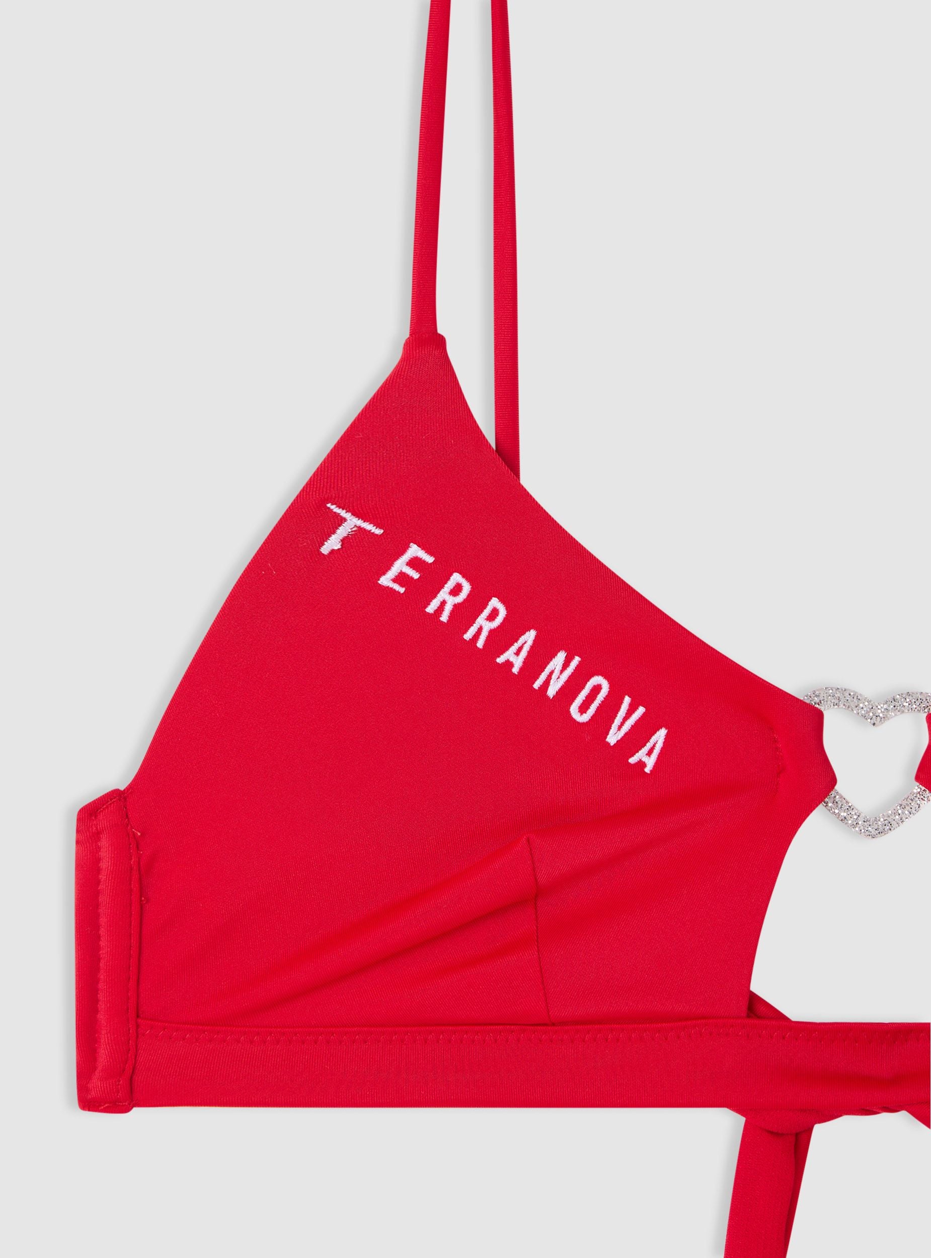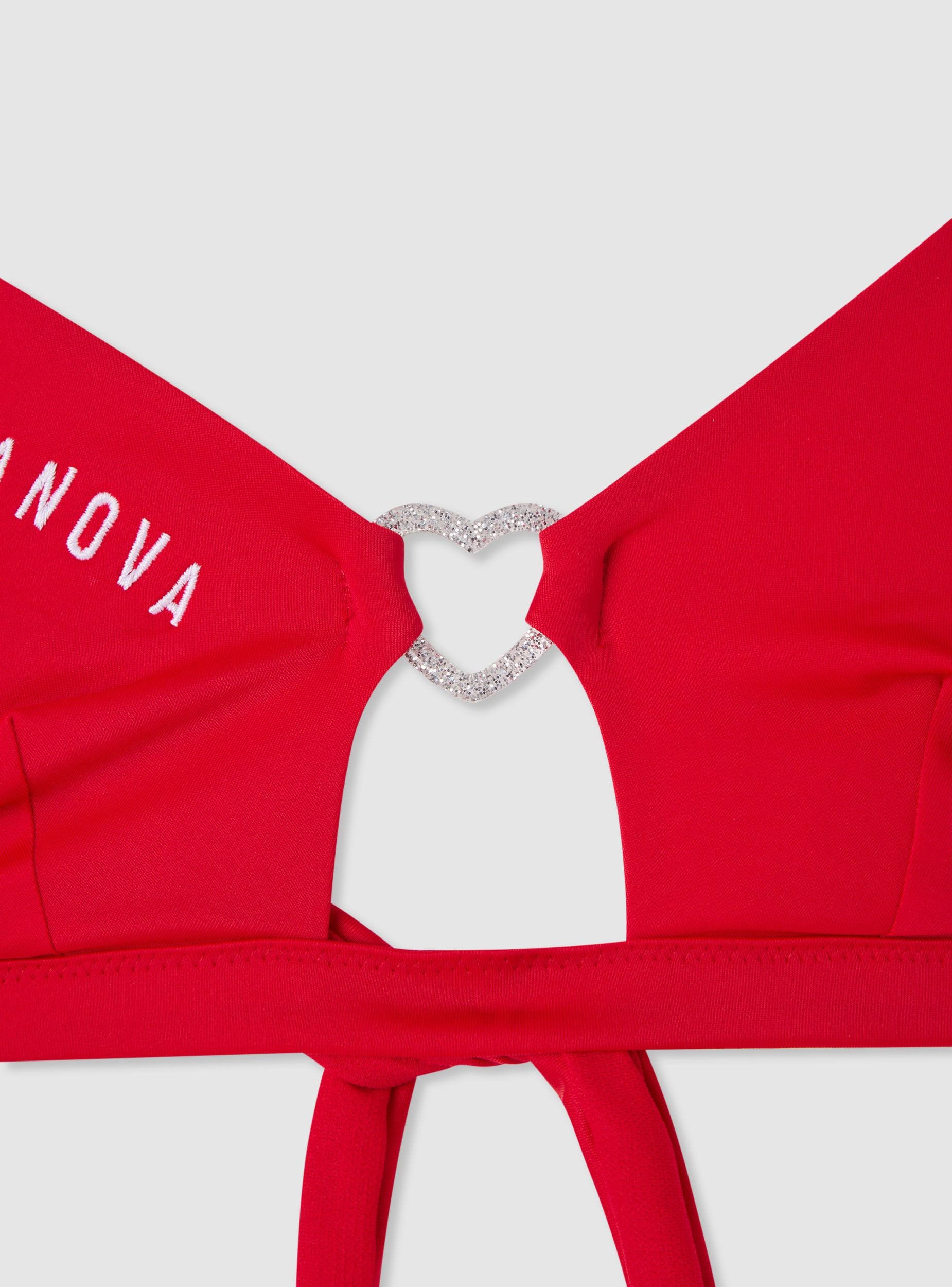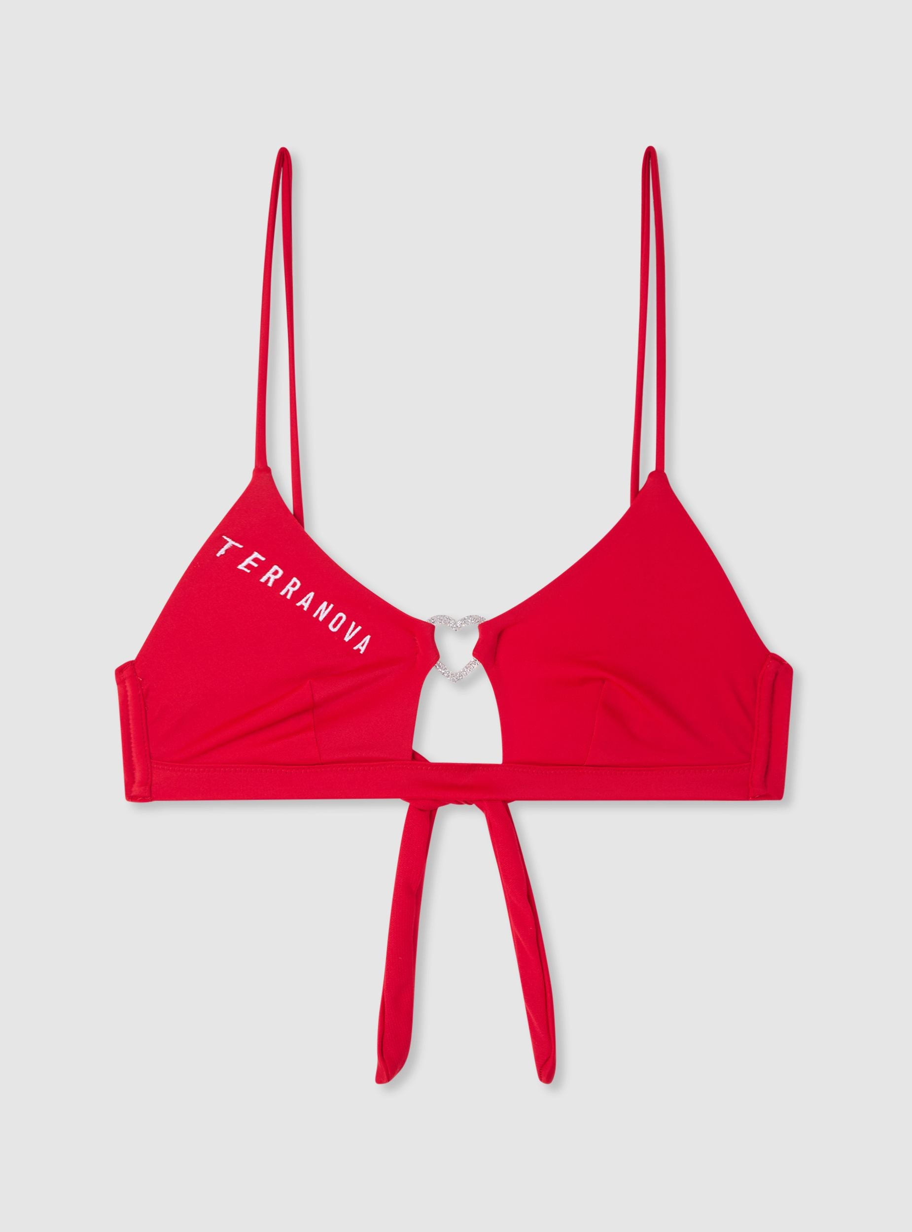 Reggiseno bikini da donna a tinta unita con spalline sottili e dettaglio centrale a cuore con effetto luccicante. Modello a triangolo con piccolo cut-out frontale e scritta ricamata con logo. Ideale per la spiaggia o la piscina, si abbina facilmente a slip coordinati o a fantasia per creare look estivi versatili.Dettagli