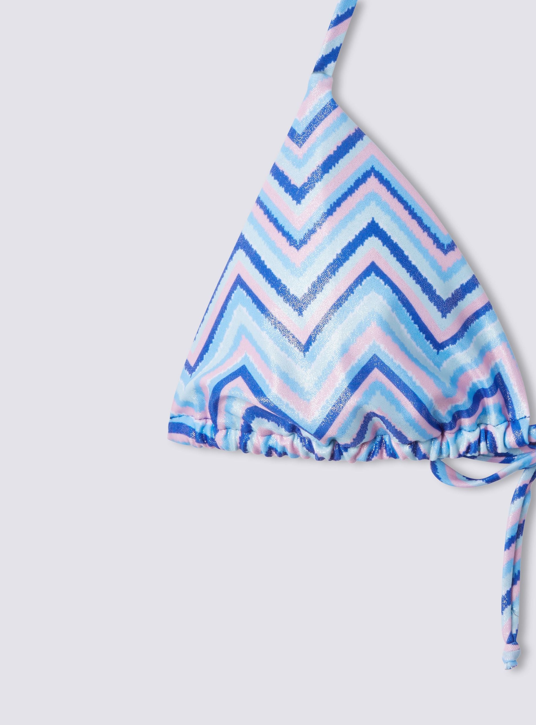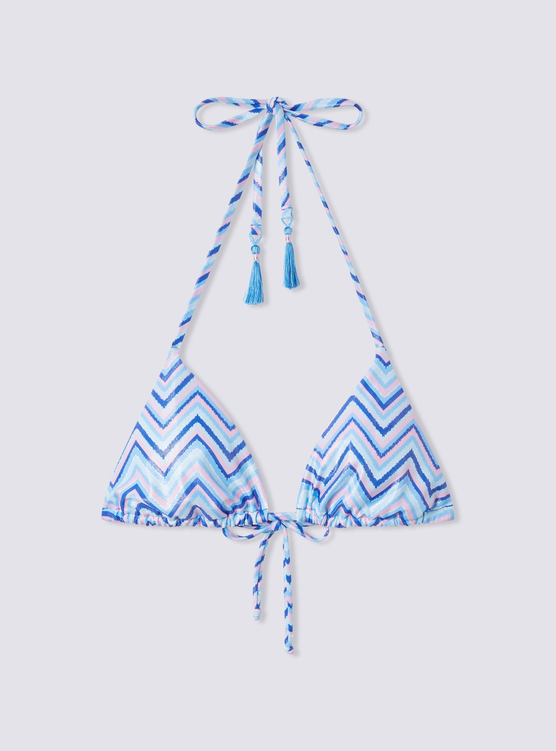Reggiseno bikini da donna a triangolo con fantasia chevron ed effetto luccicante, perfetto per chi ama distinguersi in spiaggia. Le coppe rimovibili offrono comfort e supporto personalizzabile, mentre le nappe decorative sui laccetti aggiungono un tocco boho-chic. Ideale per un look estivo vivace, da abbinare a slip coordinati o a un pareo leggero per un outfit da spiaggia raffinato e di tendenza.Dettagli