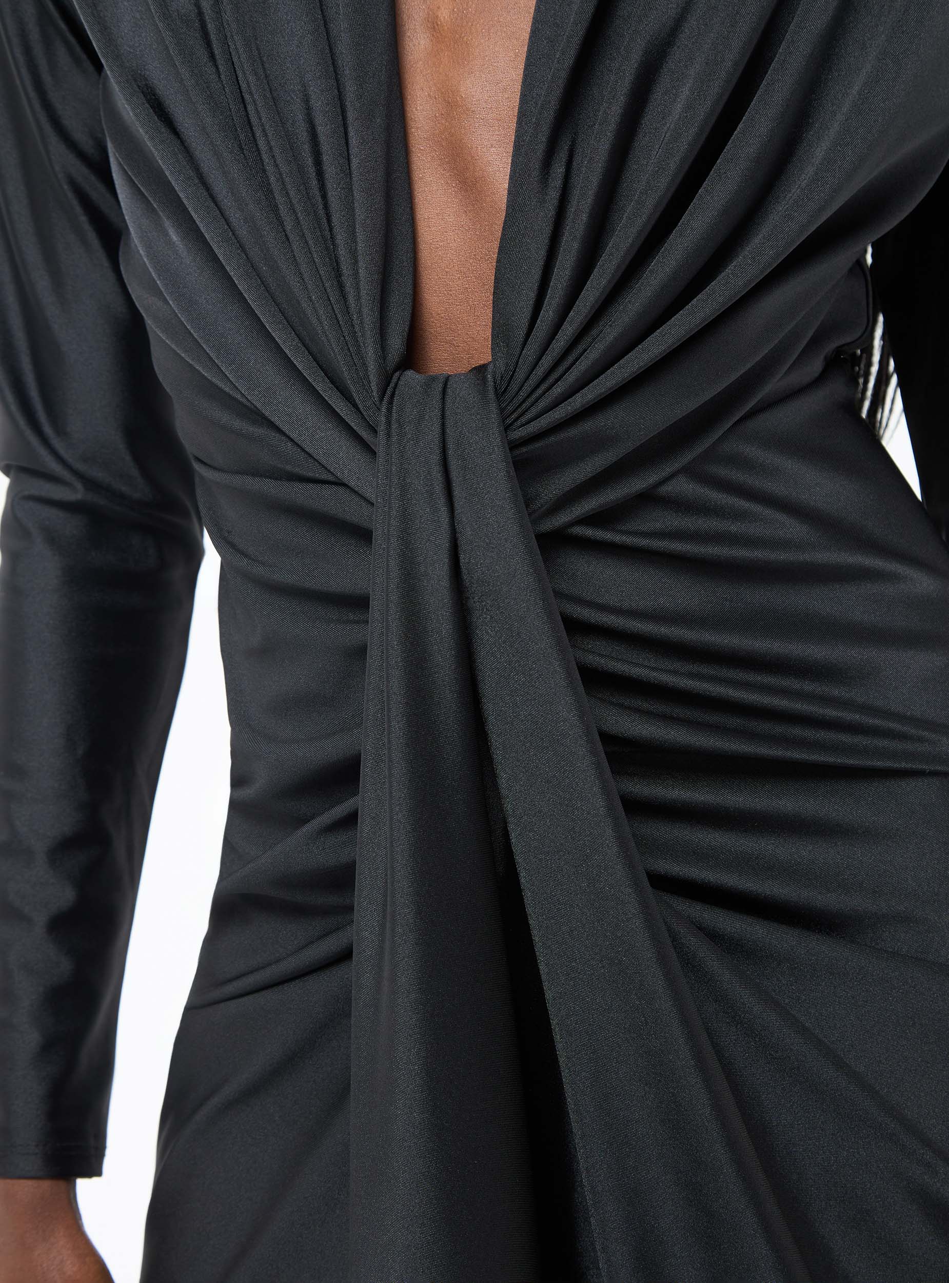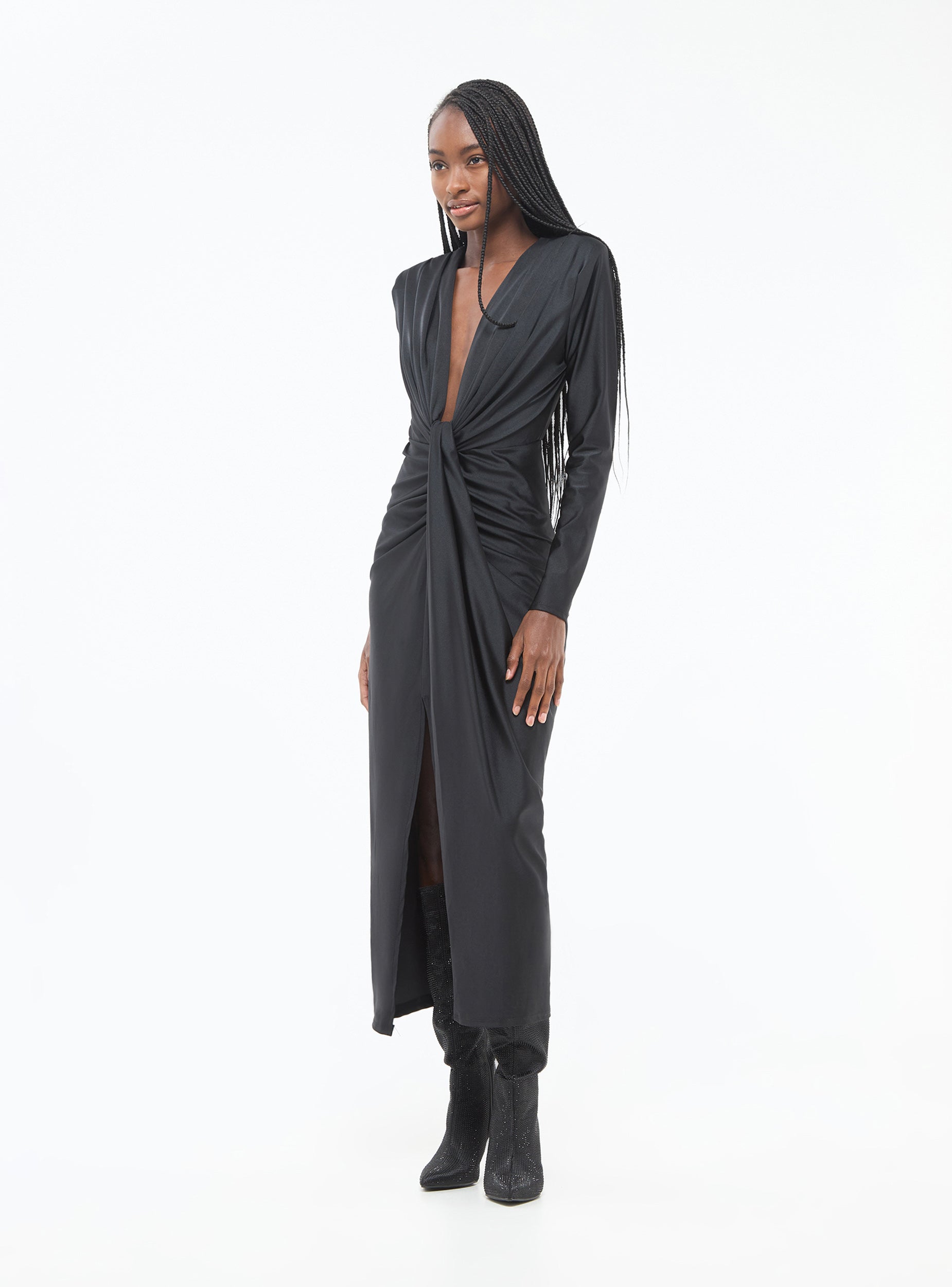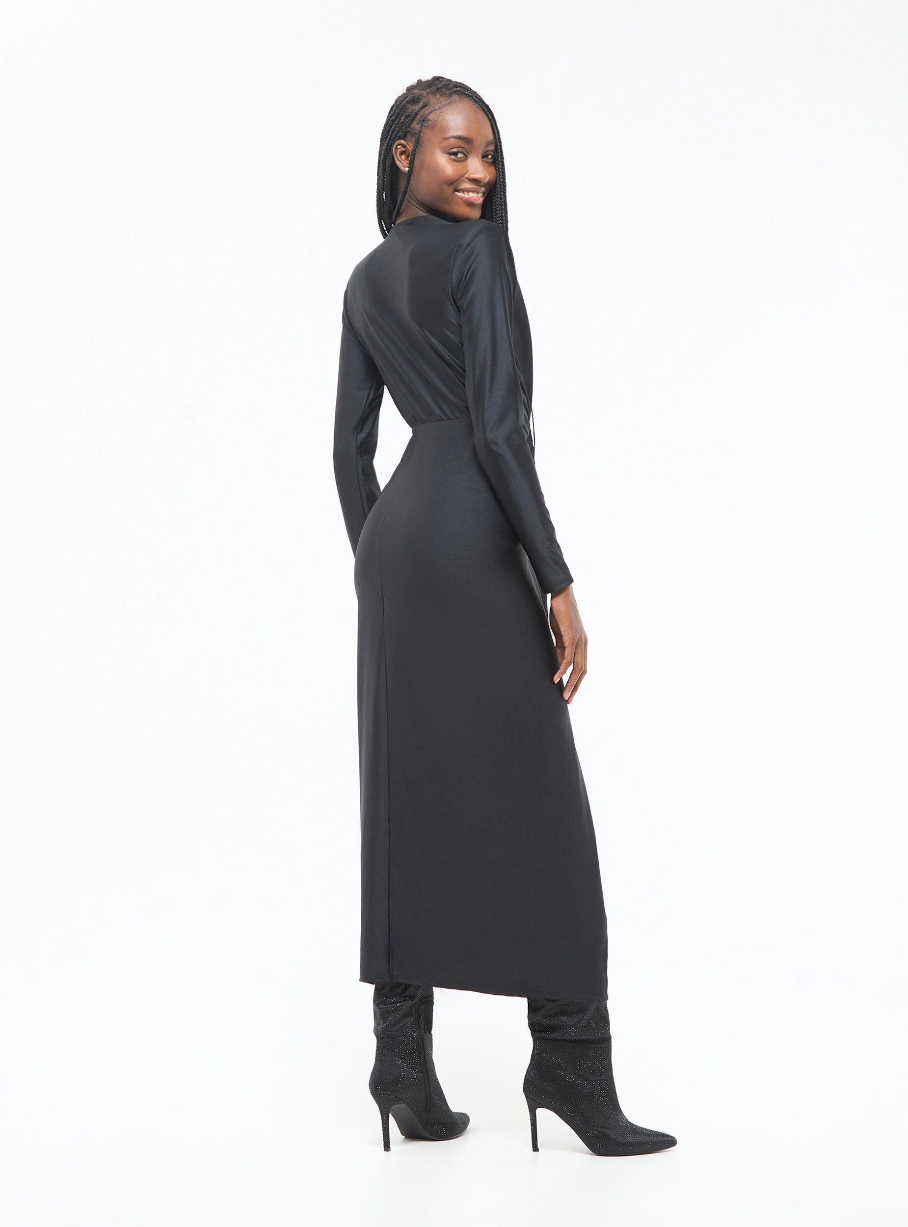 Vestito da donna in tessuto elasticizzato tinta unita , modello a colonna con maniche lunghe , scollatura profonda e spacco frontale