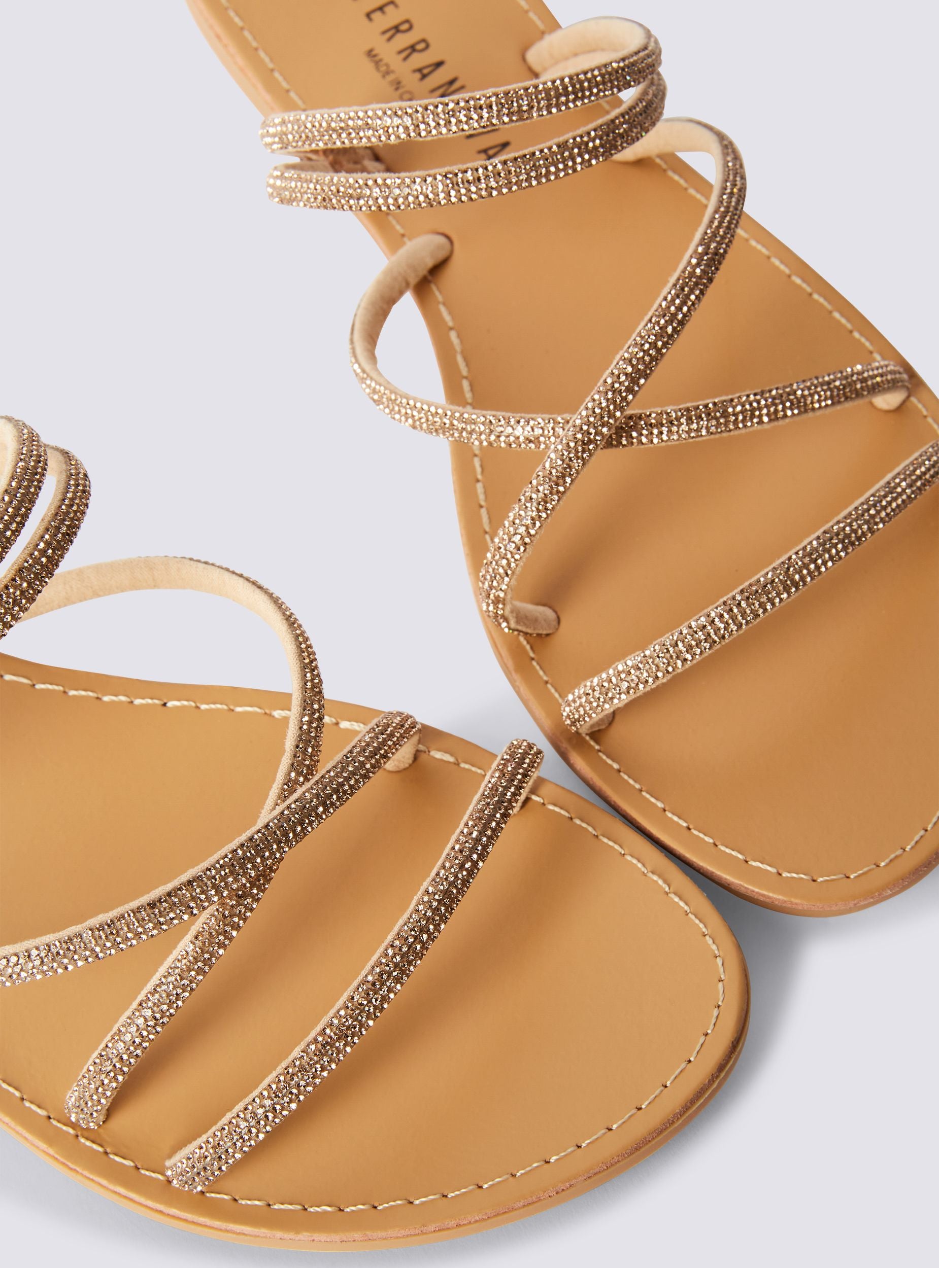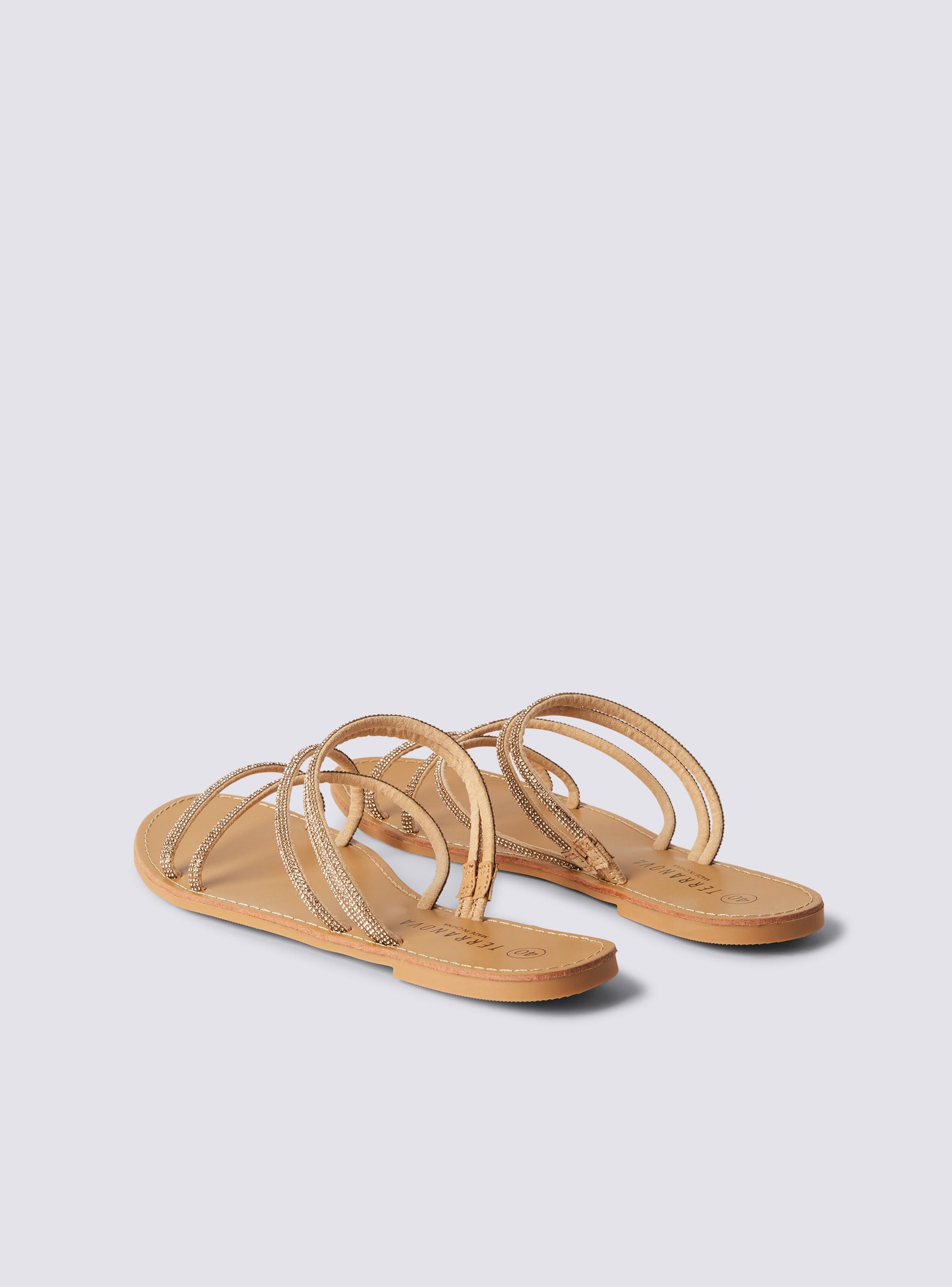 Sandali da donna eleganti e versatili, perfetti per completare look estivi con un tocco di luminosità. Il design flat assicura comfort e praticità, ideale per lunghe passeggiate, eventi all'aperto o serate rilassate. Le sottili fasce impreziosite da strass donano un effetto brillante e raffinato, valorizzando il piede con grazia. Un modello essenziale ma ricercato, pensato per chi ama lo stile senza rinunciare alla comodità.Dettagli