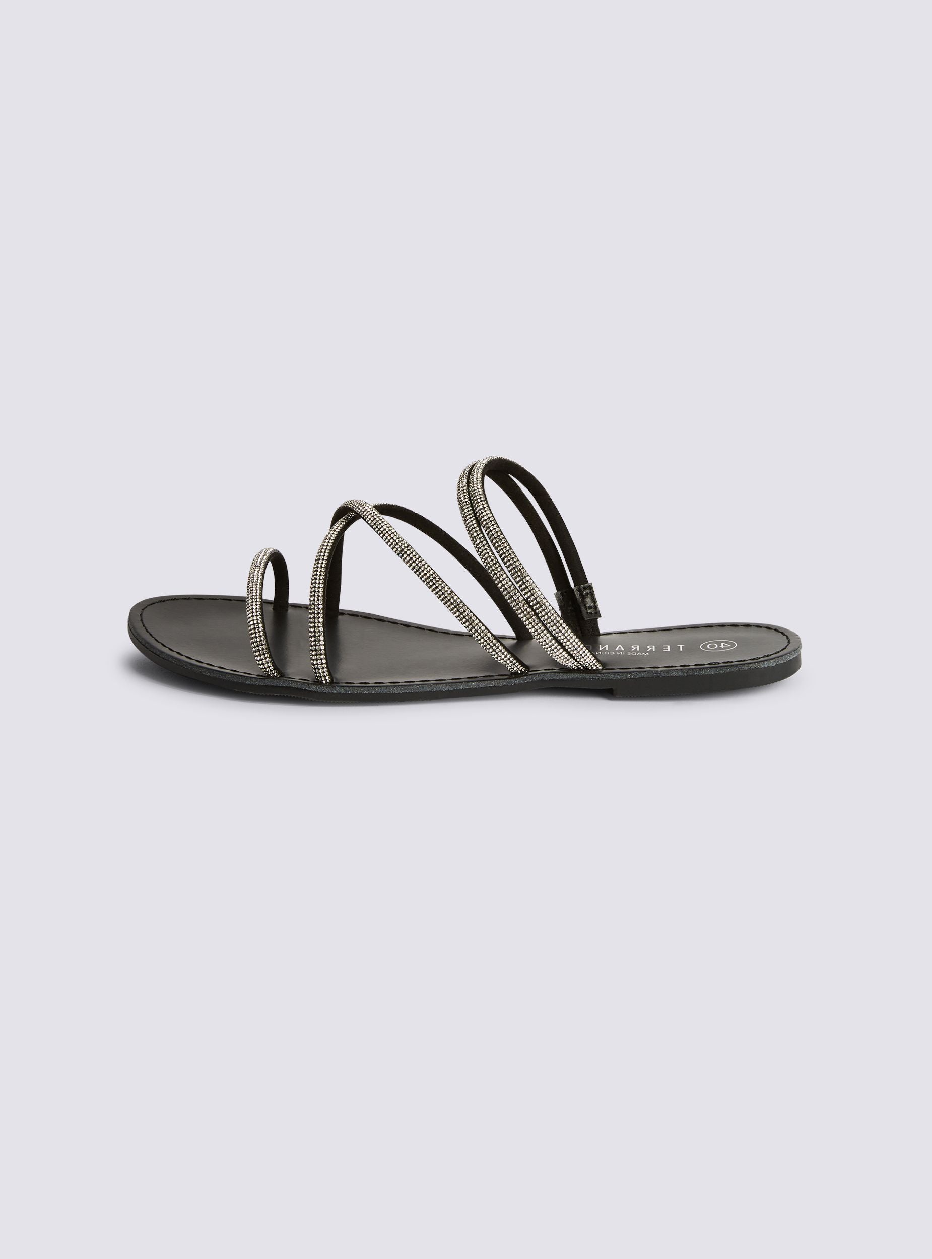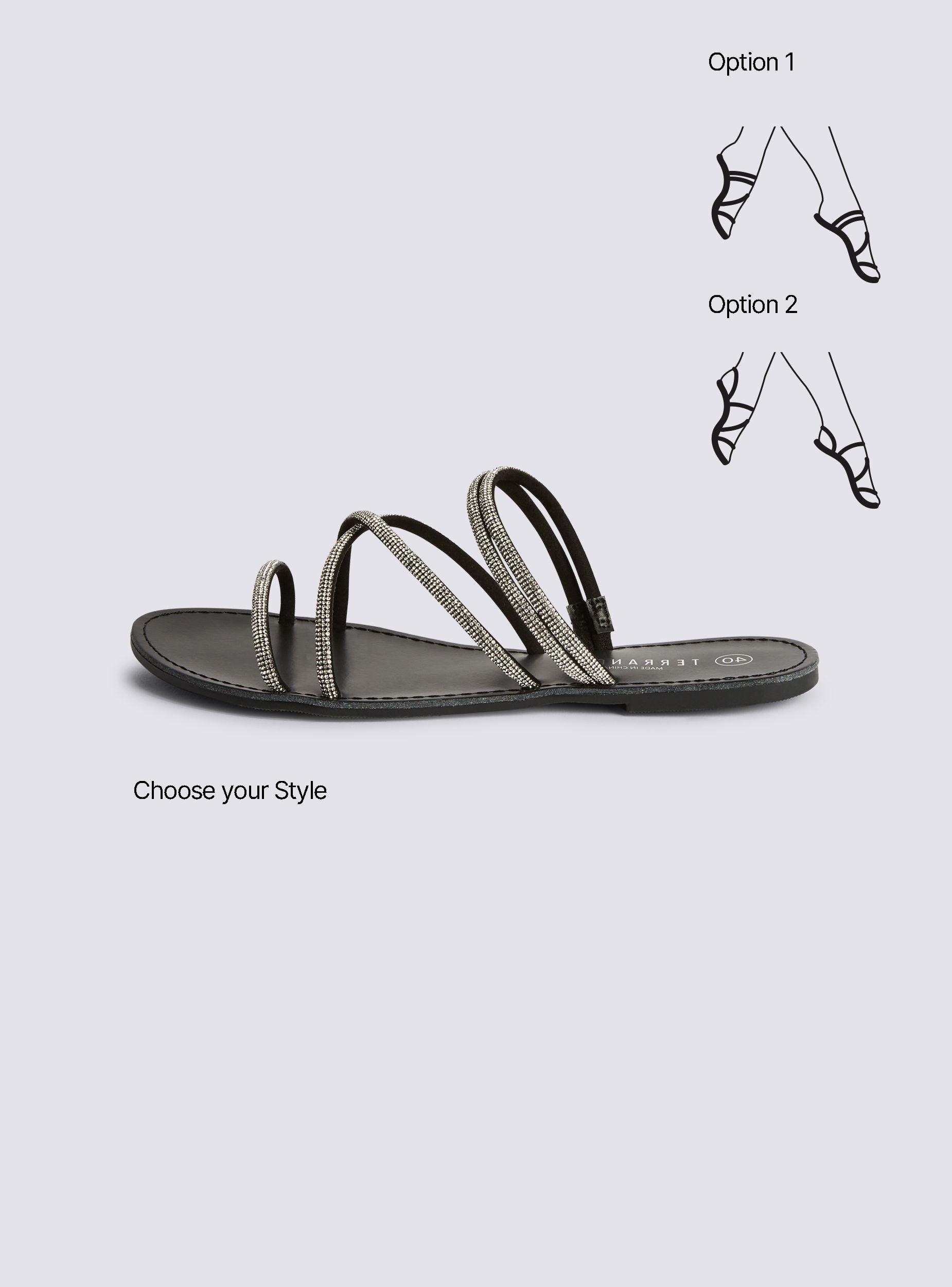 Sandali da donna eleganti e versatili, perfetti per completare look estivi con un tocco di luminosità. Il design flat assicura comfort e praticità, ideale per lunghe passeggiate, eventi all'aperto o serate rilassate. Le sottili fasce impreziosite da strass donano un effetto brillante e raffinato, valorizzando il piede con grazia. Un modello essenziale ma ricercato, pensato per chi ama lo stile senza rinunciare alla comodità.Dettagli