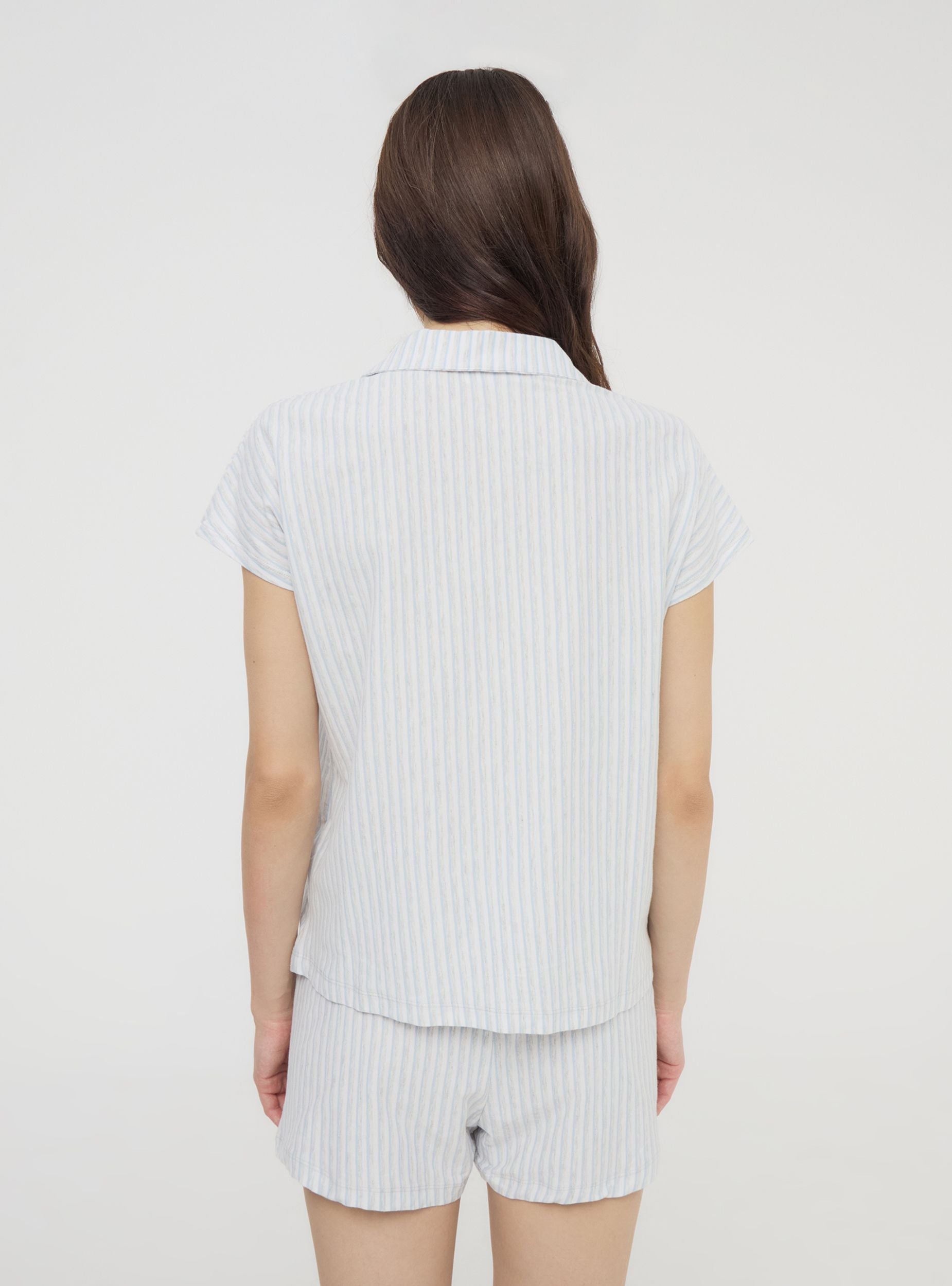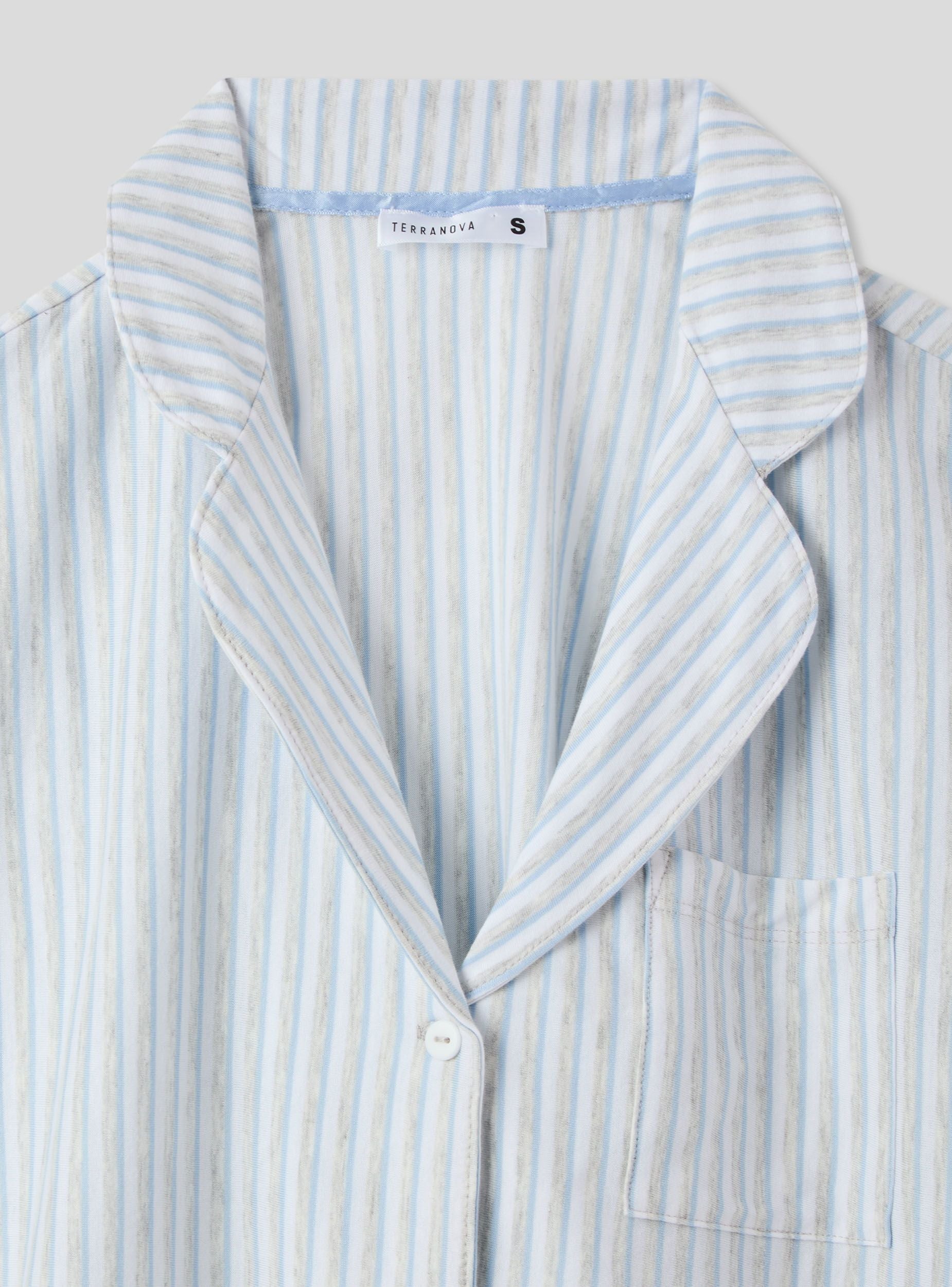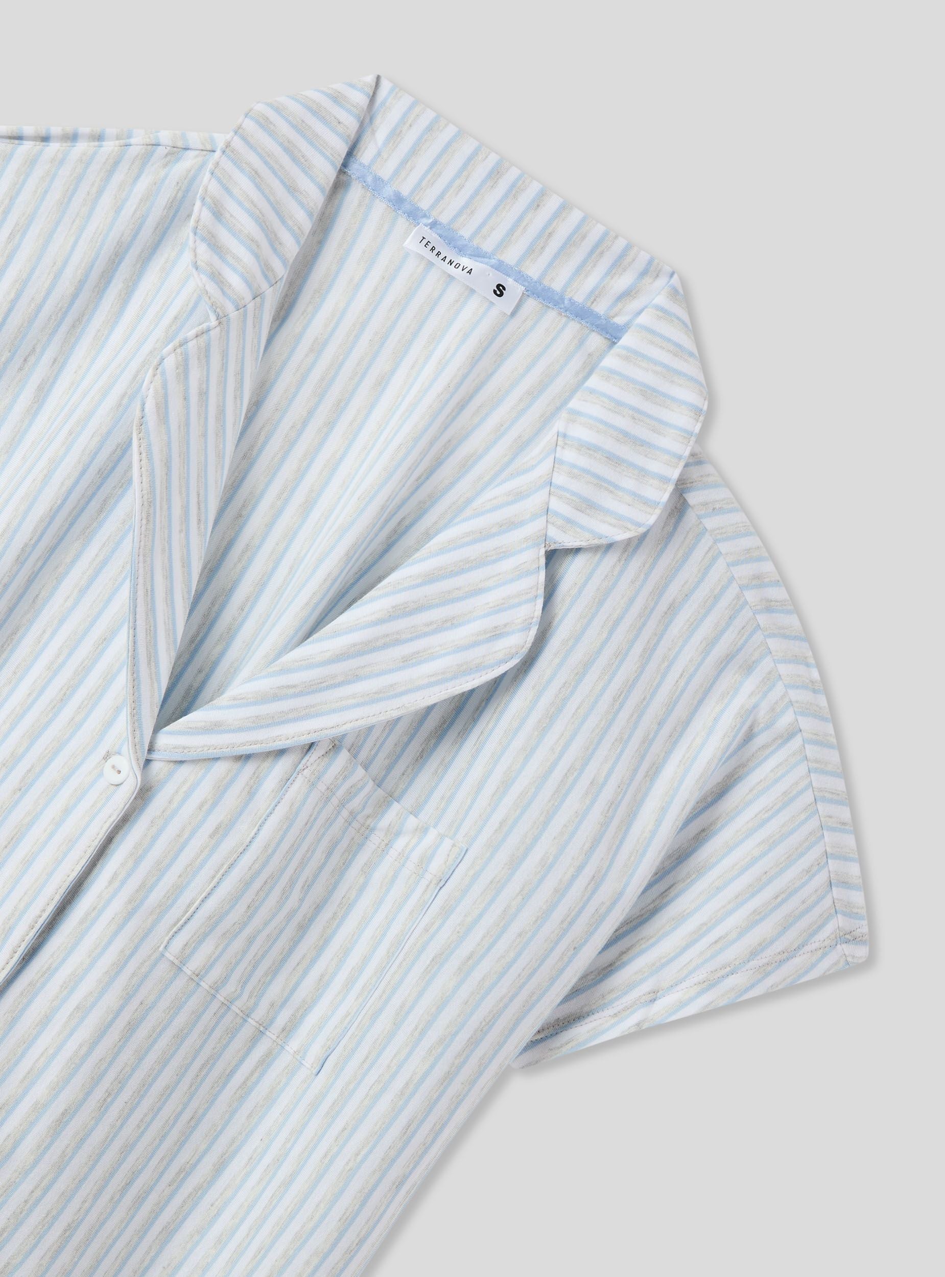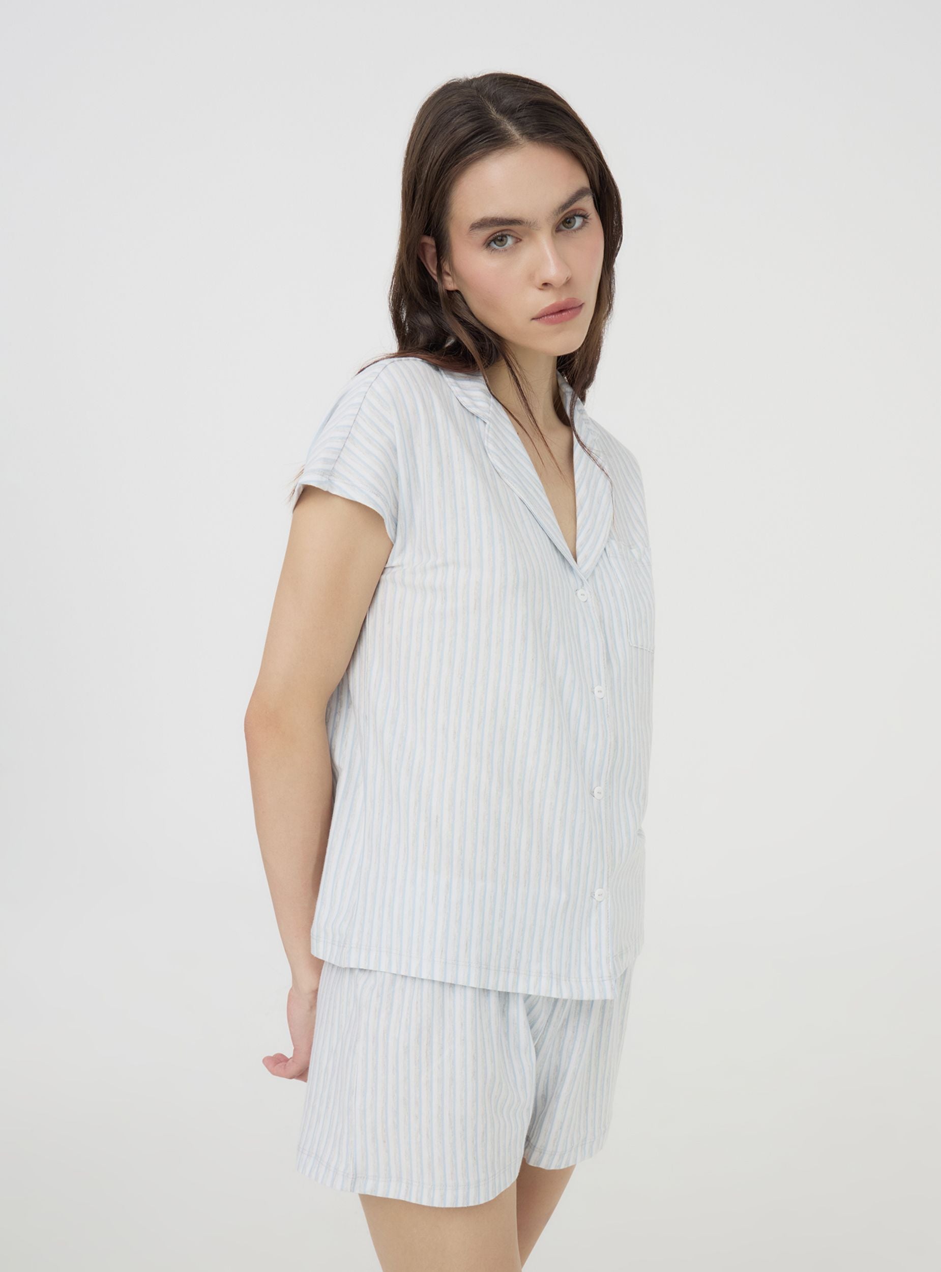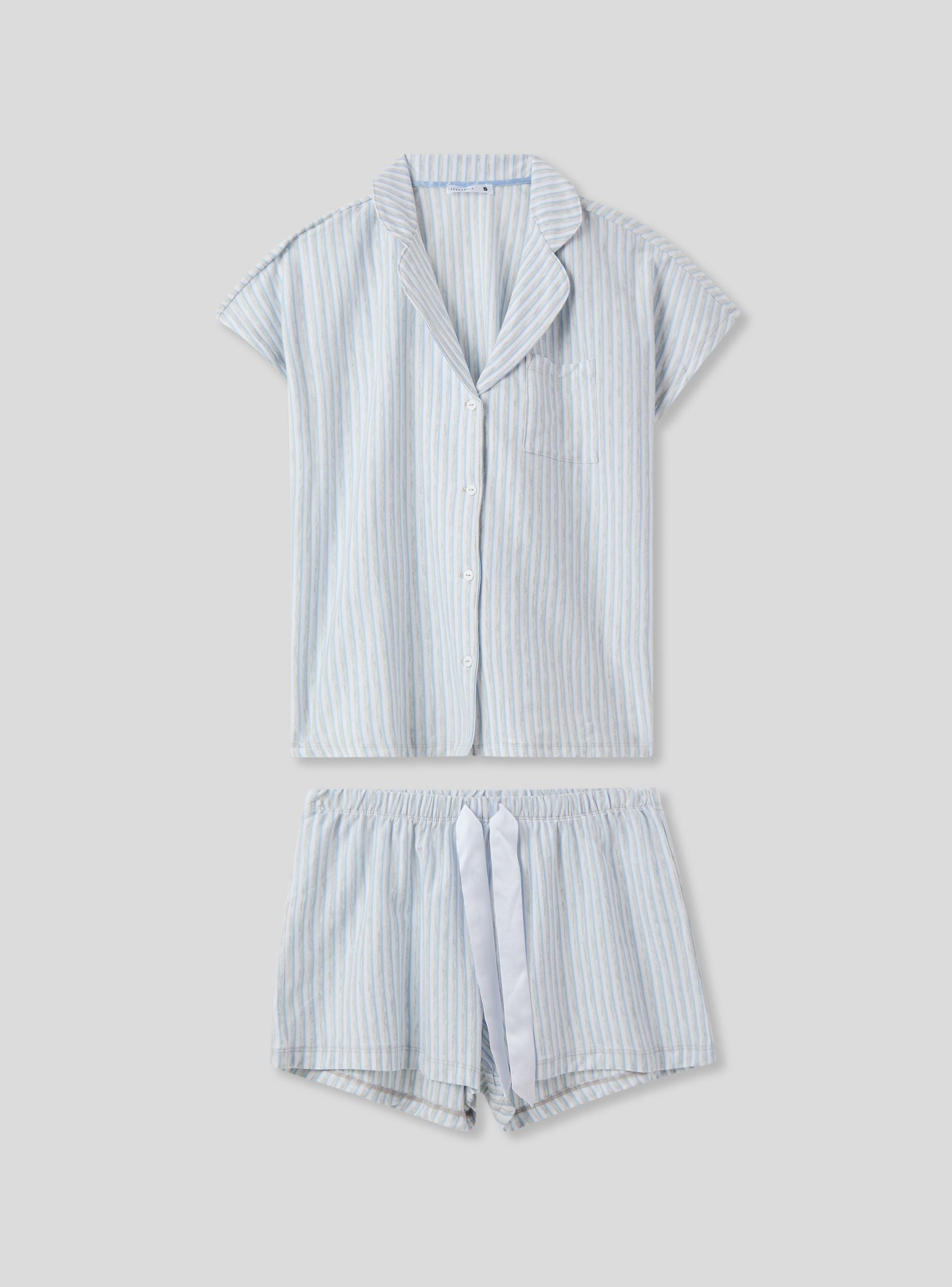 Pigiama corto da donna perfetto per le calde notti estive. Composto da una camicia a righe con maniche corte, colletto, bottoni frontali e un comodo taschino. I pantaloncini coordinati presentano una pratica coulisse per una vestibilità regolabile. Un'ottima scelta per un look fresco e raffinato durante il relax o il riposo.Dettagli