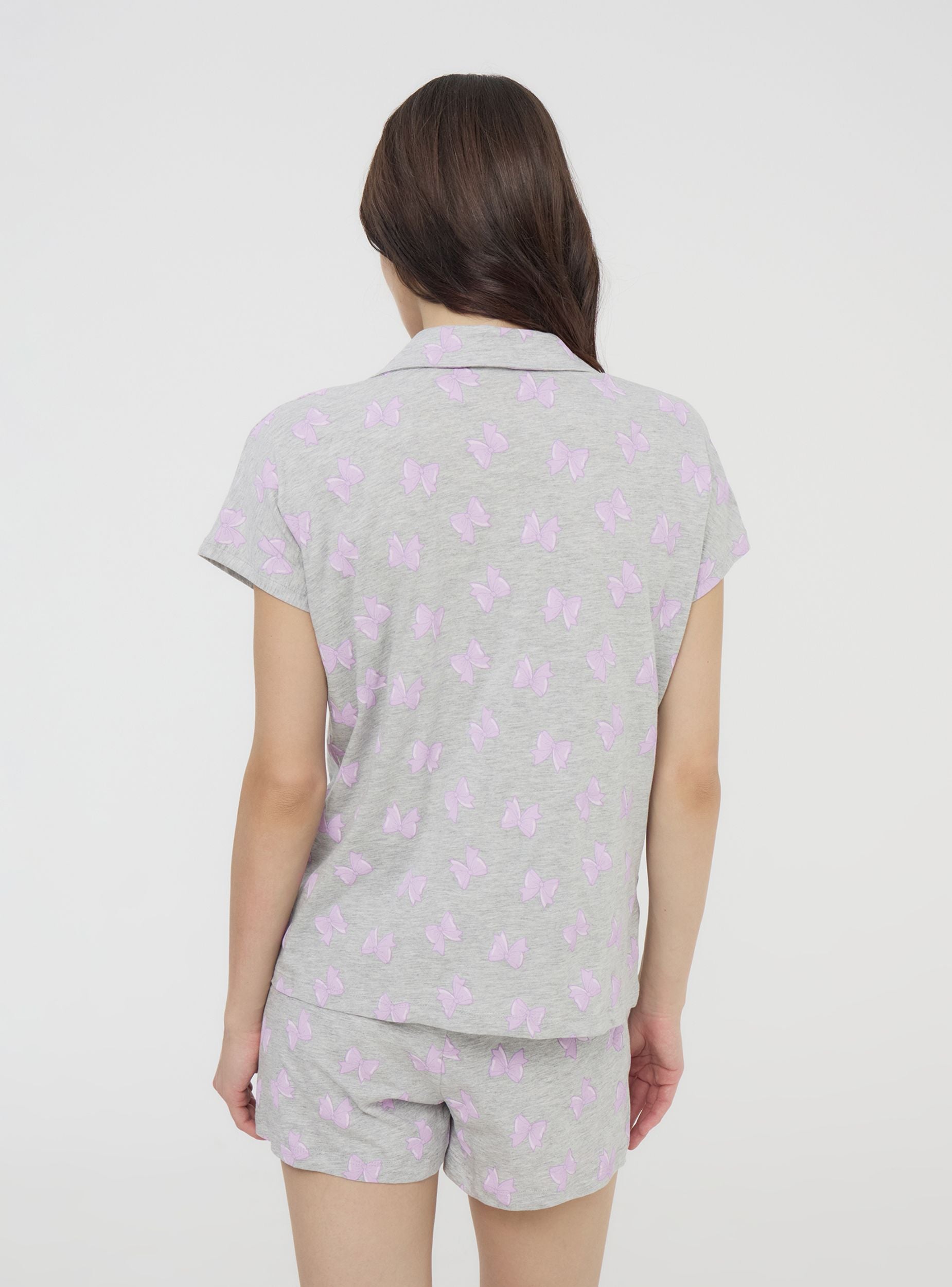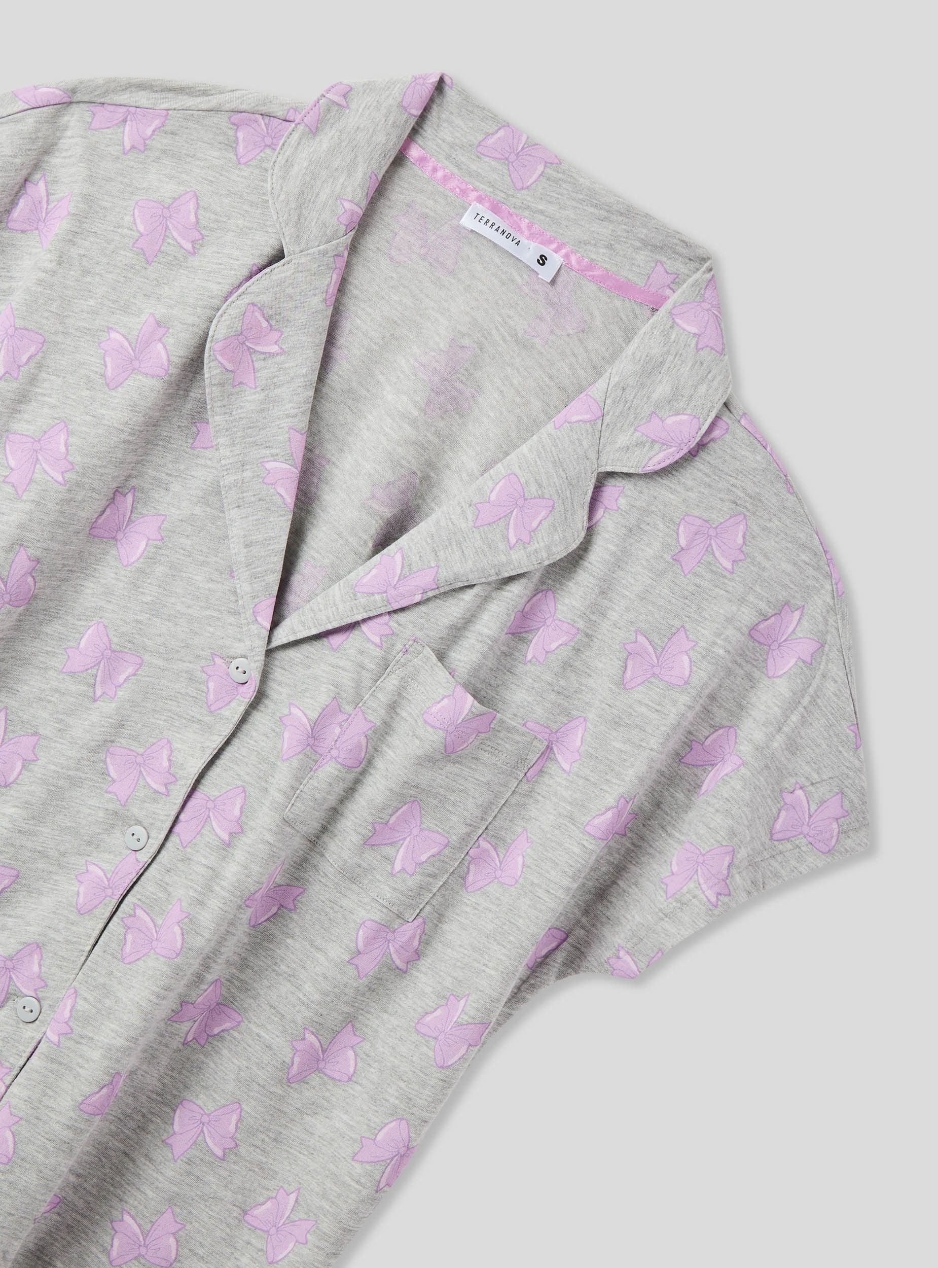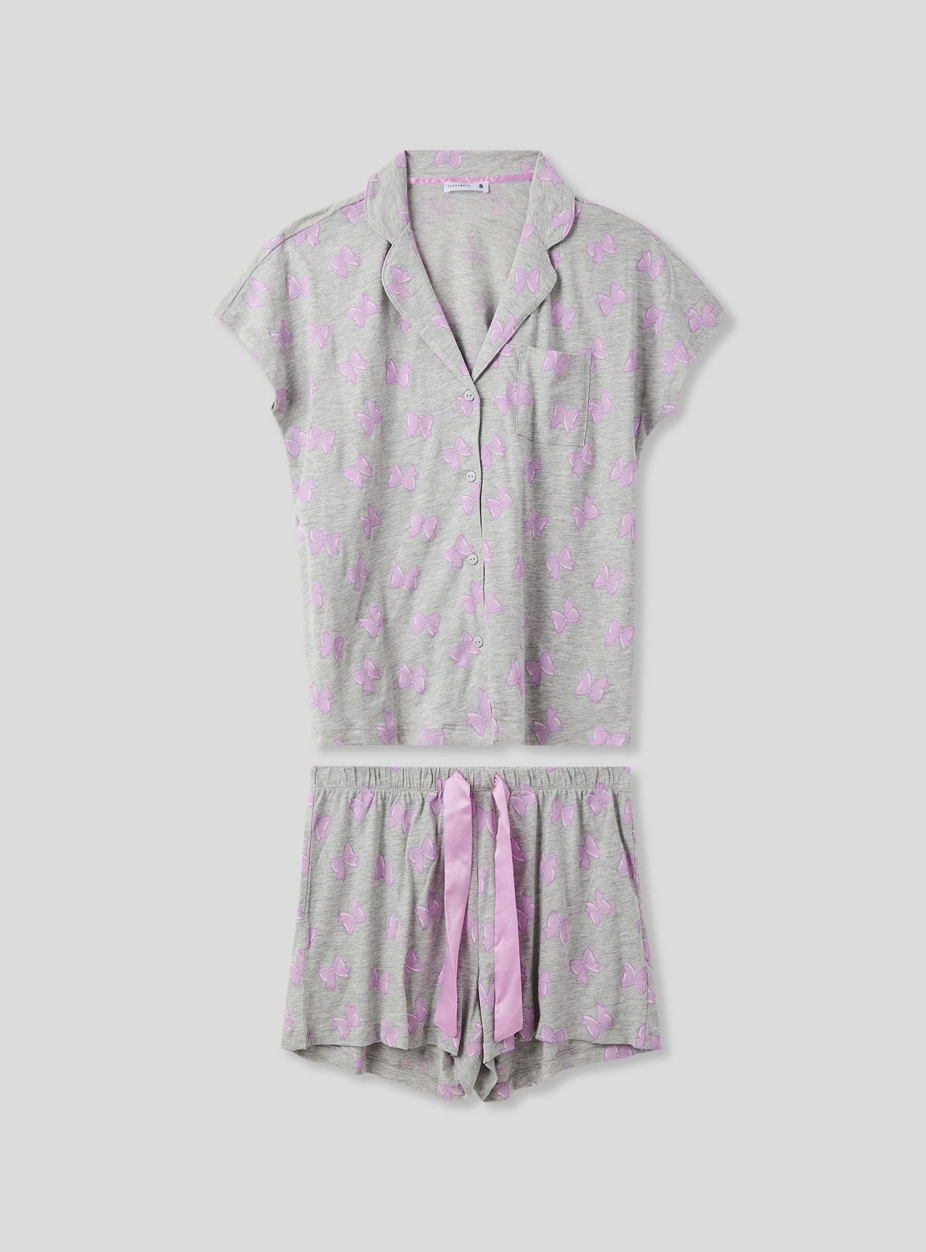 Pigiama da donna composto da una camicia a maniche corte e pantaloncini corti coordinati. La camicia presenta un design raffinato con abbottonatura frontale e una graziosa stampa di fiocchi che aggiunge un tocco femminile e delicato. I pantaloncini, confortevoli e leggeri, sono impreziositi da una pratica coulisse in vita che garantisce una vestibilità regolabile. Perfetto per un look elegante e rilassato nelle serate più tranquille.Dettagli