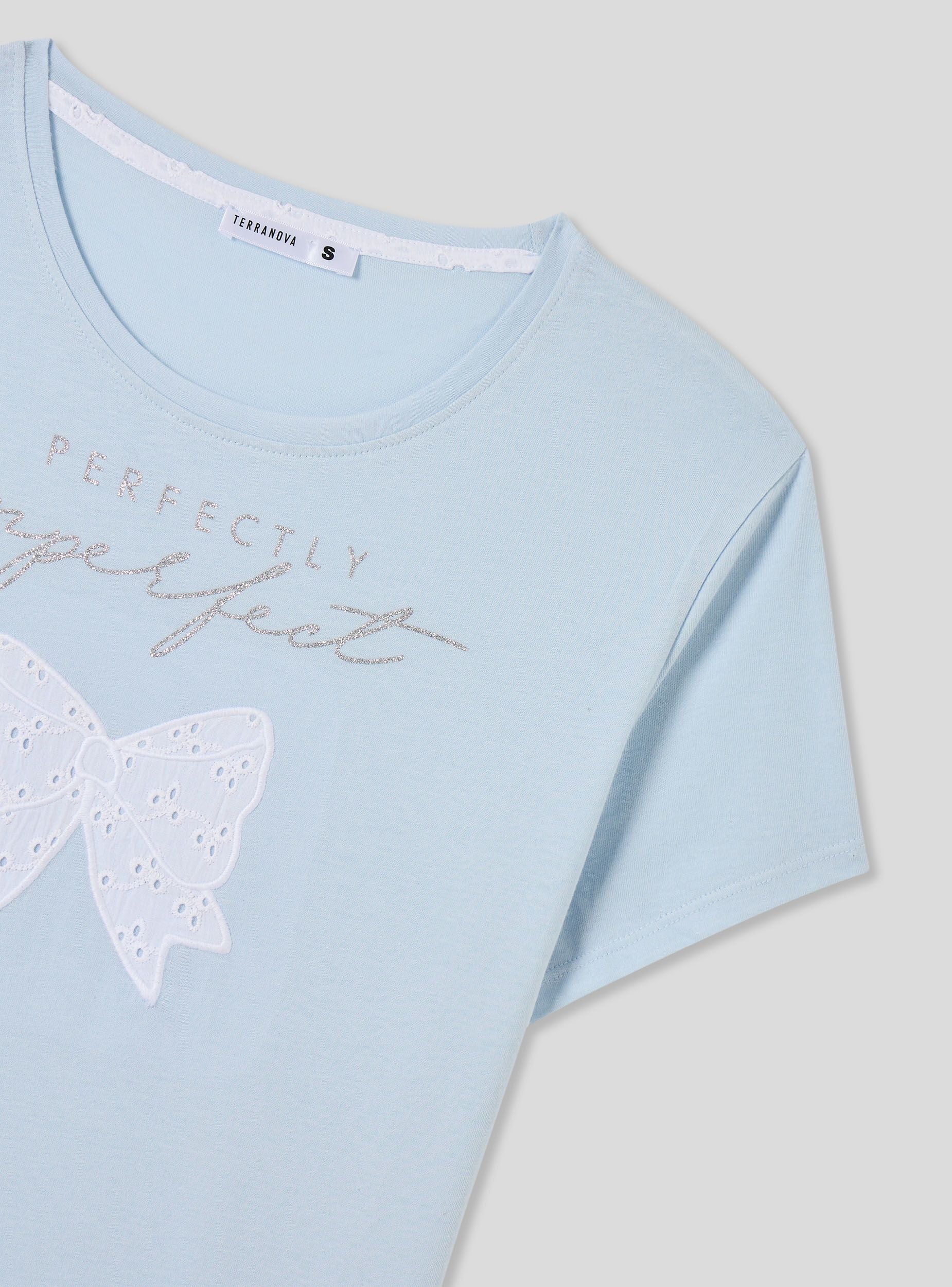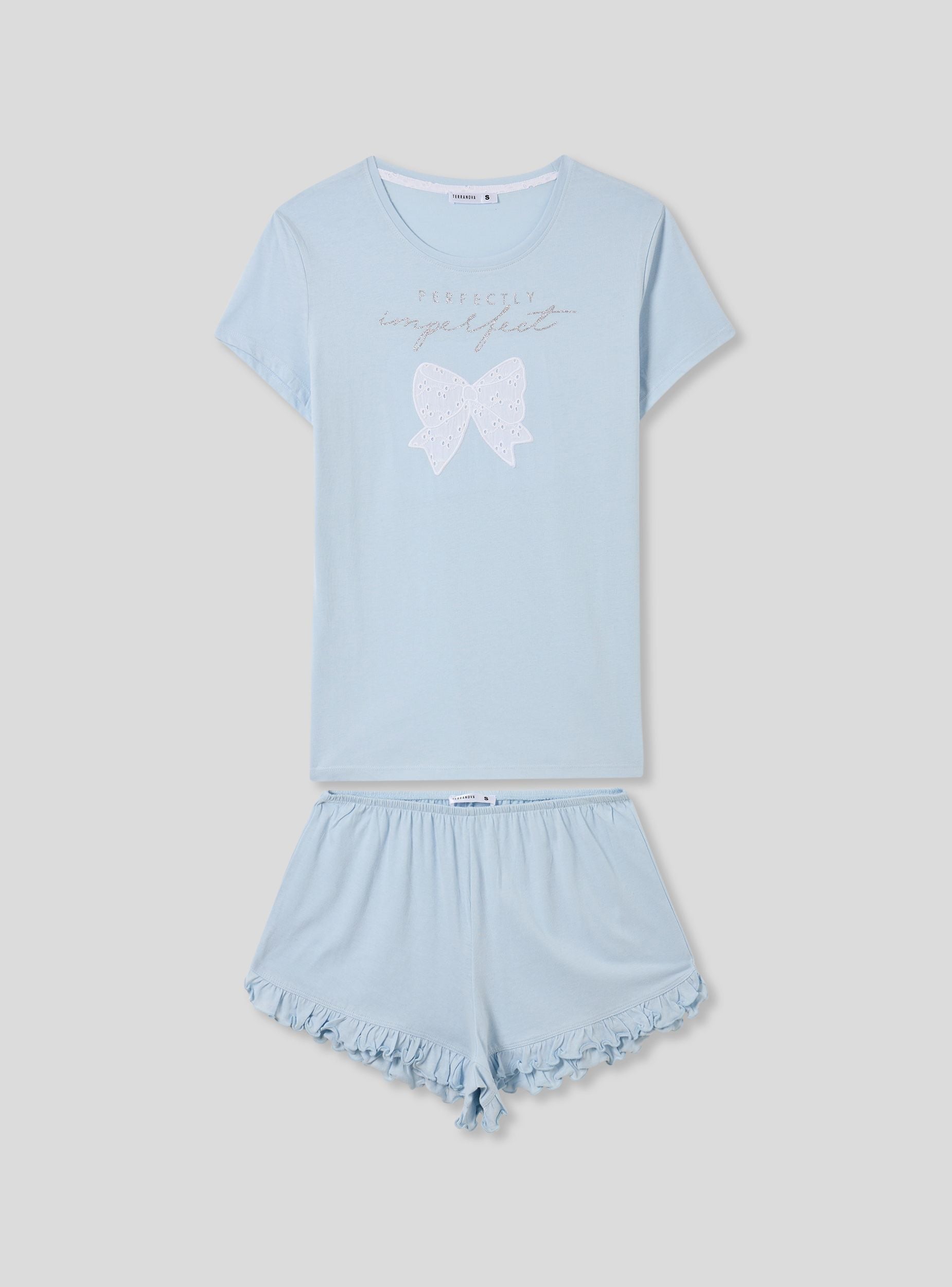 Pigiama corto da donna perfetto per rilassarsi a casa. La maglietta a maniche corte con girocollo presenta un grazioso fiocco decorato con glitter e una scritta elegante sul davanti. I pantaloncini corti, arricchiti da dettagli raffinati, completano l'outfit per un look confortevole e femminile. Ideale per le calde serate estive.Dettagli