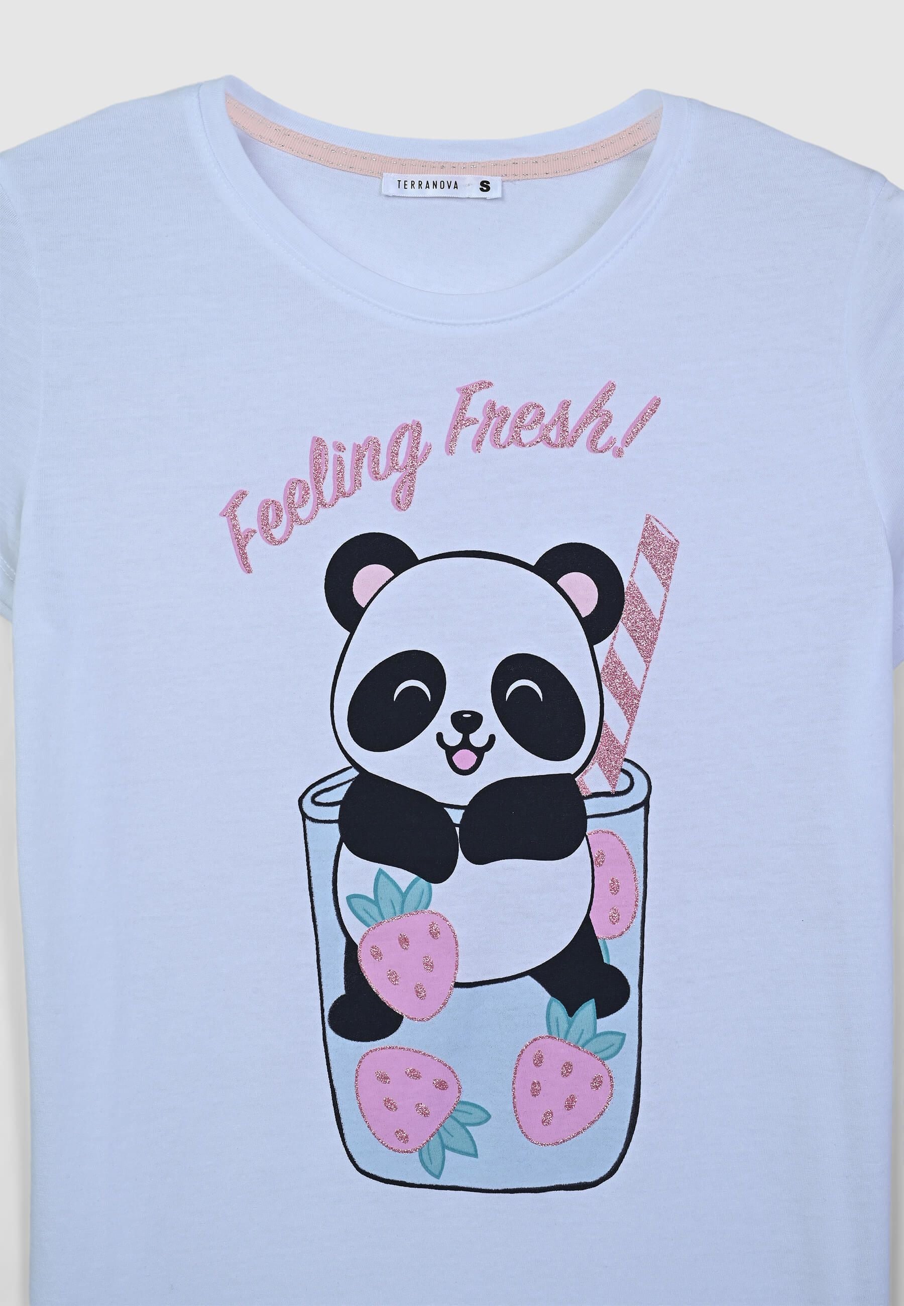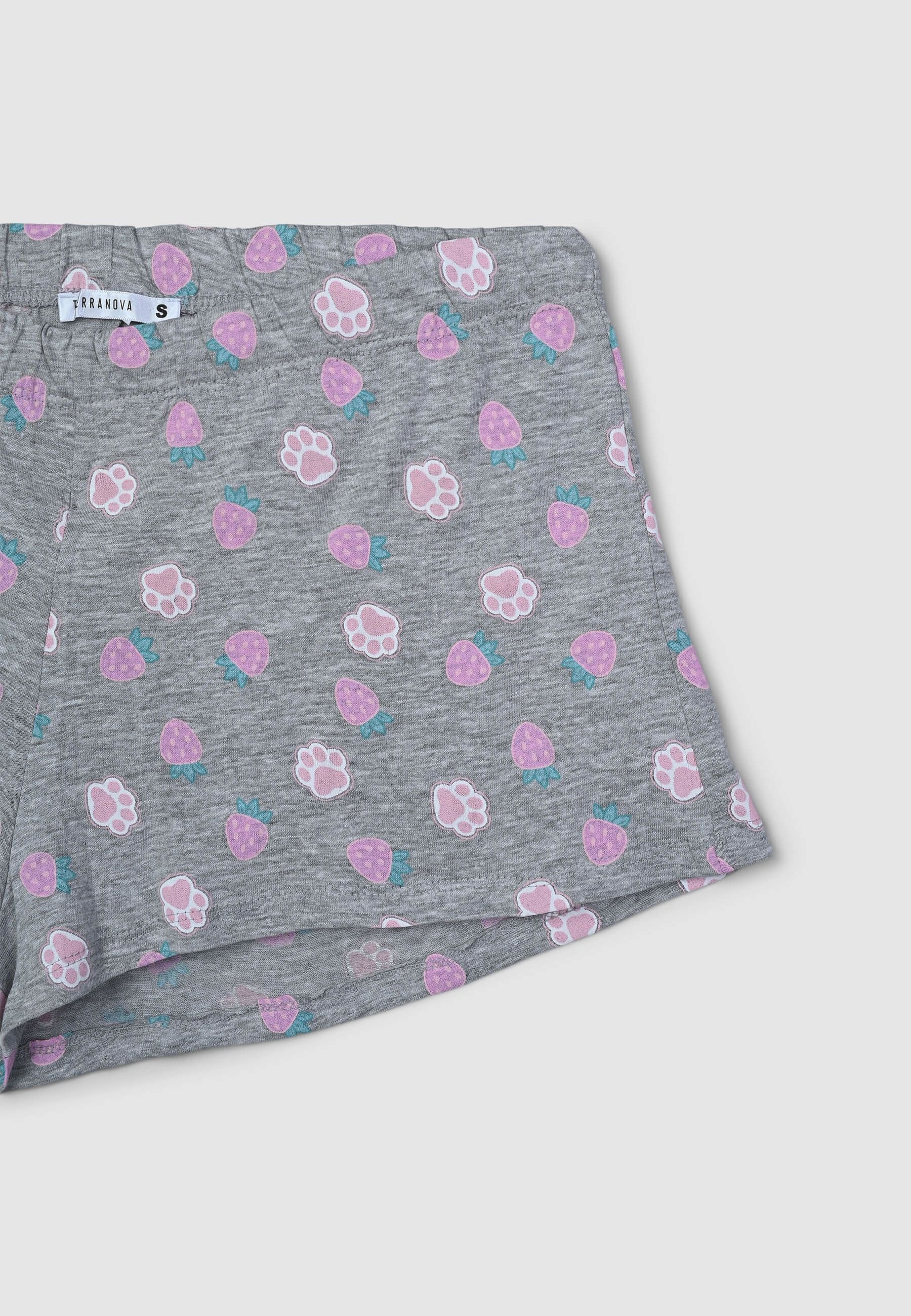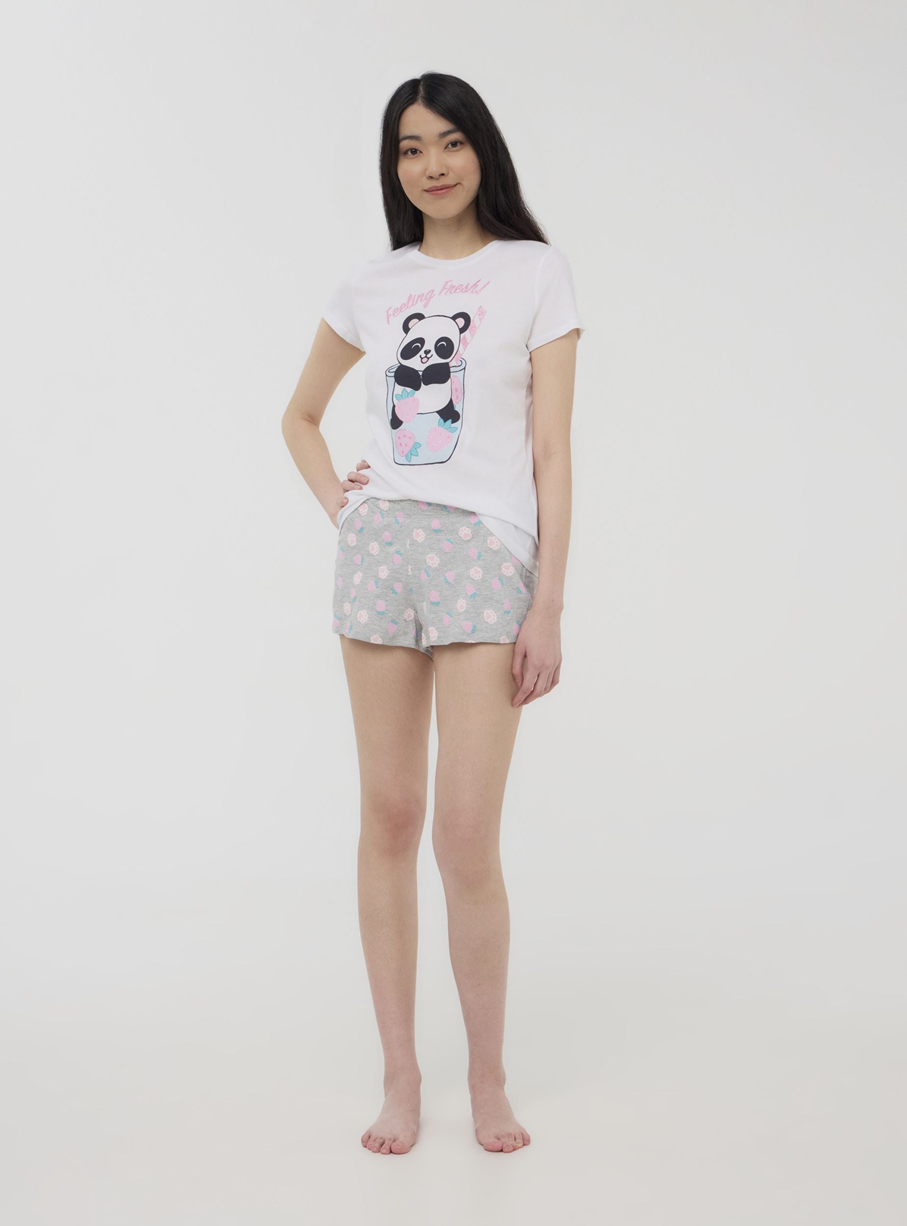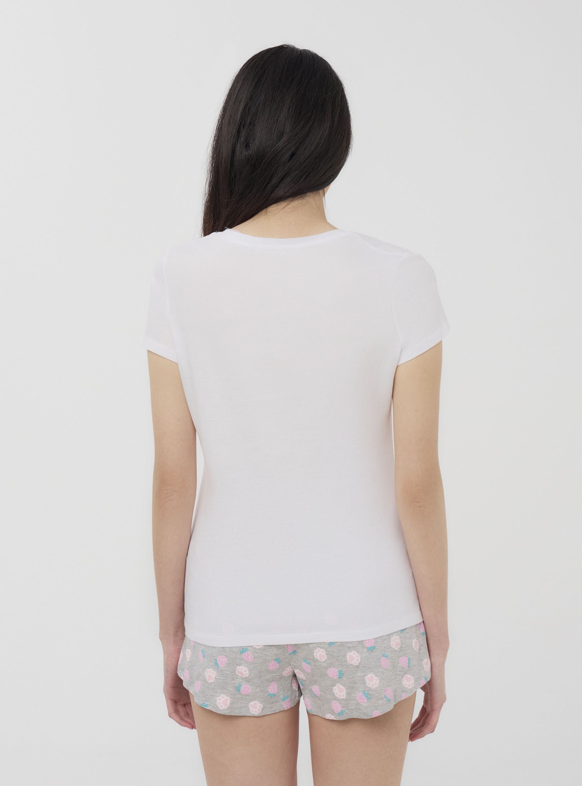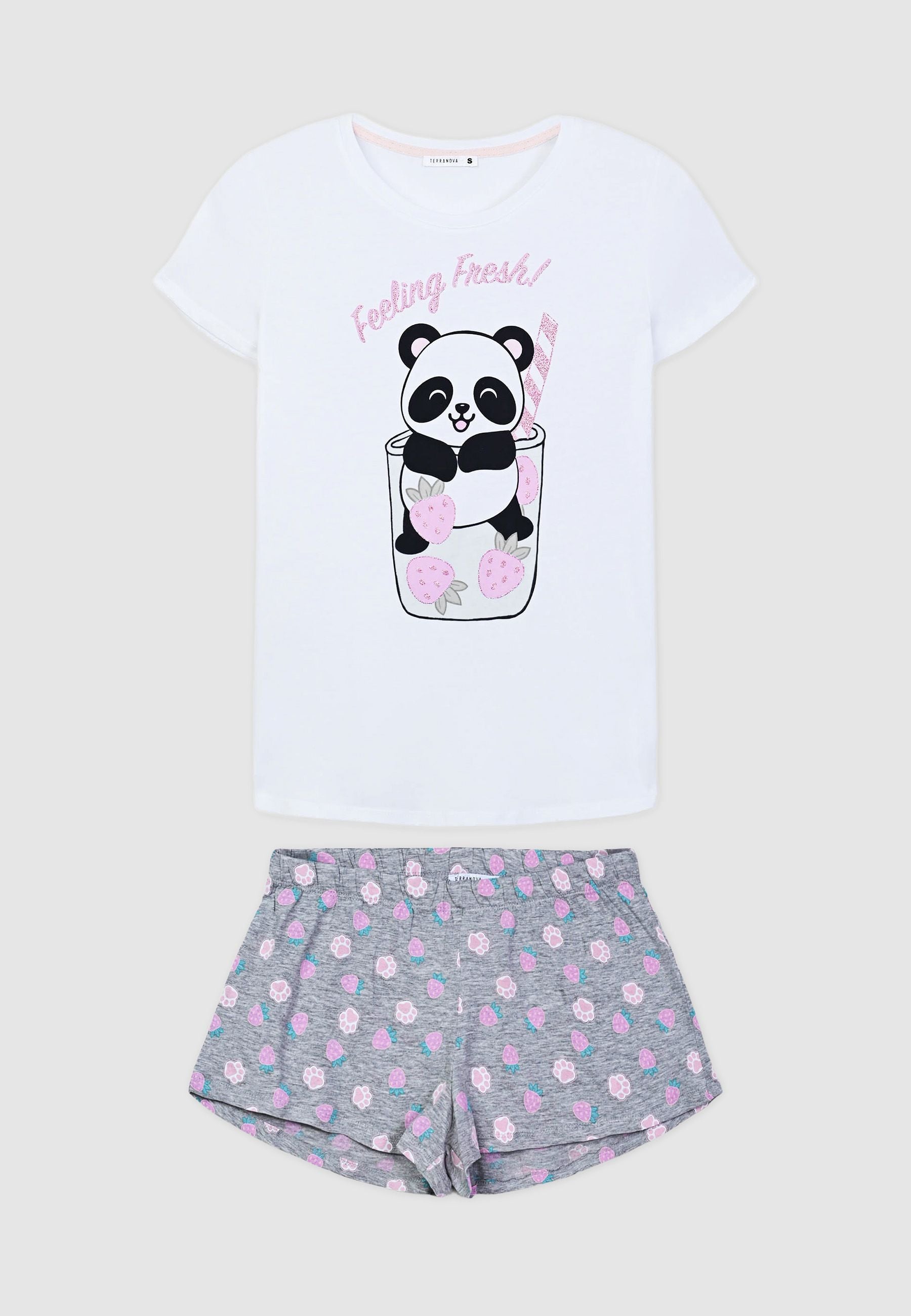 Pigiama da donna composto da una maglietta a maniche corte e pantaloncini corti coordinati. La maglietta presenta una stampa simpatica con un dolce animaletto, arricchita da dettagli glitterati che aggiungono un tocco di luce. I pantaloncini, comodi e versatili, sono caratterizzati da una fantasia all-over che dona un aspetto allegro e vivace. Perfetto per rilassarsi con stile e comfort nelle serate più calde.Dettagli
