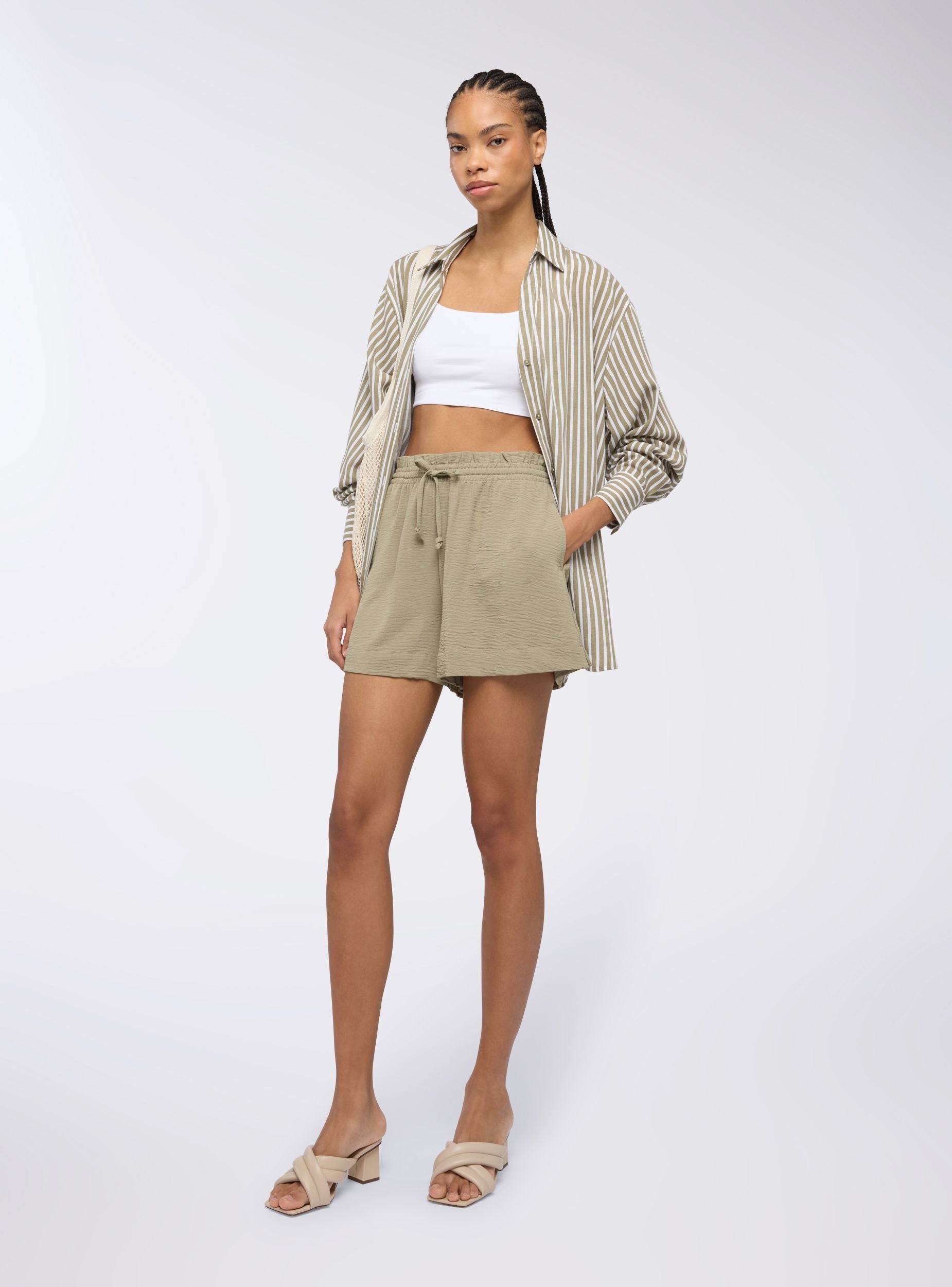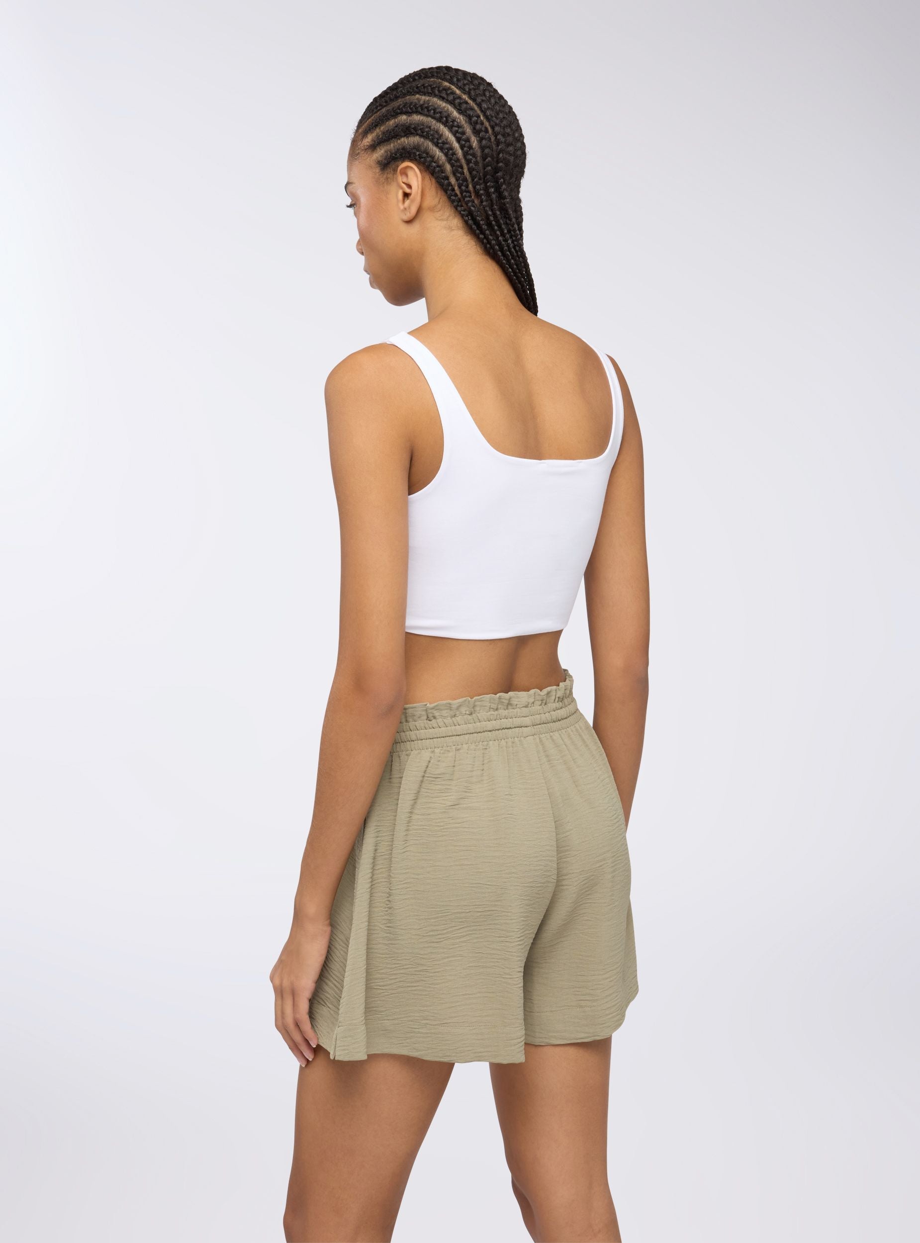 Pantaloncini da donna a tinta unita, con un design morbido che garantisce comfort e libertà di movimento. Il punto vita è elasticizzato e dotato di una coulisse regolabile. Le pratiche tasche laterali offrono spazio per piccoli oggetti, rendendo questi pantaloncini funzionali oltre che comodi. Ideali per un look casual e rilassato.Dettagli