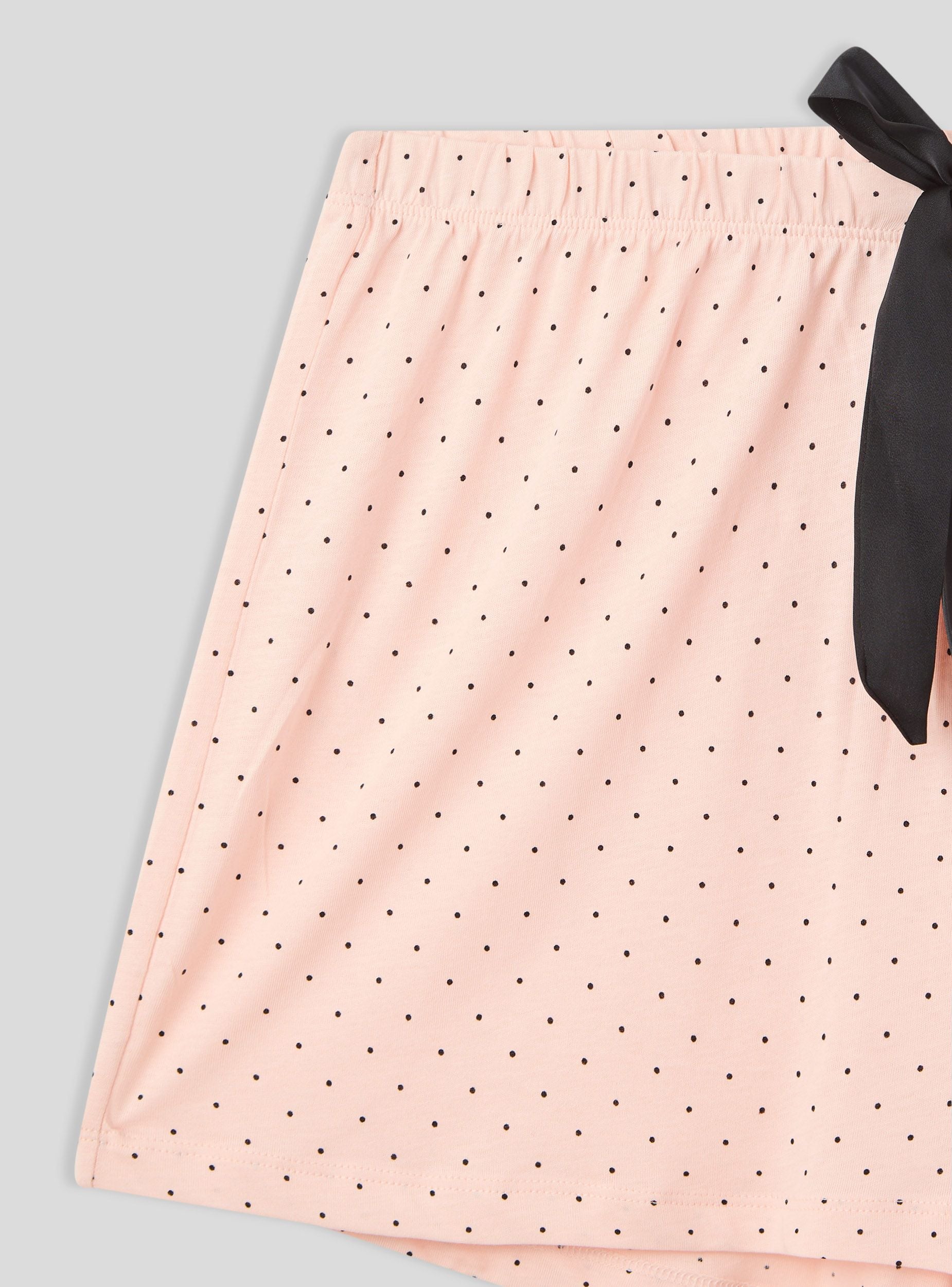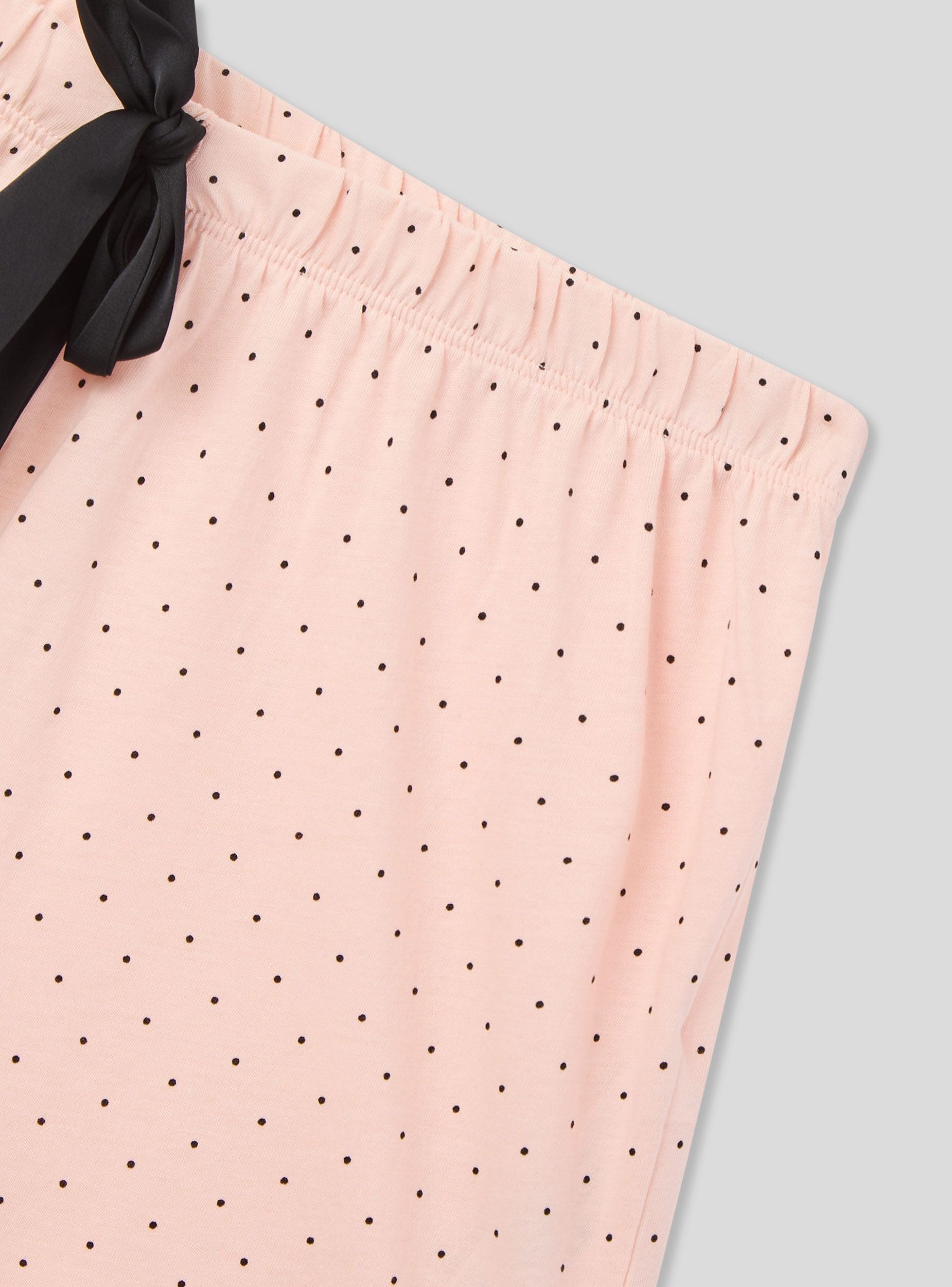 Pantaloncini del pigiama da donna corti, ideali per garantire comfort e leggerezza durante le ore di relax o il riposo. Il design a pois aggiunge un tocco femminile e vivace, mentre la pratica coulisse in vita consente una vestibilità personalizzata. Perfetti da abbinare a una canotta coordinata per un completo da notte elegante e confortevole, oppure con una t-shirt per un look informale da casa.Dettagli