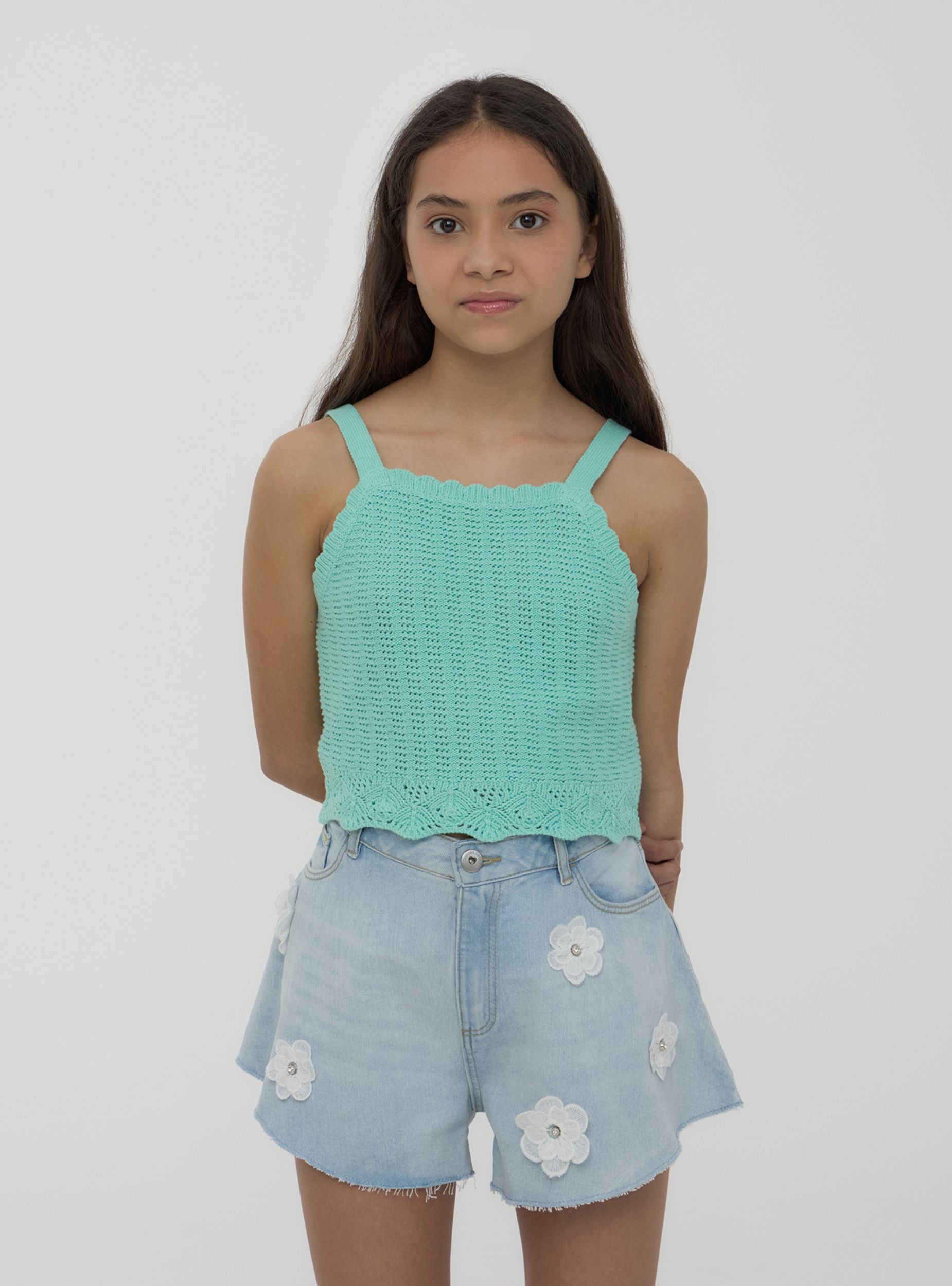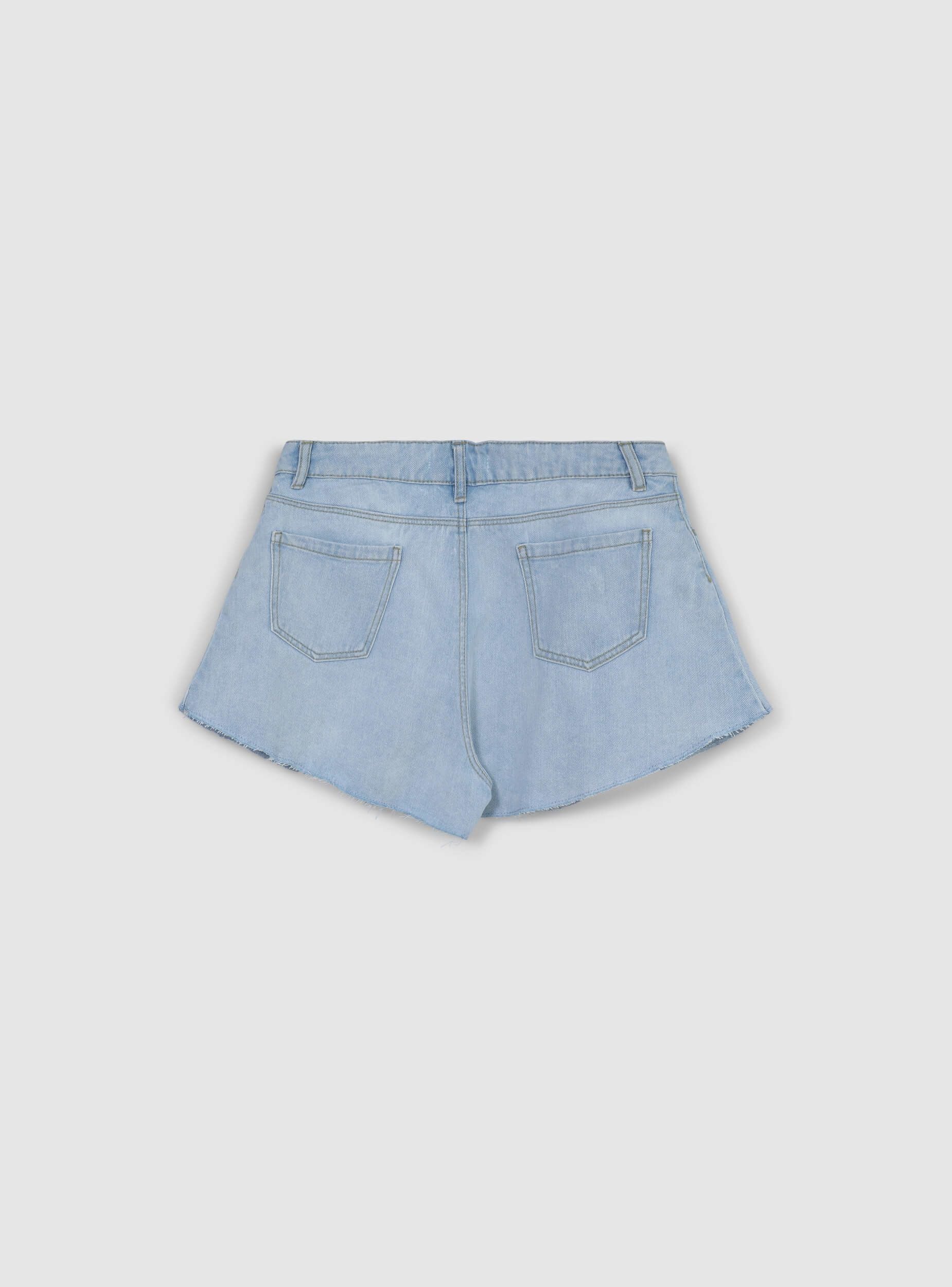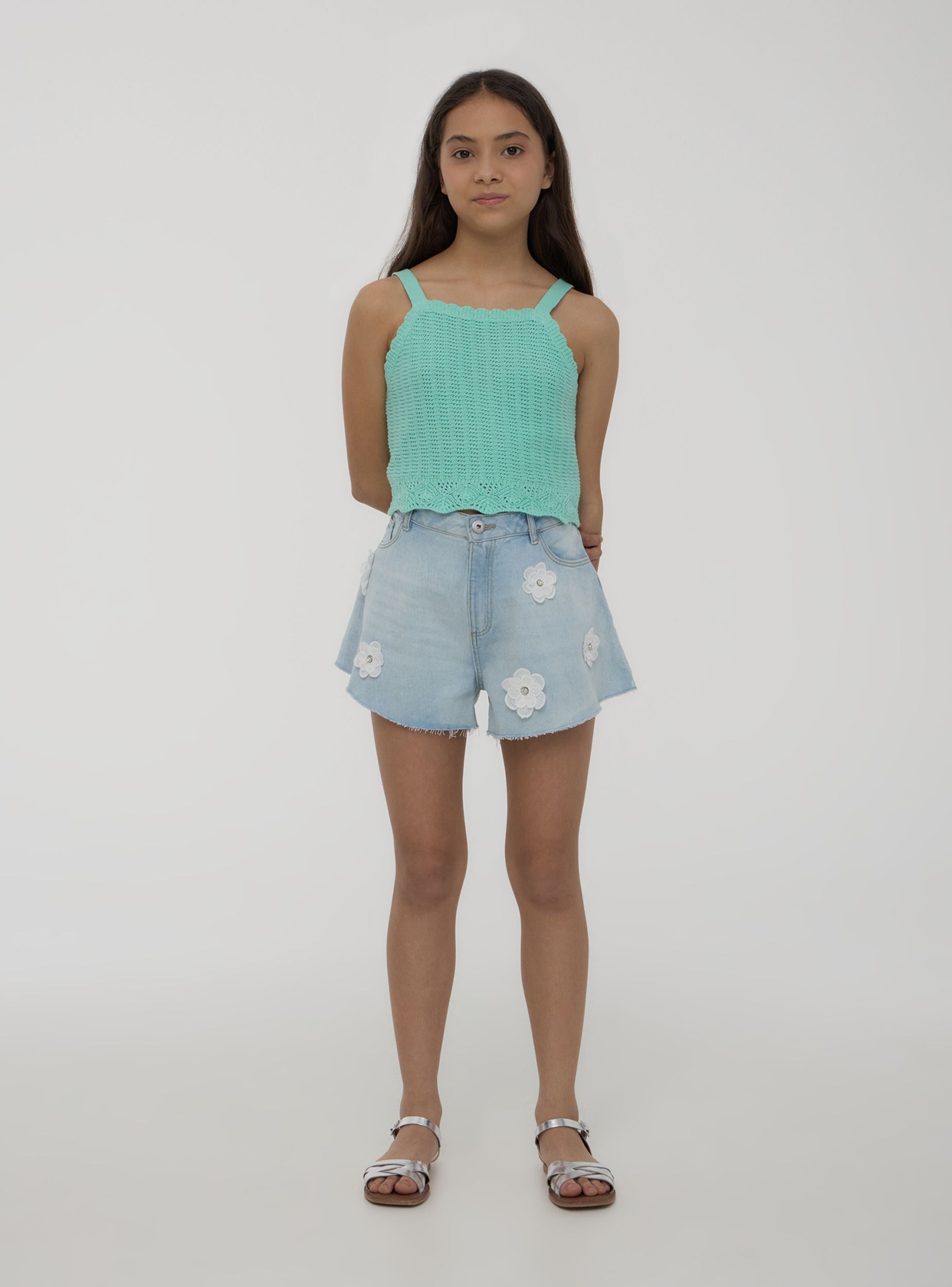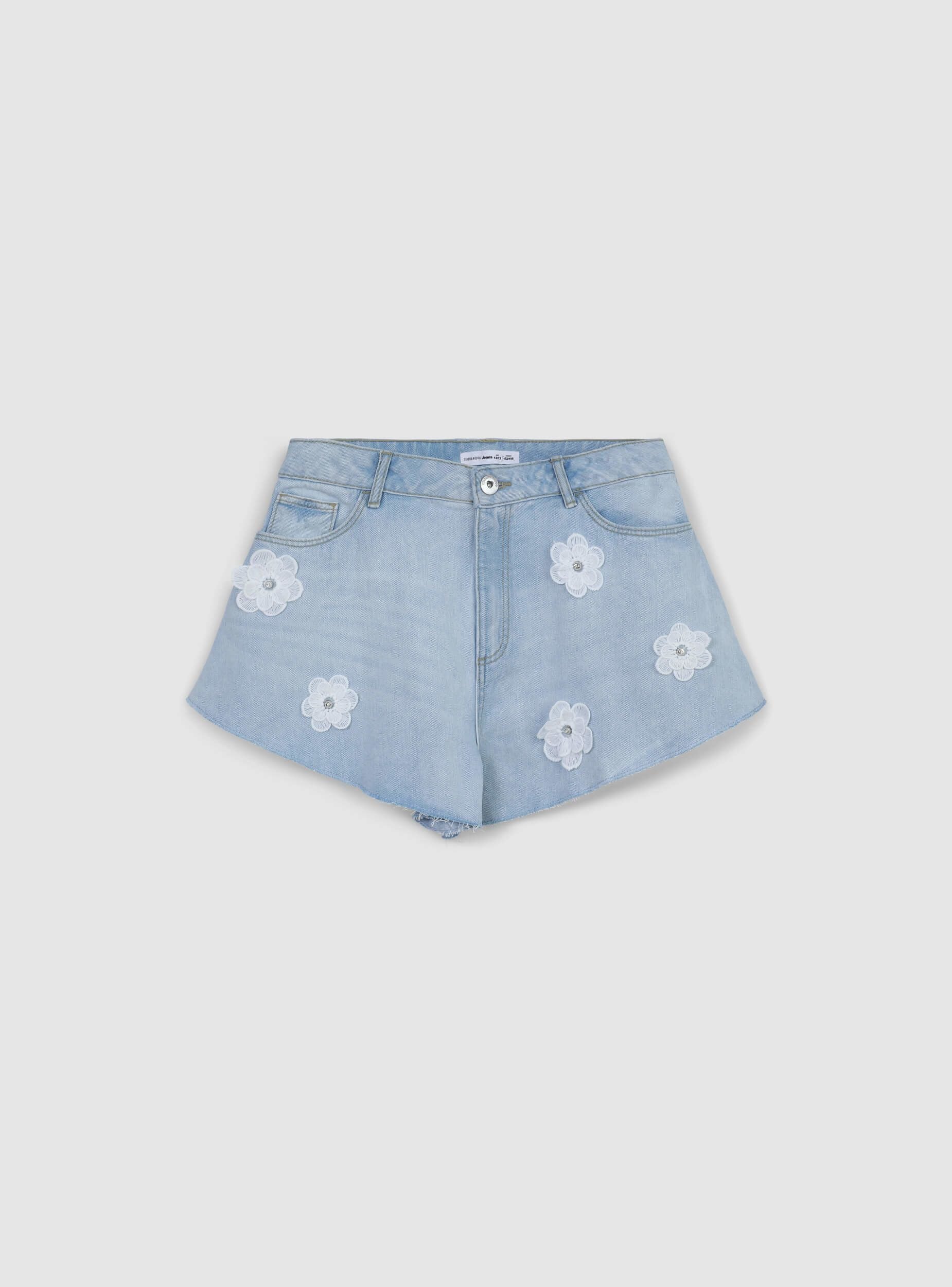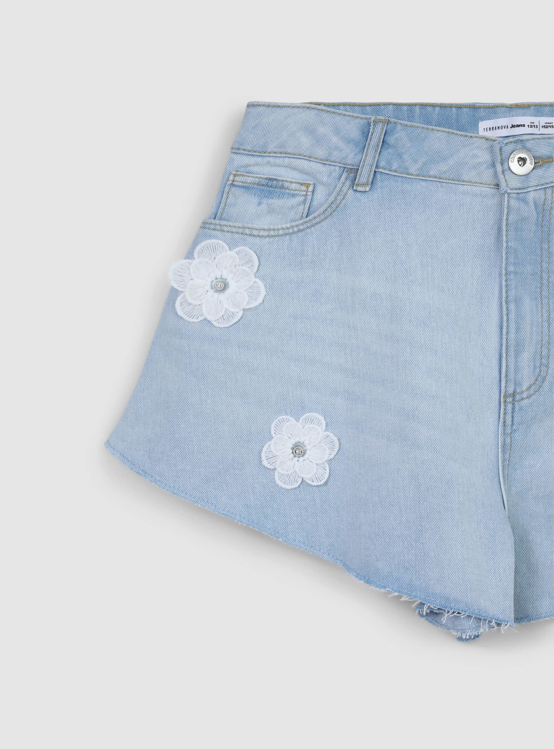 Pantaloncini da bambina dal design vivace e romantico, arricchiti da applicazioni a forma di fiore che aggiungono un tocco delicato e giocoso. La chiusura con bottone e zip garantisce una vestibilità comoda, mentre il modello a cinque tasche offre praticità per ogni occasione. Il fondo sfrangiato dona un aspetto trendy e dinamico, perfetto per le giornate estive. Ideali con una t-shirt e sandali per un look fresco e leggero, oppure con una camicetta e sneakers per un outfit casual e alla moda.Dettagli