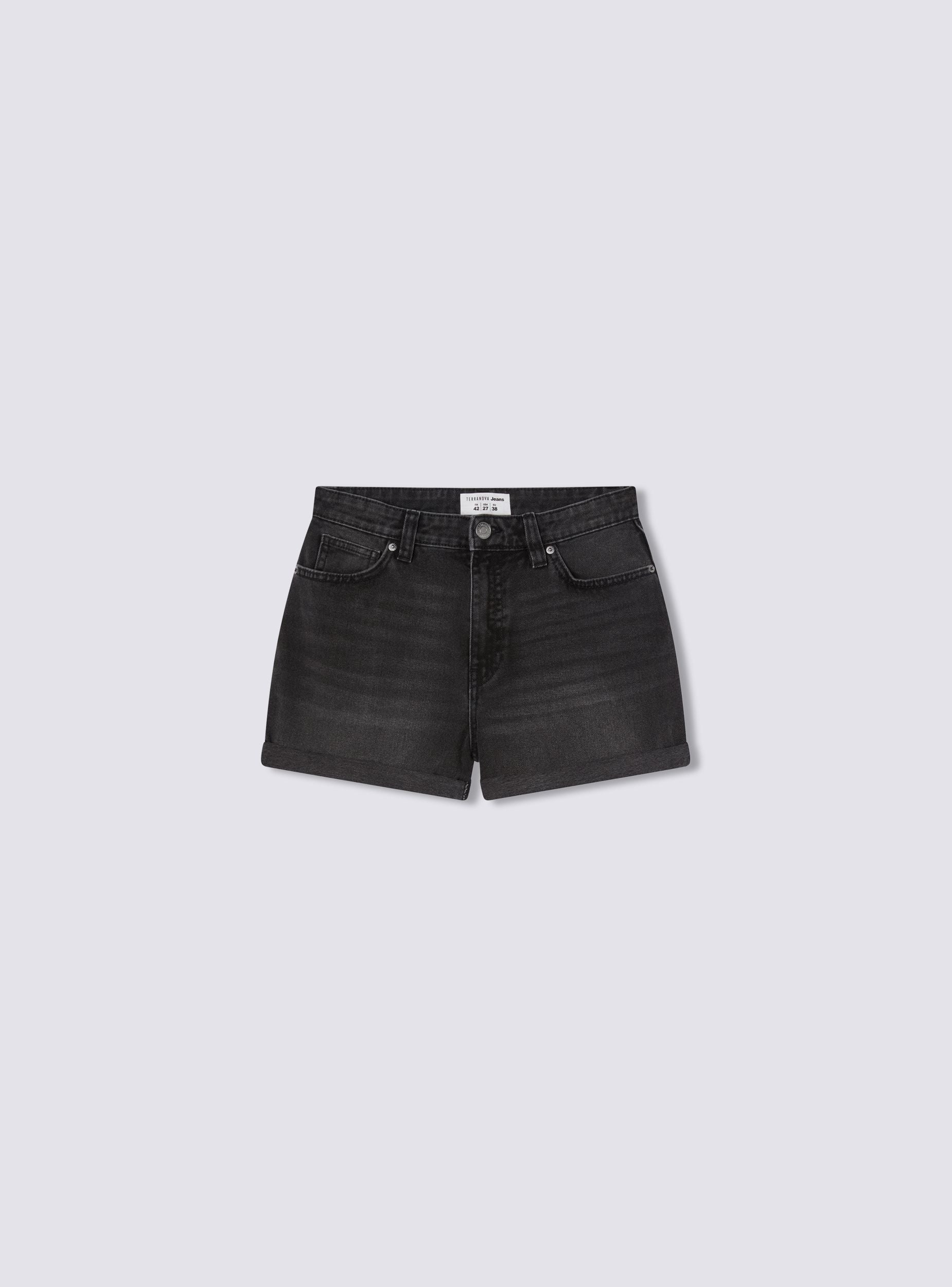 Pantaloncini da donna in denim nero, dallo stile mom fit, perfetti per un look casual e contemporaneo. Dotati di cinque tasche funzionali, offrono spazio pratico per piccoli oggetti e dettagli che richiamano uno stile senza tempo. La chiusura con bottone e zip garantisce una vestibilità sicura e confortevole, mentre i passanti in vita permettono di personalizzare l’outfit con una cintura. Ideali per passeggiate in città, occasioni informali o per creare abbinamenti trendy con crop top e sneakers.Dettagli
