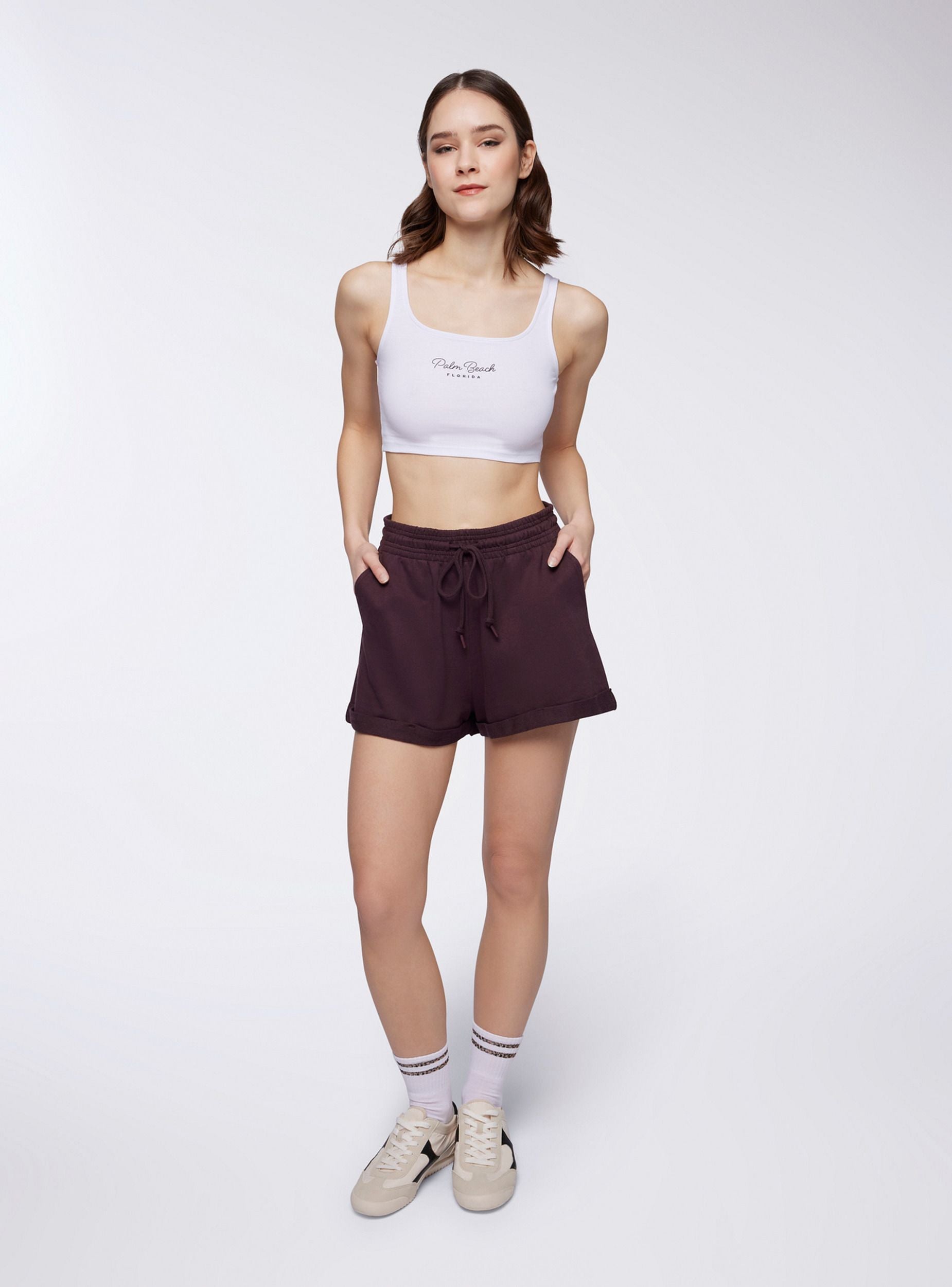 Pantaloncini da donna a vita alta a tinta unita, caratterizzati da un design con risvolto sul bordo inferiore che dona un tocco contemporaneo e ricercato. La coulisse regolabile in vita permette di adattare la vestibilità in modo confortevole, garantendo libertà di movimento e praticità. Ideali per un look casual, questi pantaloncini uniscono stile e funzionalità, risultando perfetti per il tempo libero, le passeggiate o le attività quotidiane, mantenendo sempre un tocco di eleganza semplice.Dettagli