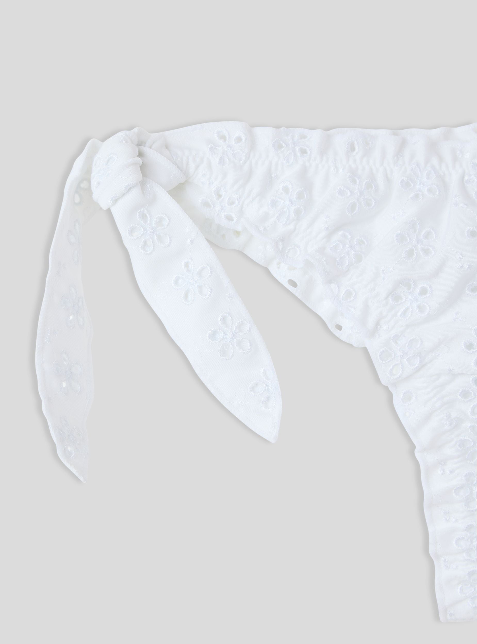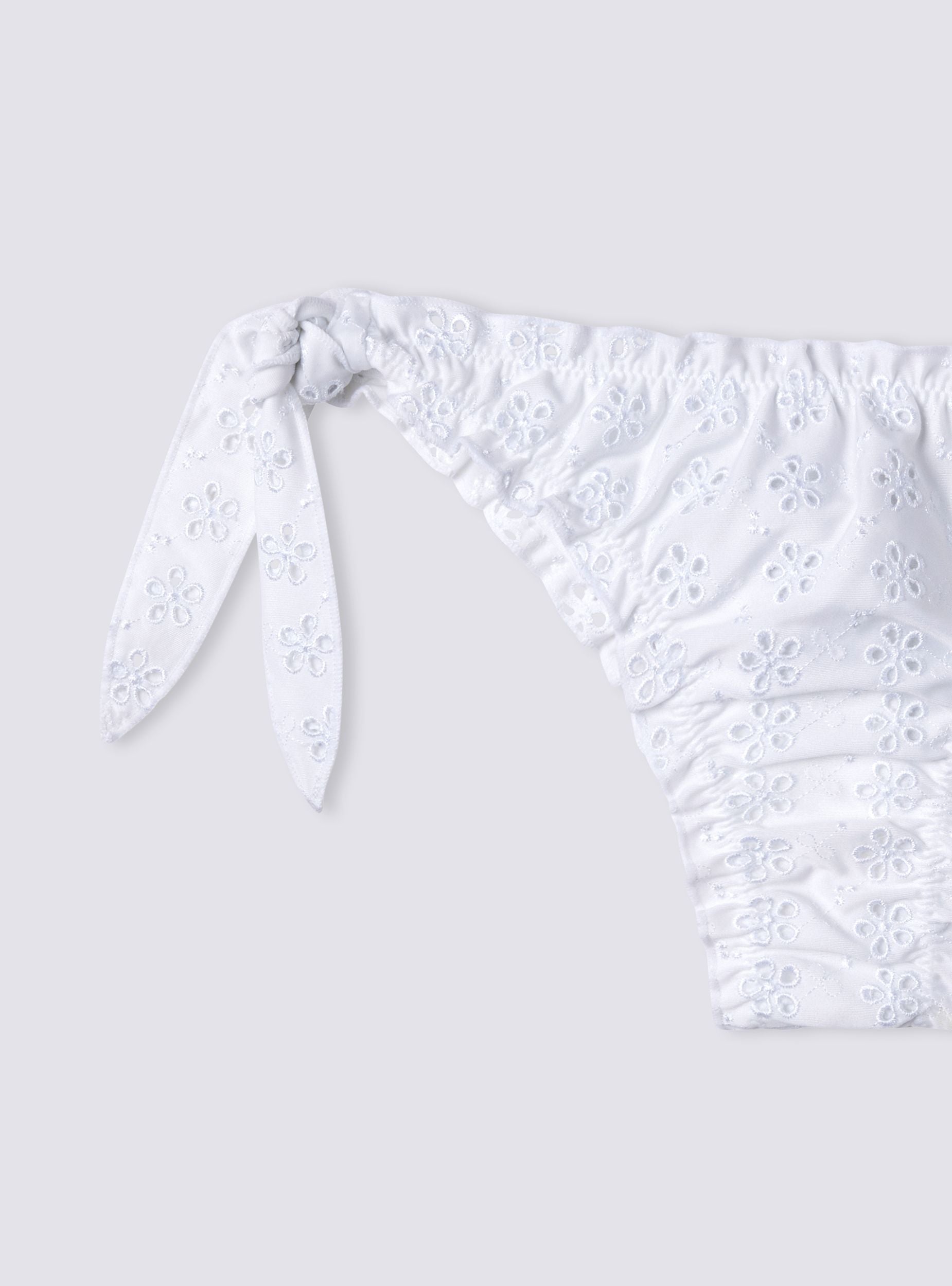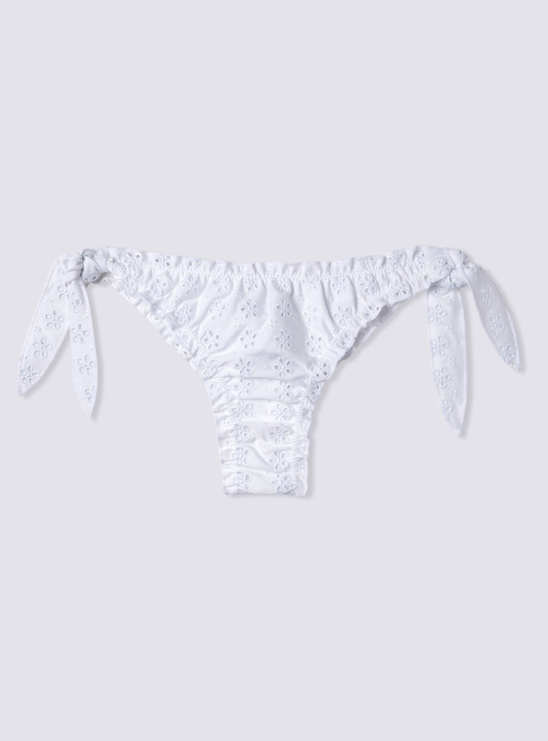 Slip da donna per bikini, perfetto per un look romantico e femminile in spiaggia o in piscina. Il design brasiliana valorizza la silhouette, mentre il ricamo sangallo aggiunge un tocco raffinato. La tinta unita lo rende versatile e i laccetti laterali permettono una regolazione personalizzata. Ideale da abbinare a un top coordinato e un copricostume leggero per un outfit estivo chic e sofisticato.Dettagli