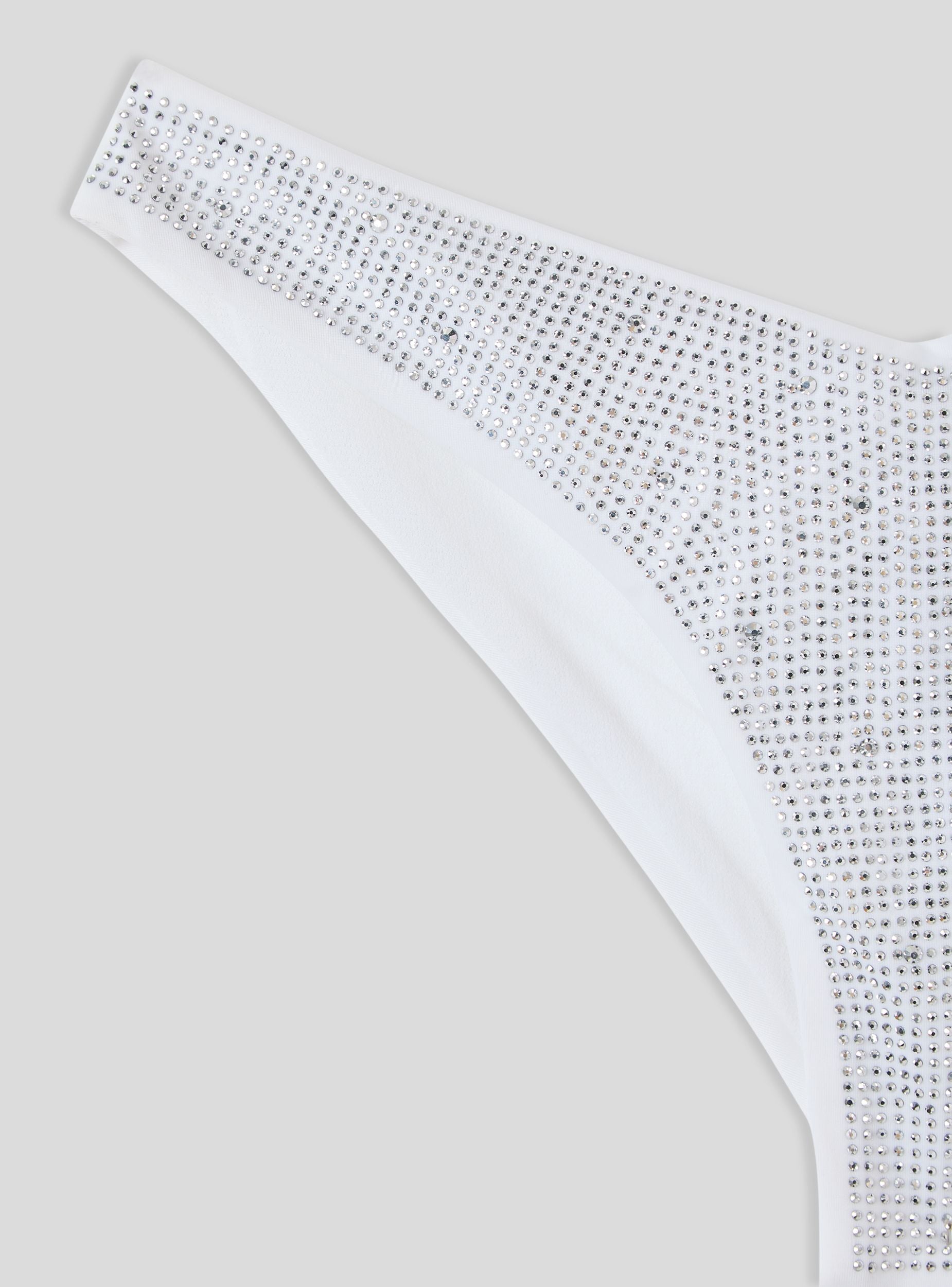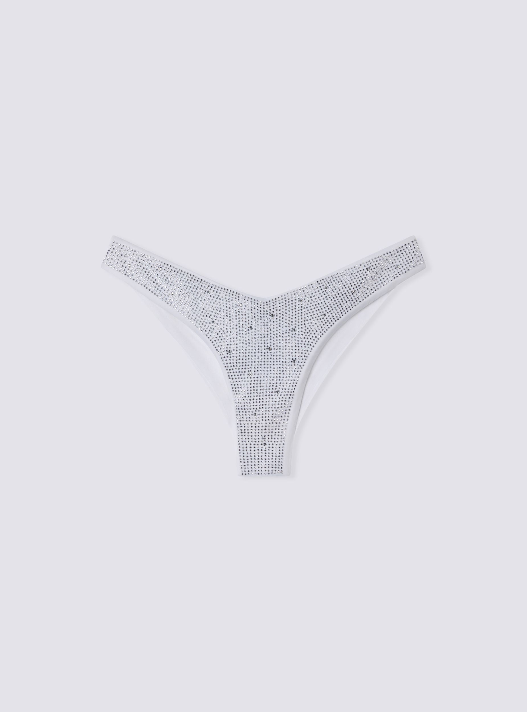 Slip da donna per bikini, perfetto per brillare in spiaggia o in piscina. Il design brasiliana con taglio v-shape esalta la silhouette, mentre gli strass applicati donano un effetto luminoso e raffinato. La tinta unita lo rende versatile e facile da abbinare a un top coordinato. Ideale con un copricostume leggero e sandali gioiello per un look estivo elegante e glamour.Dettagli