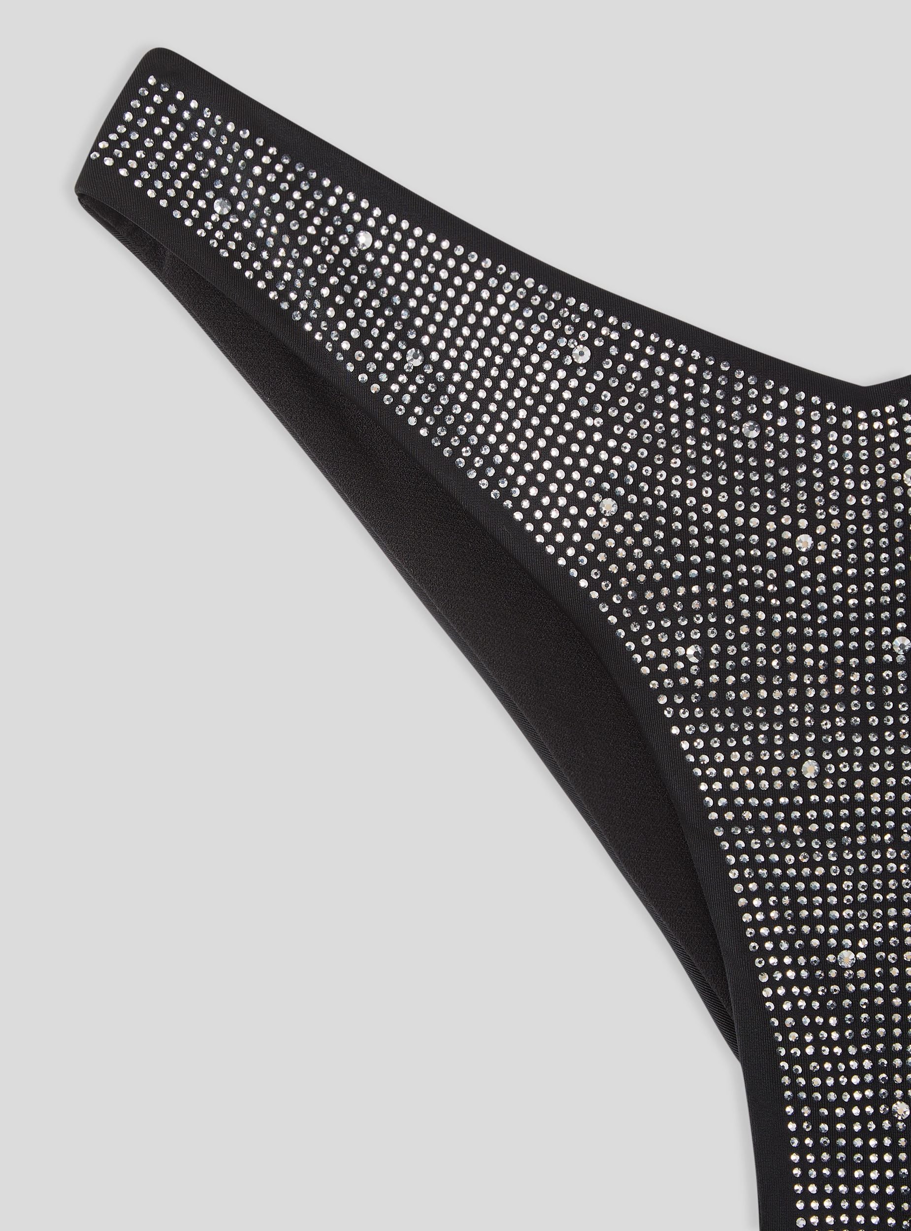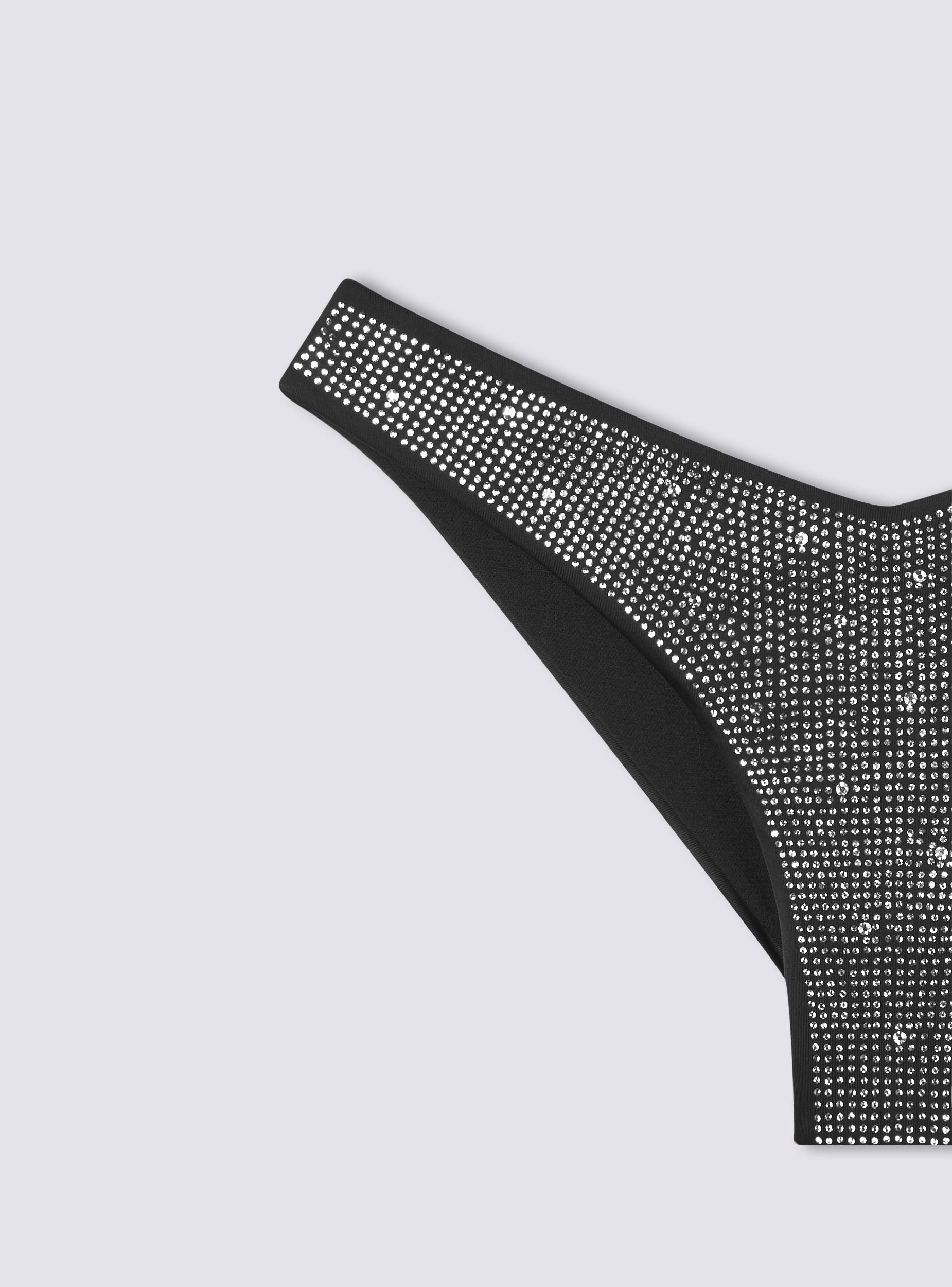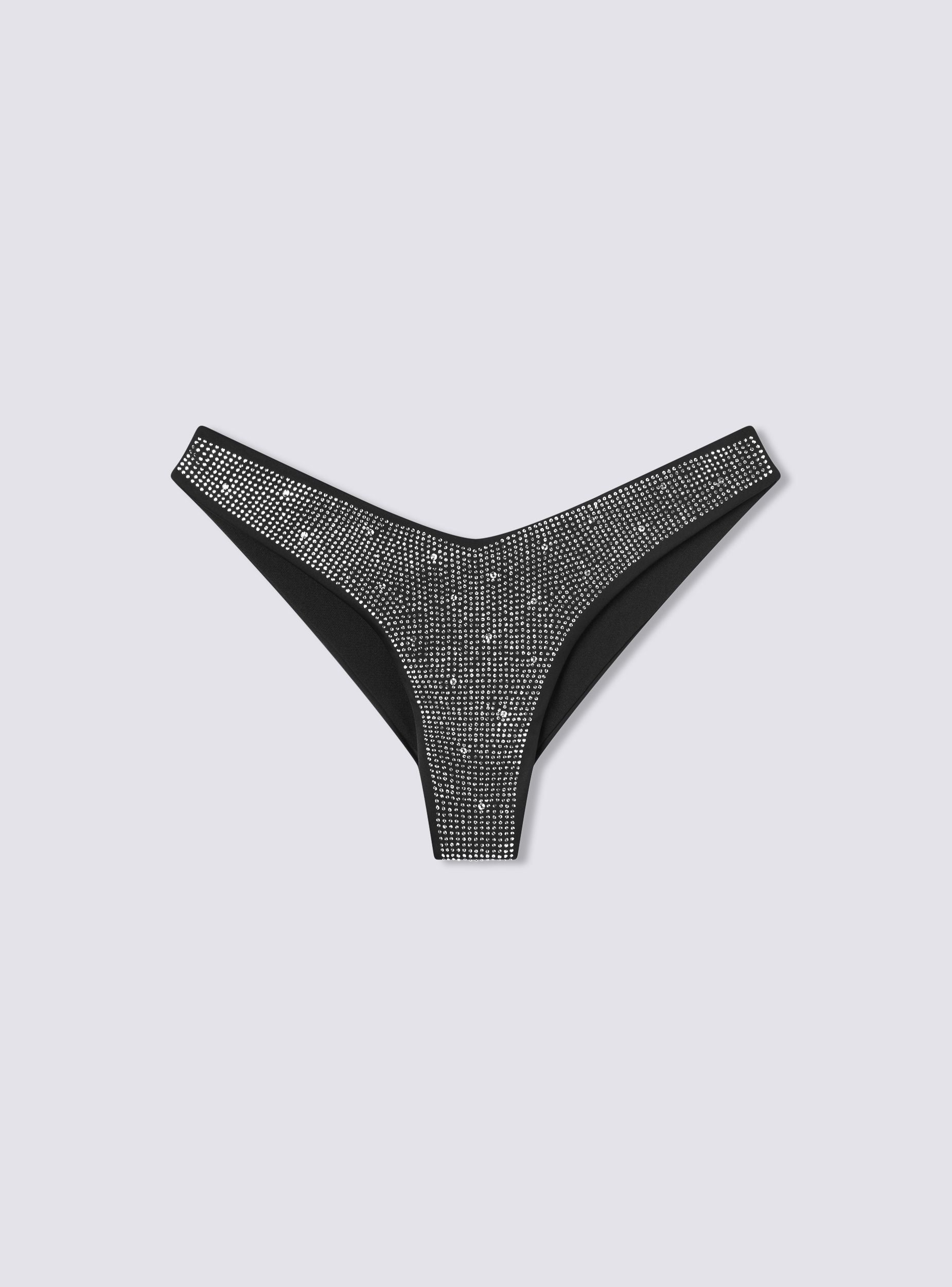 Slip da donna per bikini, perfetto per brillare in spiaggia o in piscina. Il design brasiliana con taglio v-shape esalta la silhouette, mentre gli strass applicati donano un effetto luminoso e raffinato. La tinta unita lo rende versatile e facile da abbinare a un top coordinato. Ideale con un copricostume leggero e sandali gioiello per un look estivo elegante e glamour.Dettagli