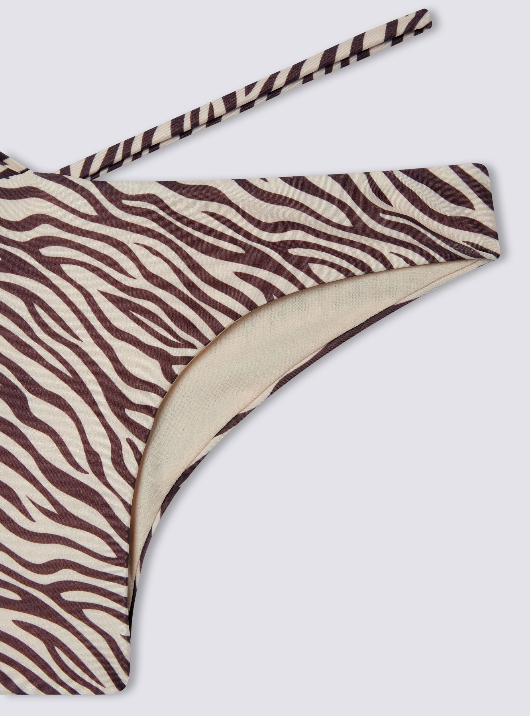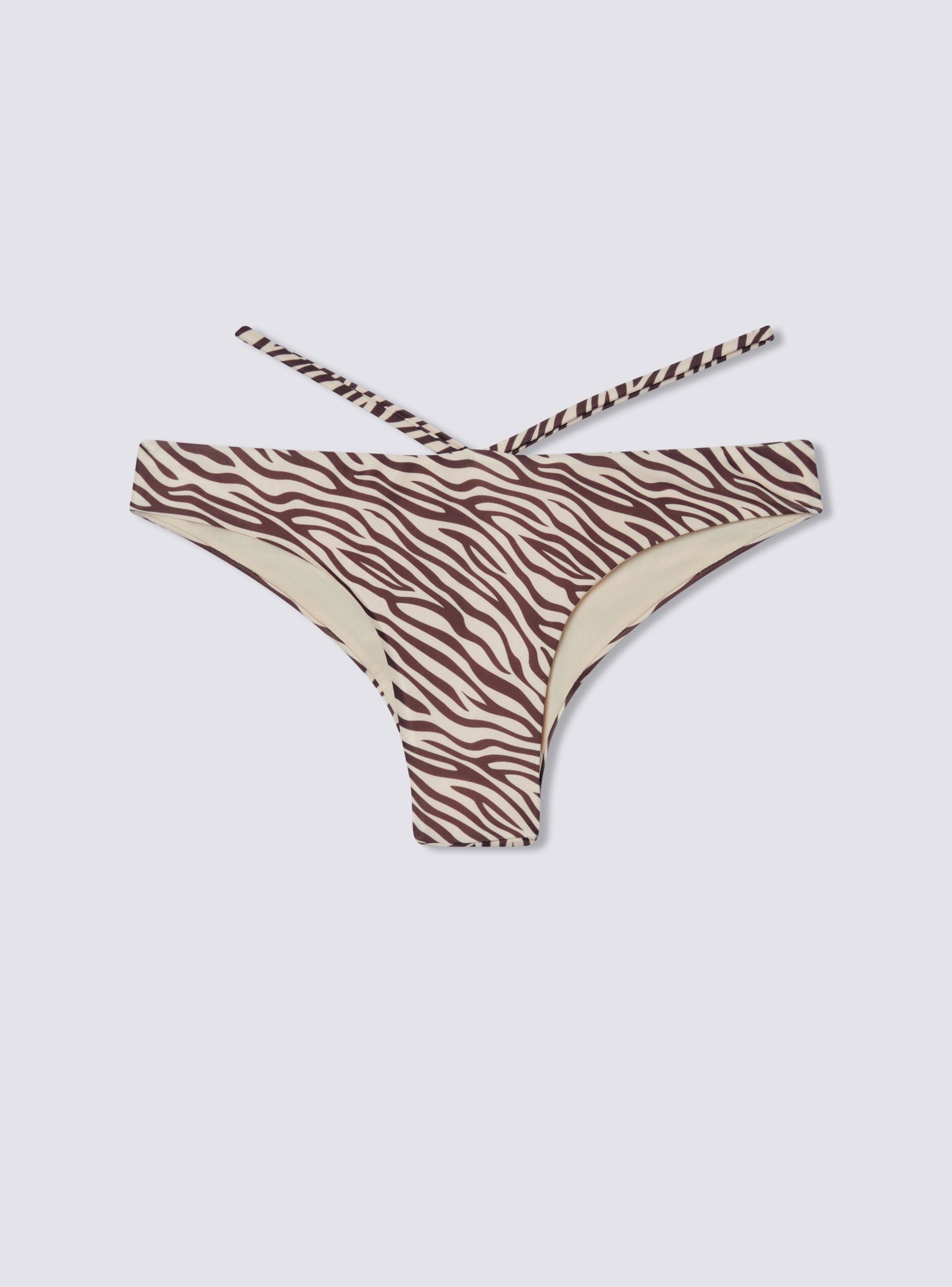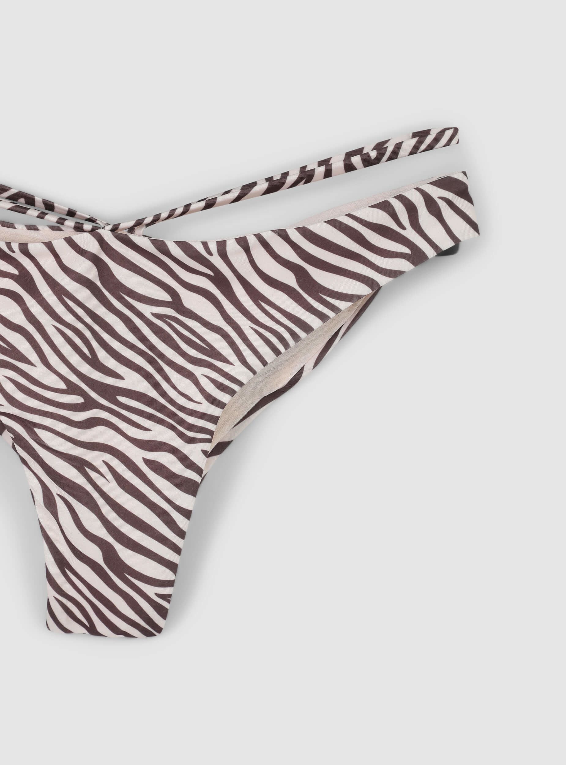 Slip da donna per bikini, perfetto per un look audace e alla moda in spiaggia o in piscina. Il design brasiliana valorizza la silhouette, mentre la stampa zebrata aggiunge un tocco grintoso e accattivante. Le stringhe laterali donano un effetto sensuale e originale. Ideale da abbinare a un top coordinato e un pareo leggero per un outfit estivo dinamico e ricco di personalità.Dettagli