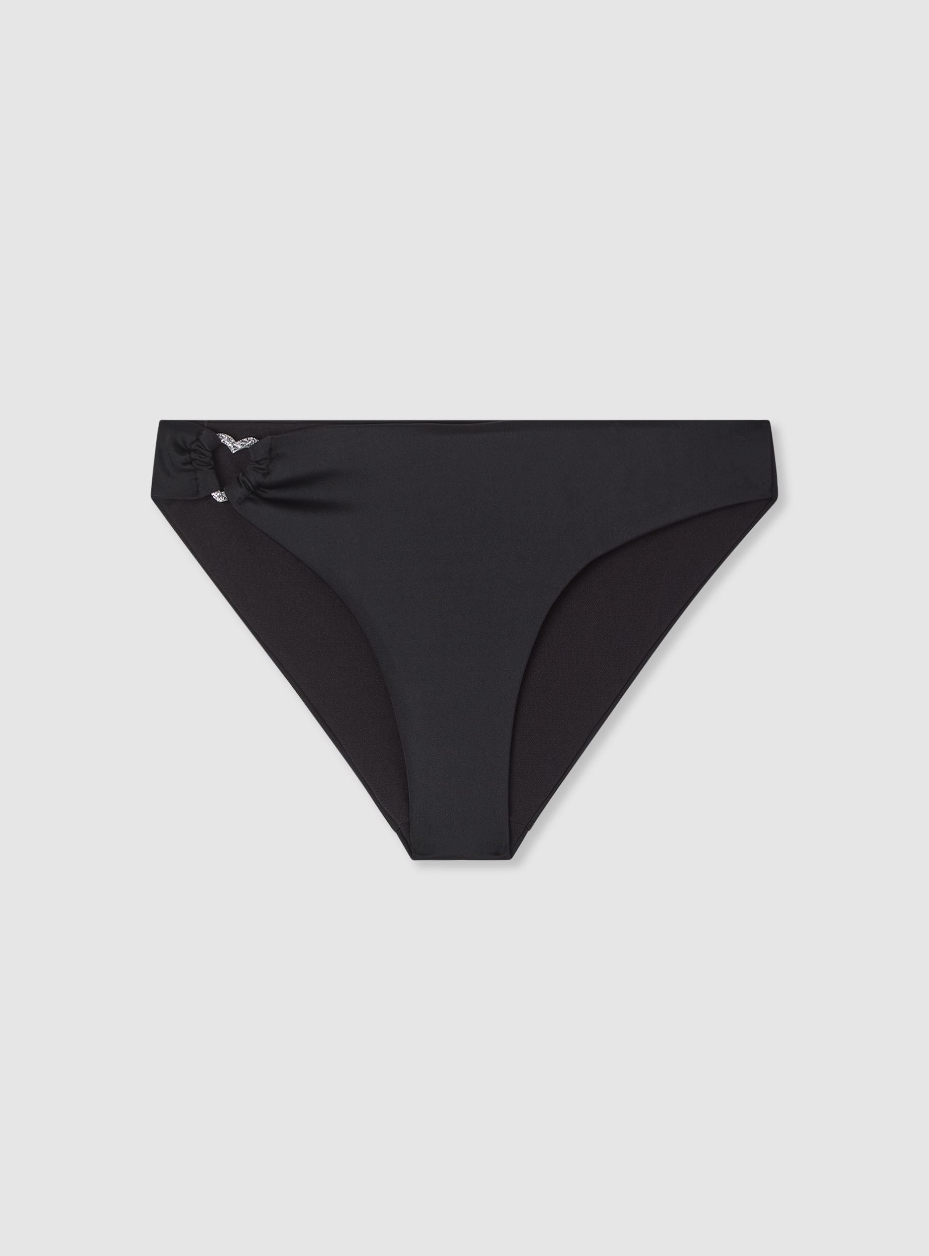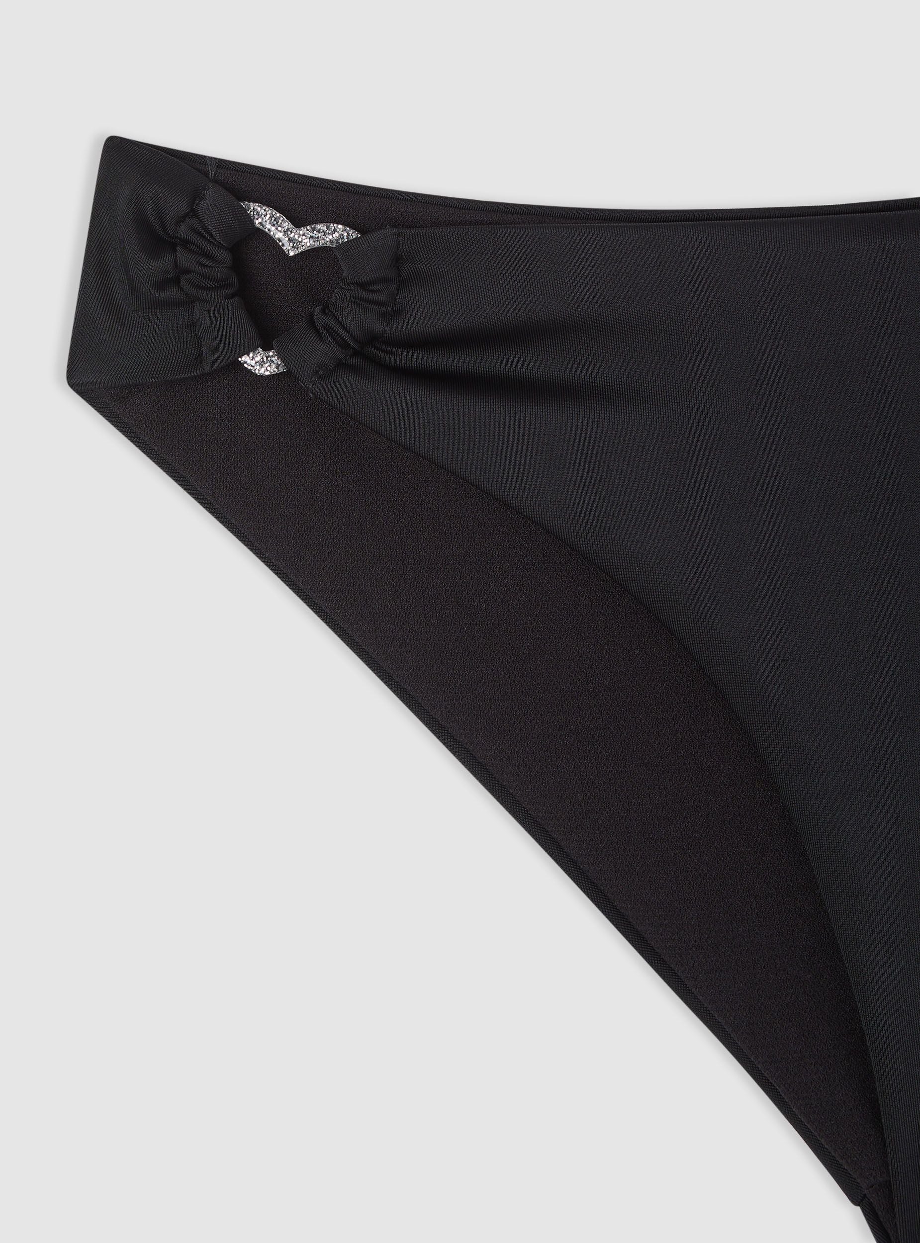 Slip bikini da donna a tinta unita pensato per mare e piscina, con vita elasticizzata e taglio regolare. Il dettaglio laterale con arricciatura e anello a forma di cuore dona un tocco femminile. Si abbina facilmente a reggiseni bikini coordinati e a un pareo per un look da spiaggia curato e versatile.Dettagli
