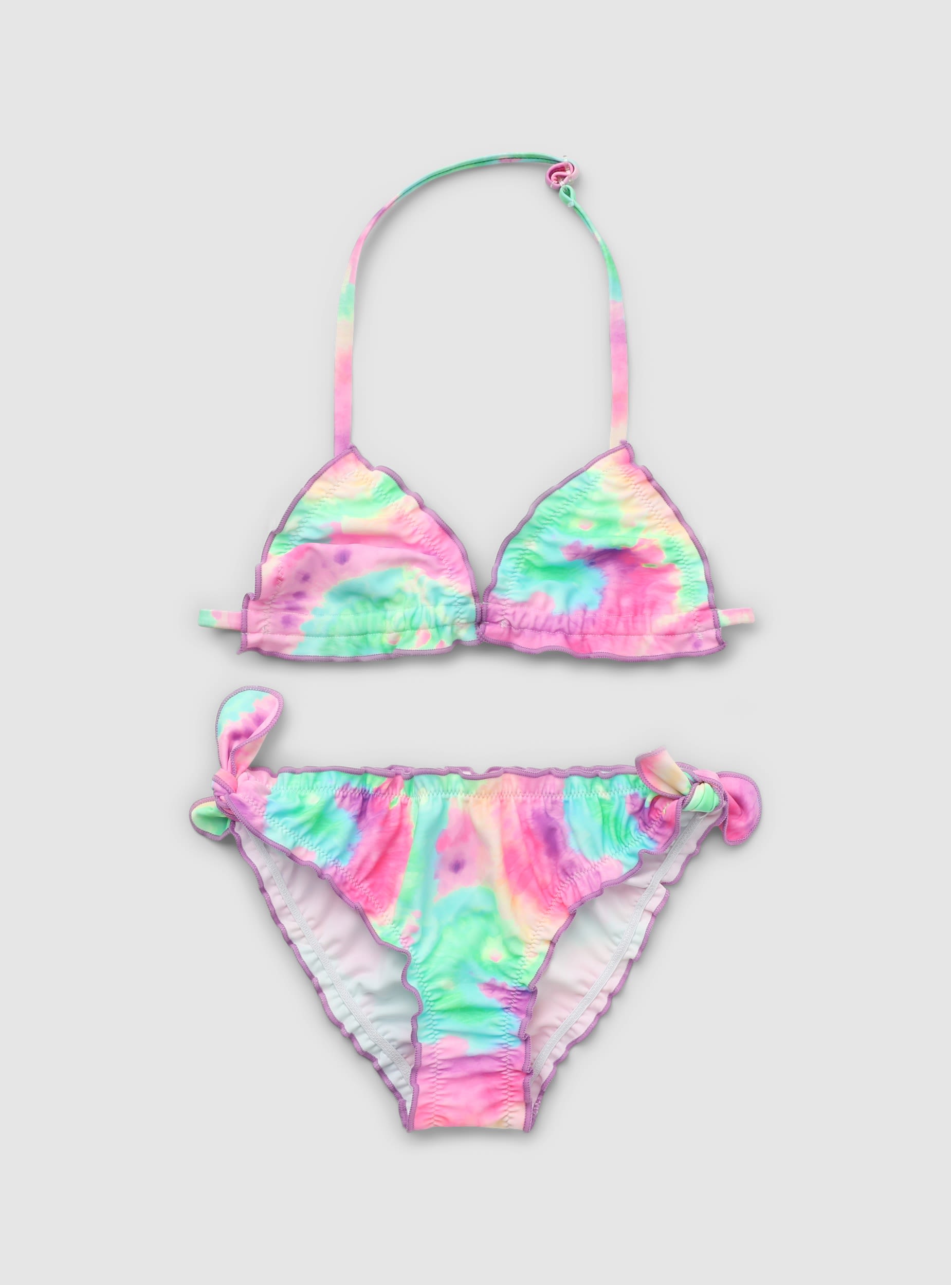Bikini da bambina con fantasia tie-dye, pensato per il mare e la piscina. Il punto vita è elasticizzato e i laccetti laterali regolabili aiutano a personalizzare la vestibilità. I bordi ondulati donano un tocco giocoso e femminile. Da abbinare a un pareo leggero per le giornate in spiaggia.Dettagli