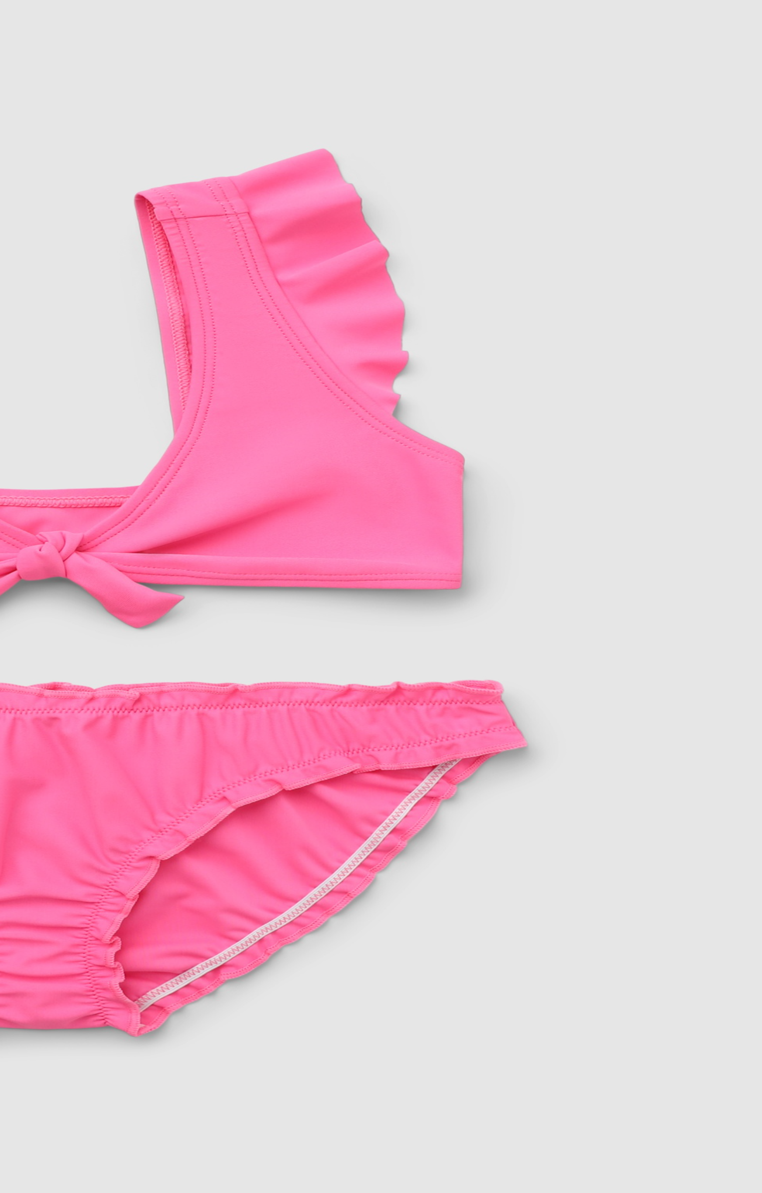Bikini da bambina a tinta unita con top a spalline larghe rifinite da volant e fiocco centrale sul davanti. Il modello si infila facilmente e offre una vestibilità comoda per gioco e nuoto. Slip coordinato con vita elasticizzata e volant lungo il bordo, ideale da abbinare a kaftano o copricostume per le giornate al mare e in piscina.Dettagli