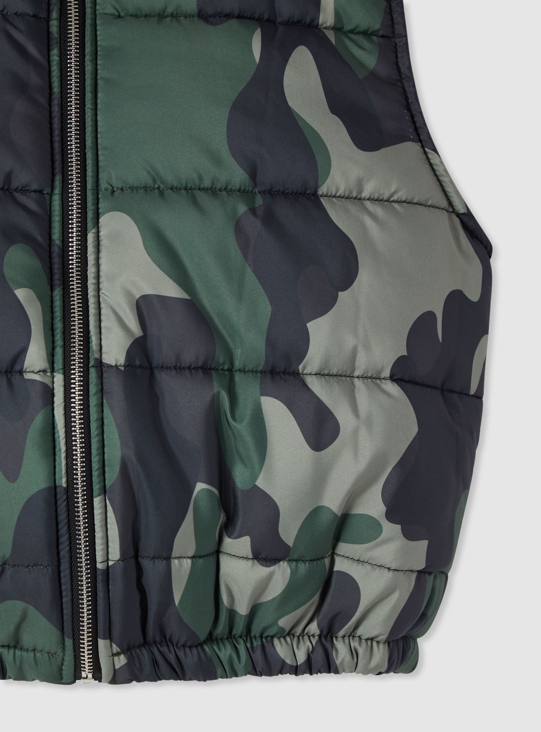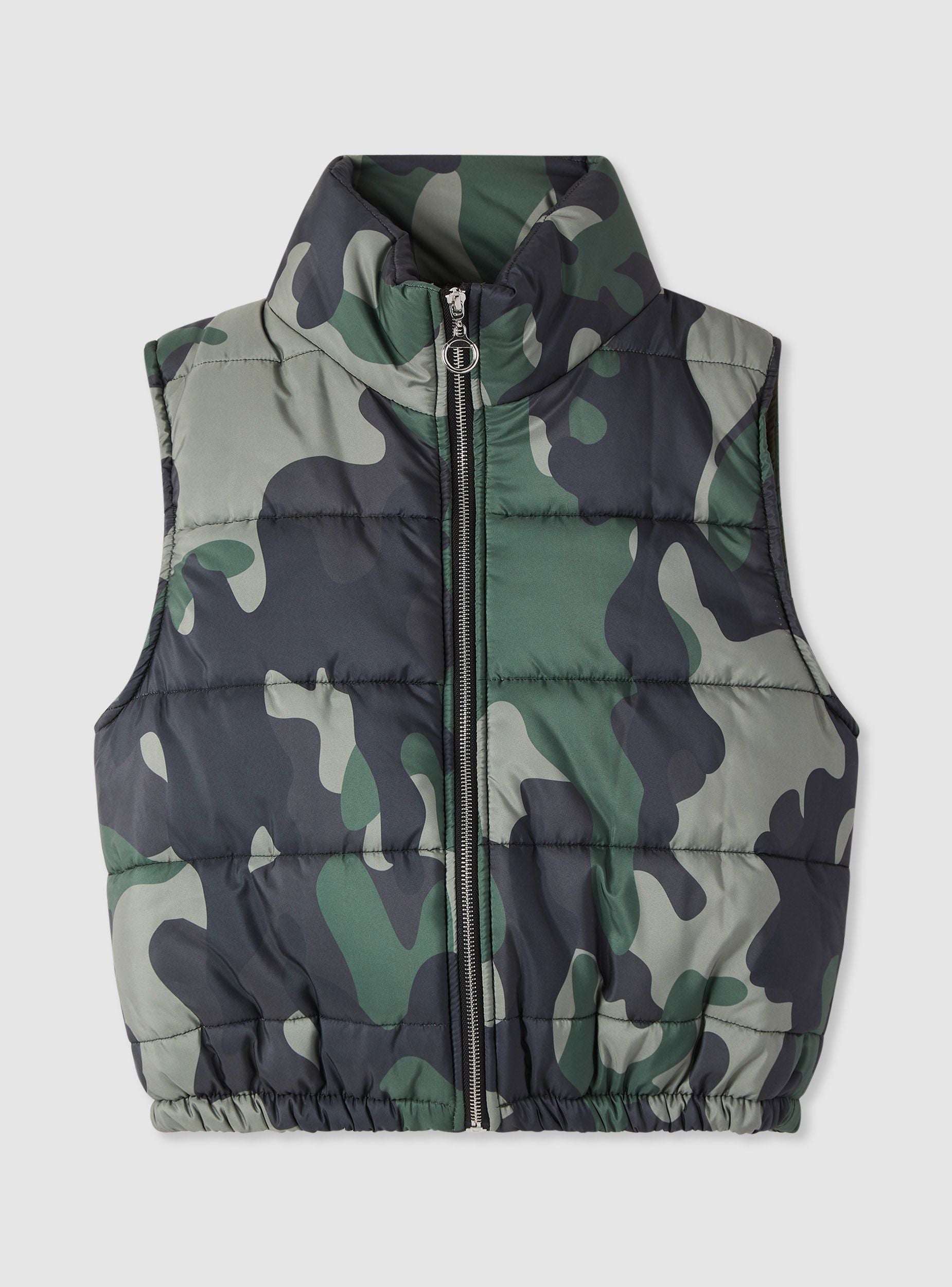 Smanicato da donna fantasia mimetica, ideale per completare look casual o trendy nelle mezze stagioni. Collo alto e chiusura frontale con zip. Fondo con bordo elasticizzato che assicura una vestibilità confortevole e valorizza la silhouette. Perfetto sopra maglietta o felpa per creare sovrapposizioni pratiche e di carattere, aggiunge un tocco deciso a jeans e pantaloni.Dettagli