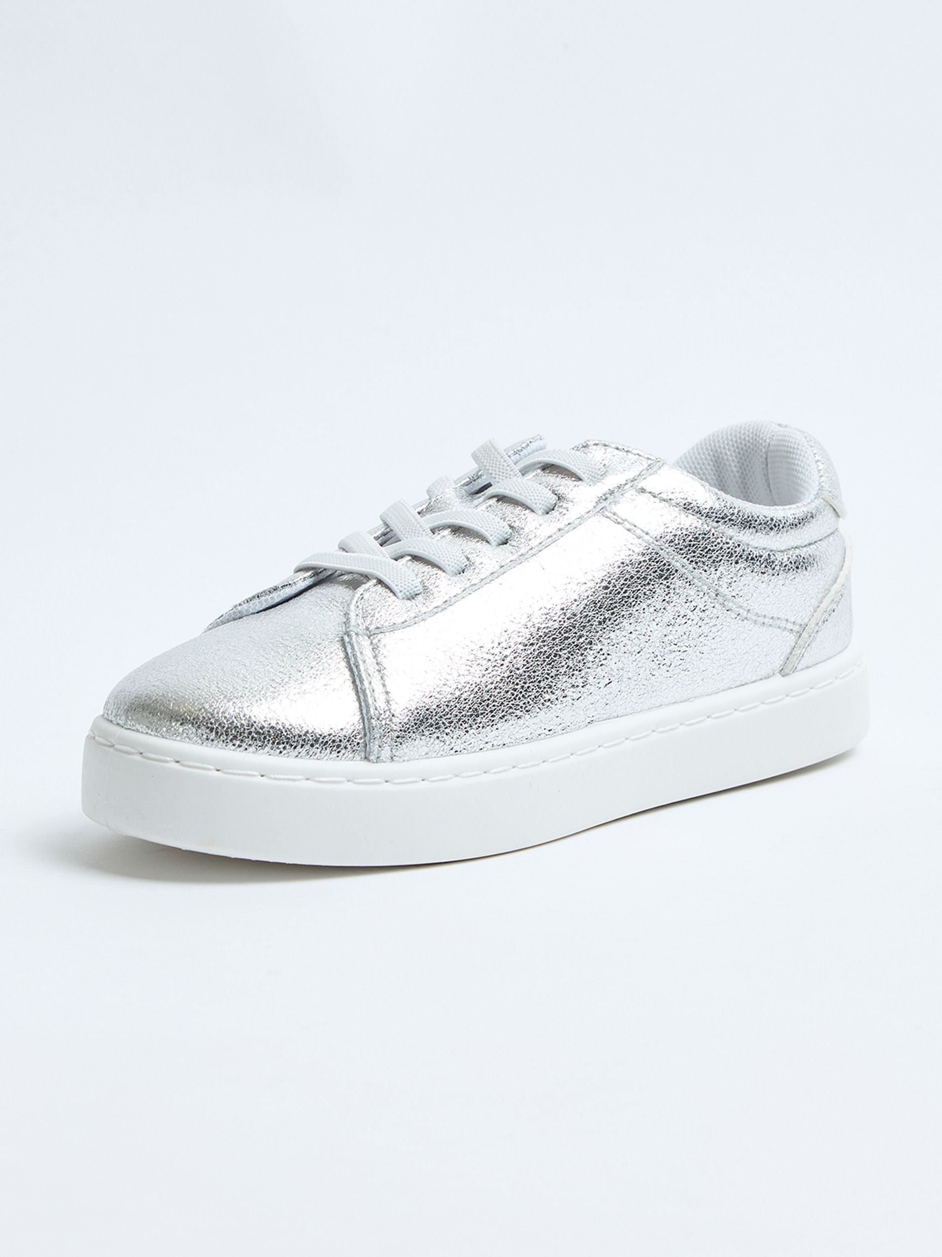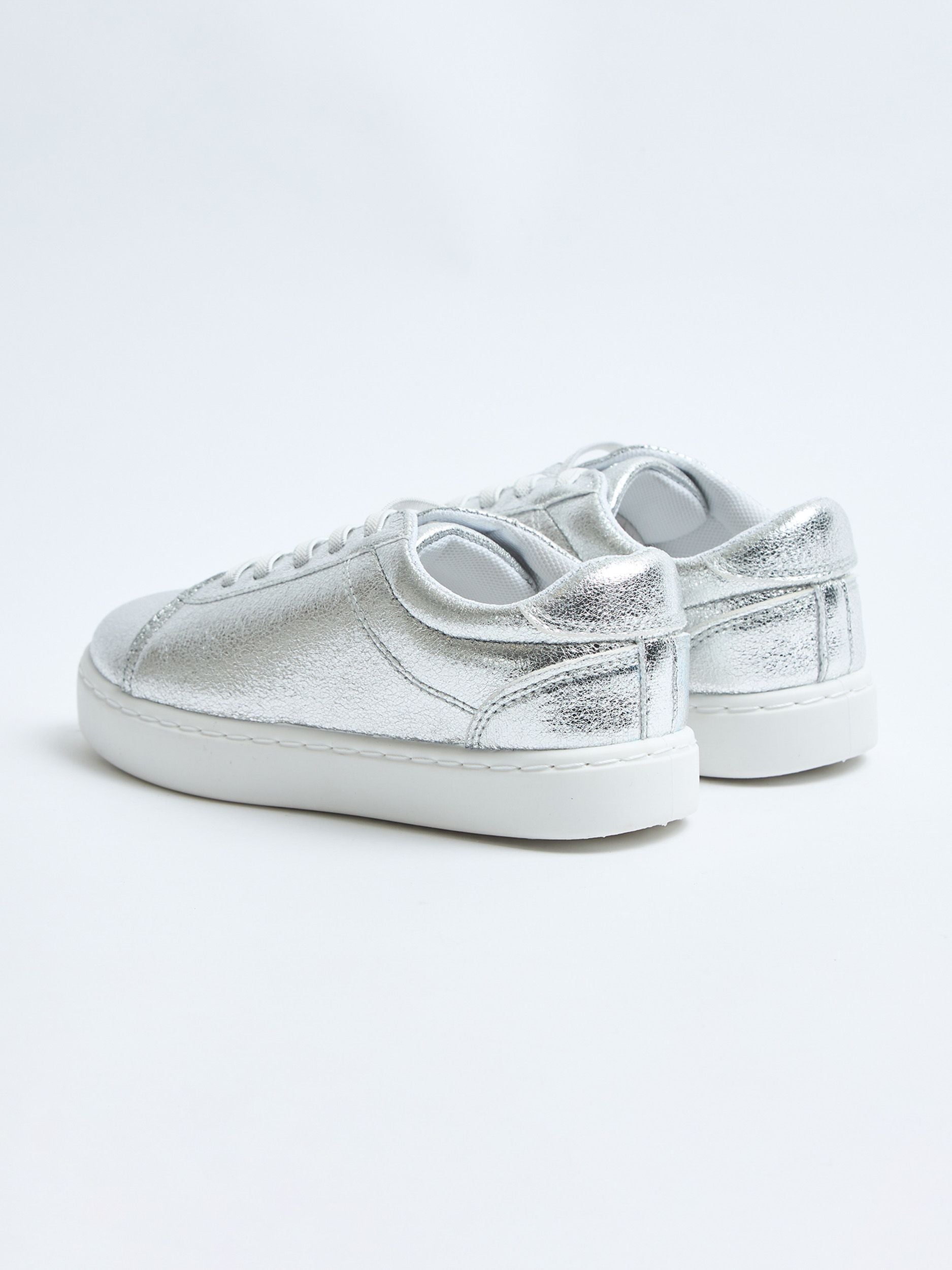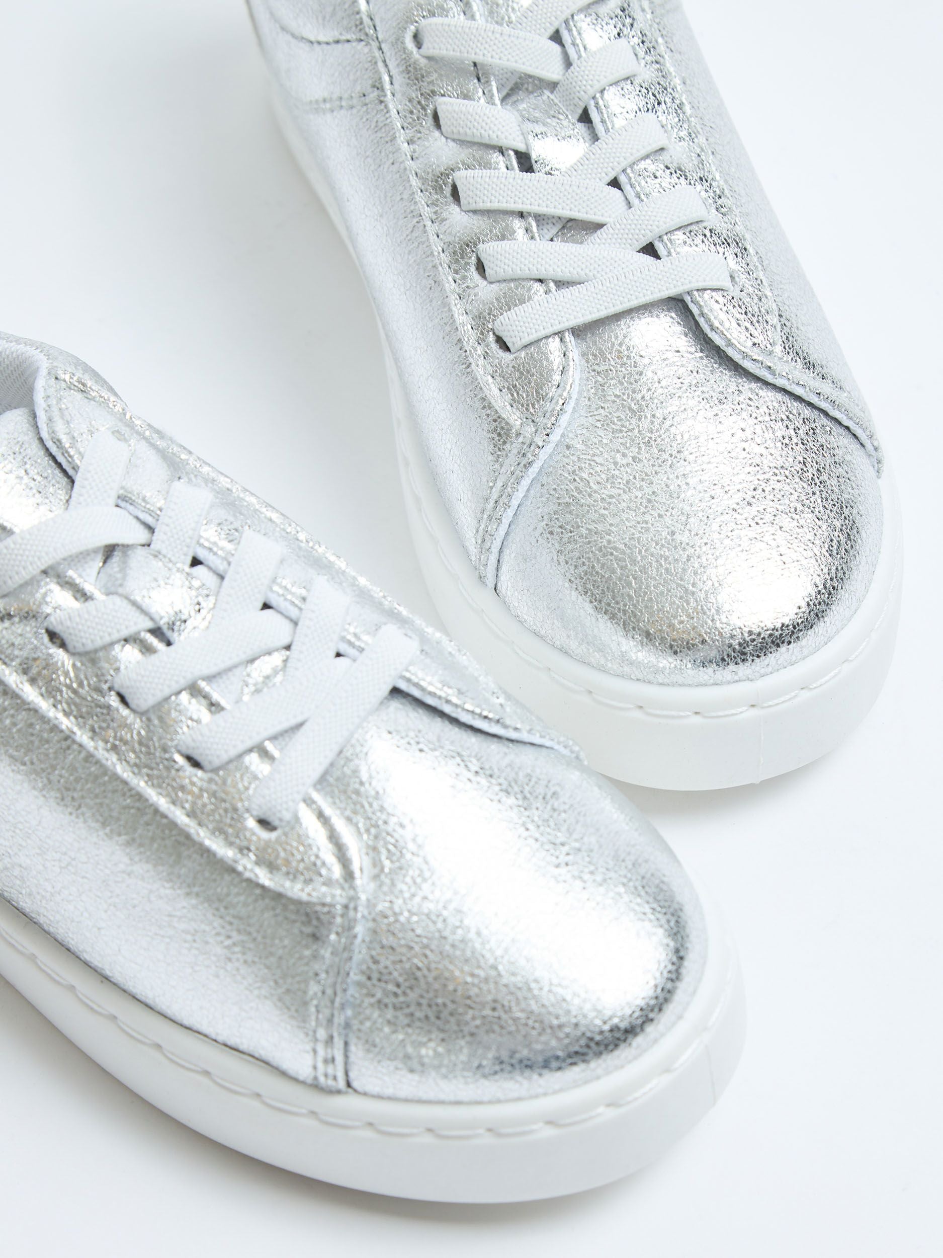 Scarpe basse da bambina, modello sneaker, in similpelle effetto laminato, con chiusura con lacci.Dettagli