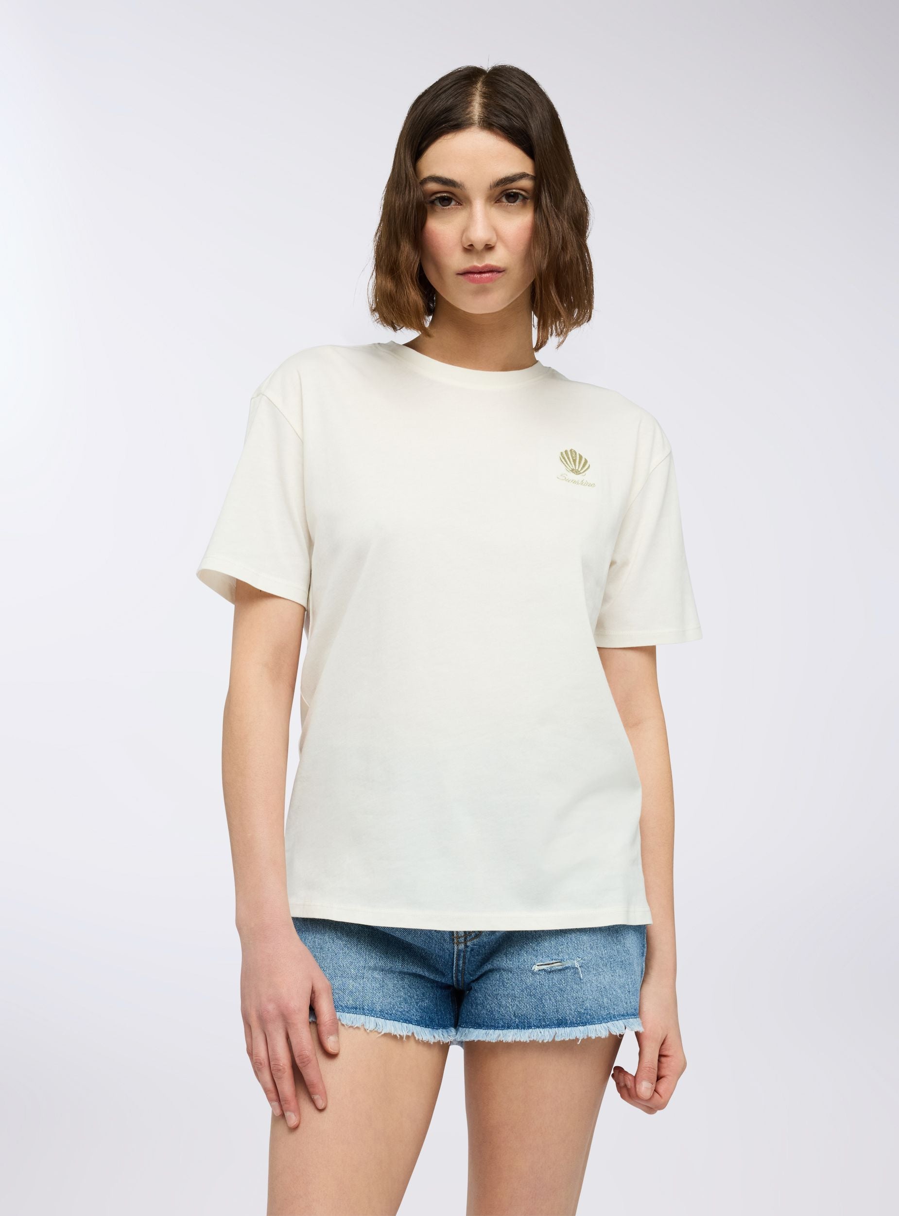 Maglietta da donna ampia e dal design contemporaneo, perfetta per chi ama uno stile rilassato ma con dettagli ricercati. Le maniche corte e il girocollo la rendono un capo versatile, ideale per ogni occasione informale. Il ricamo con effetto luccicante aggiunge un tocco di luce e personalità, rendendola perfetta da abbinare a jeans, shorts o gonne per un look trendy e sofisticato.Dettagli