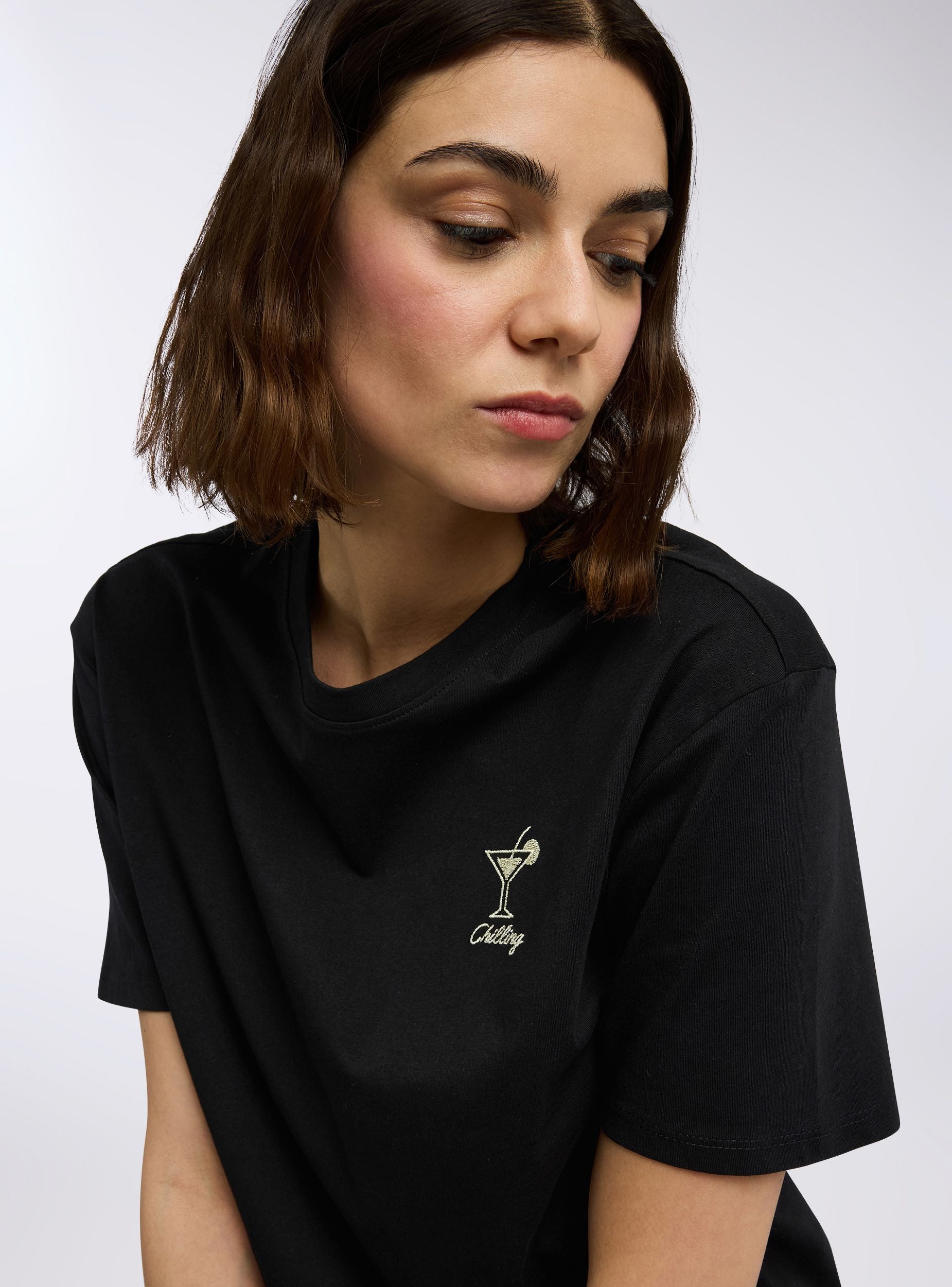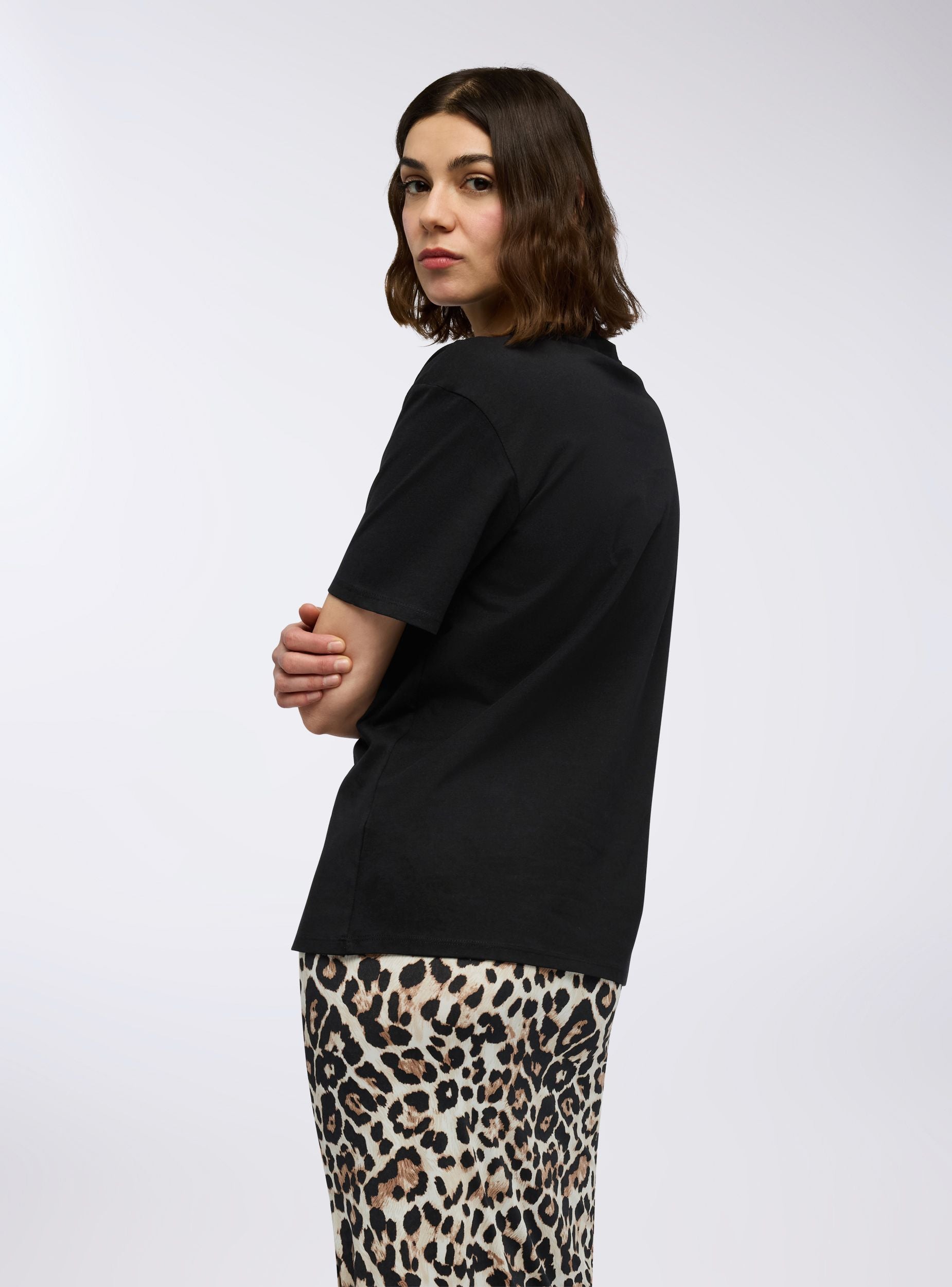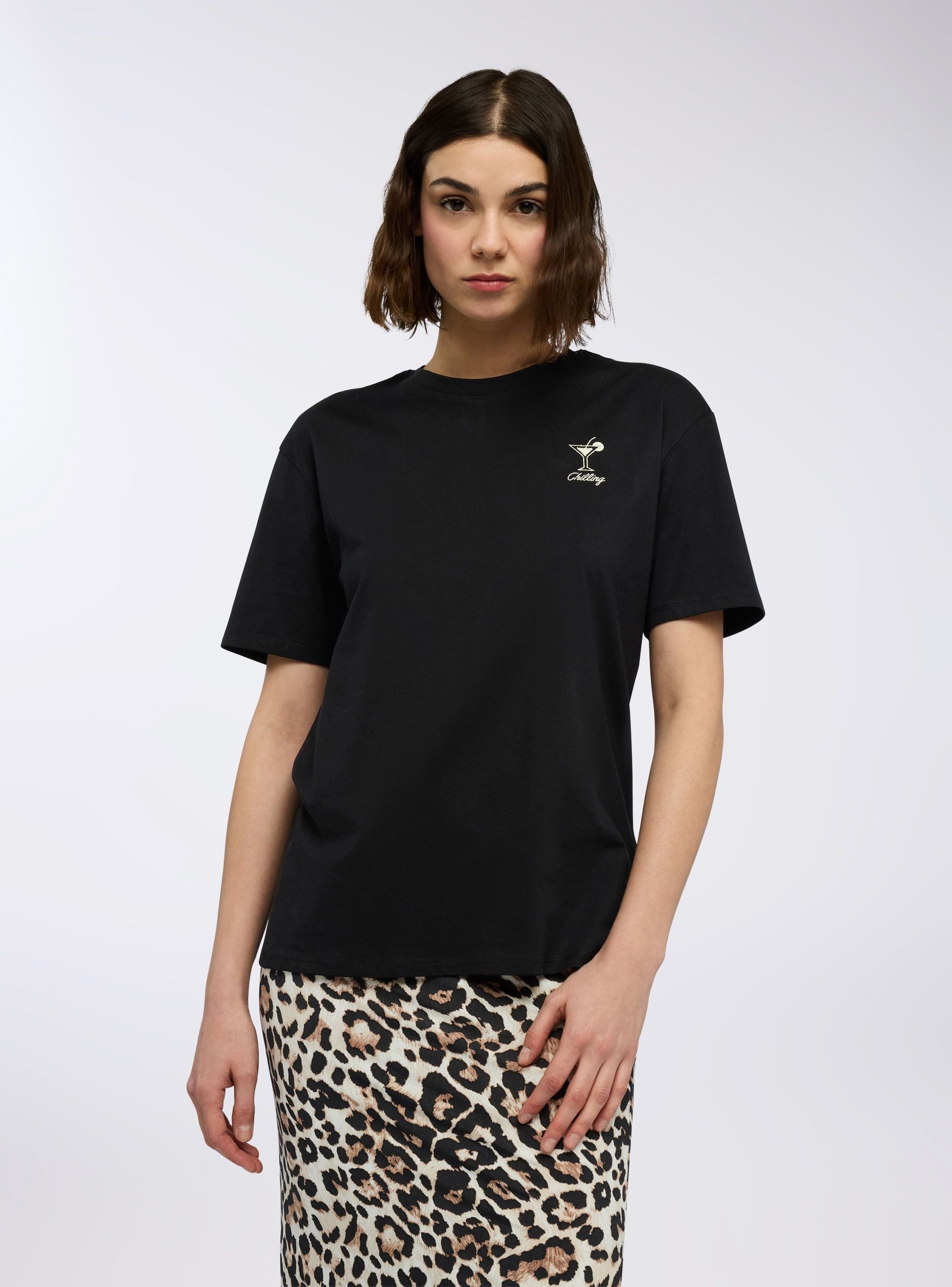 Maglietta da donna ampia e dal design contemporaneo, perfetta per chi ama uno stile rilassato ma con dettagli ricercati. Le maniche corte e il girocollo la rendono un capo versatile, ideale per ogni occasione informale. Il ricamo con effetto luccicante aggiunge un tocco di luce e personalità, rendendola perfetta da abbinare a jeans, shorts o gonne per un look trendy e sofisticato.Dettagli