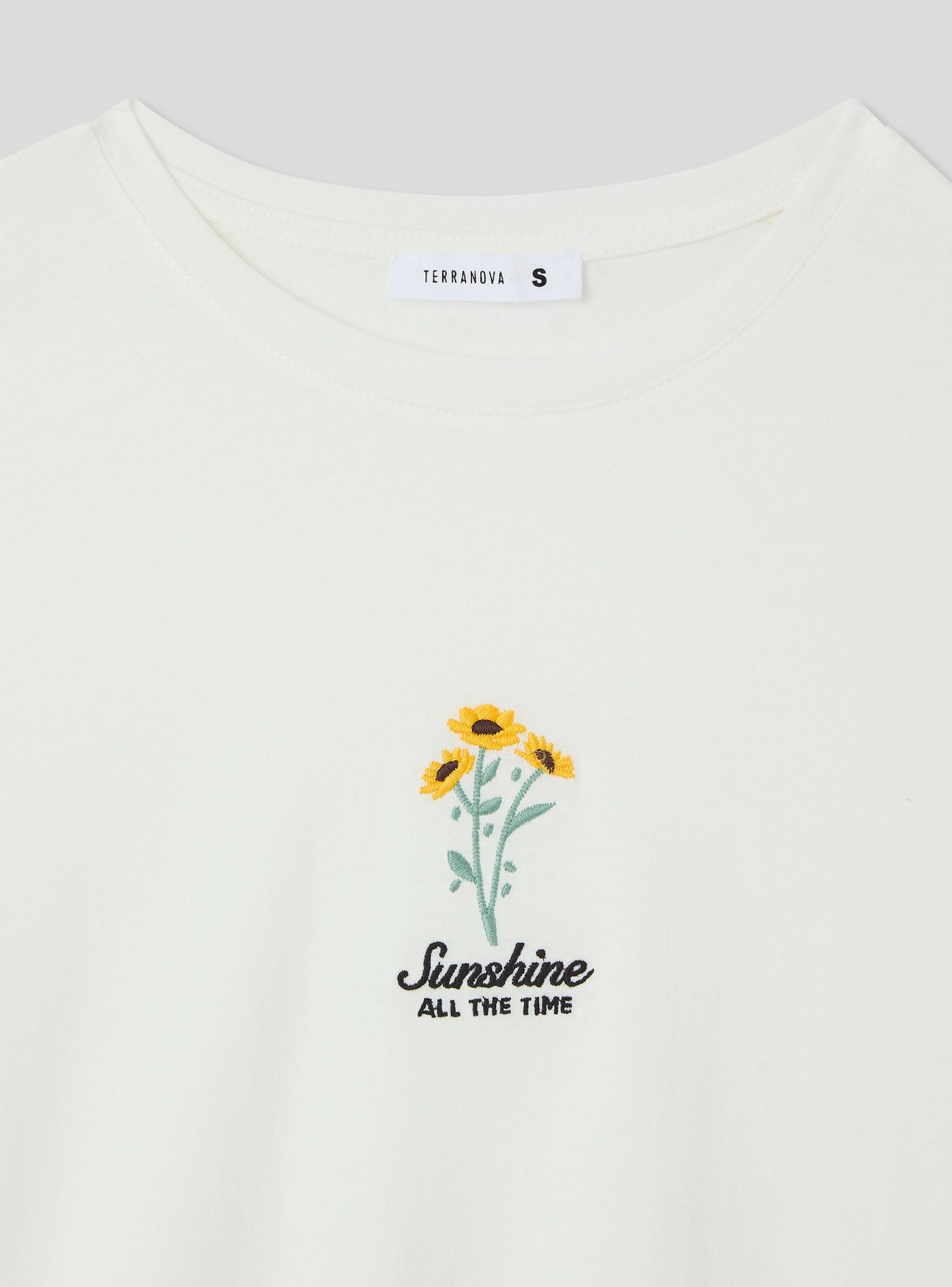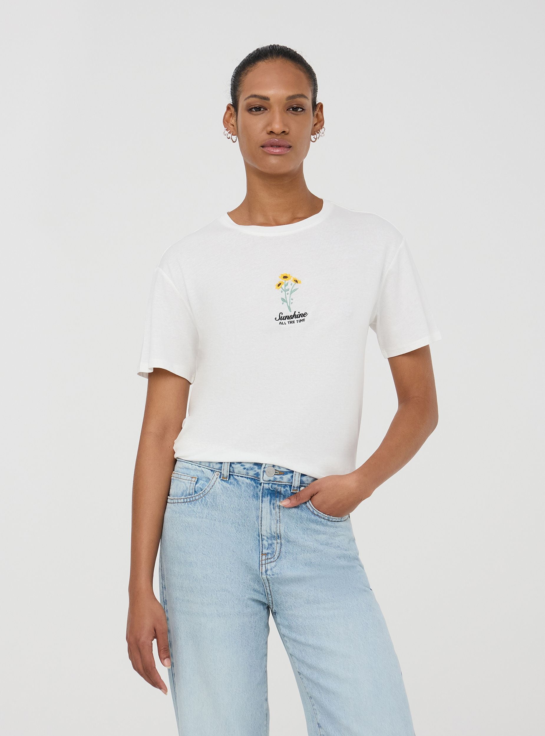 Maglietta da donna ampia con maniche corte e girocollo. Il capo presenta un ricamo floreale di piccole dimensioni sul davanti, accompagnato da una scritta decorativa. Questo modello combina uno stile casual con un tocco raffinato, ideale per chi cerca un look estivo confortevole ma curato nei dettagli. Perfetta per un abbigliamento quotidiano che unisce praticità e stile.Dettagli