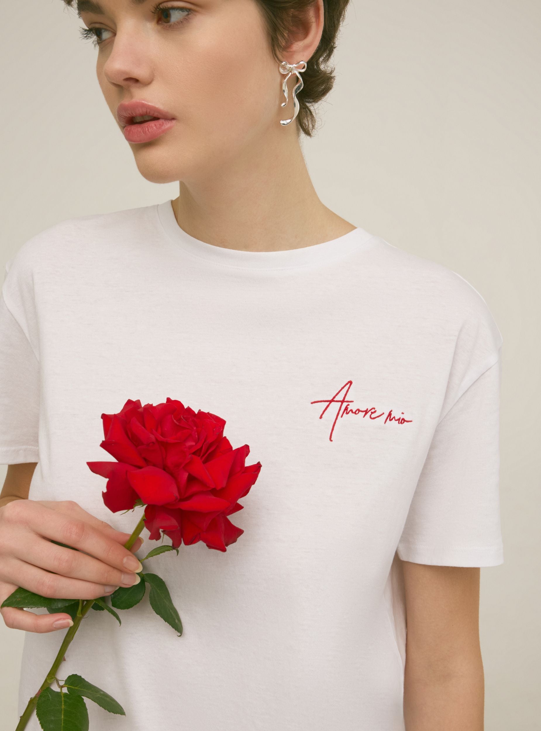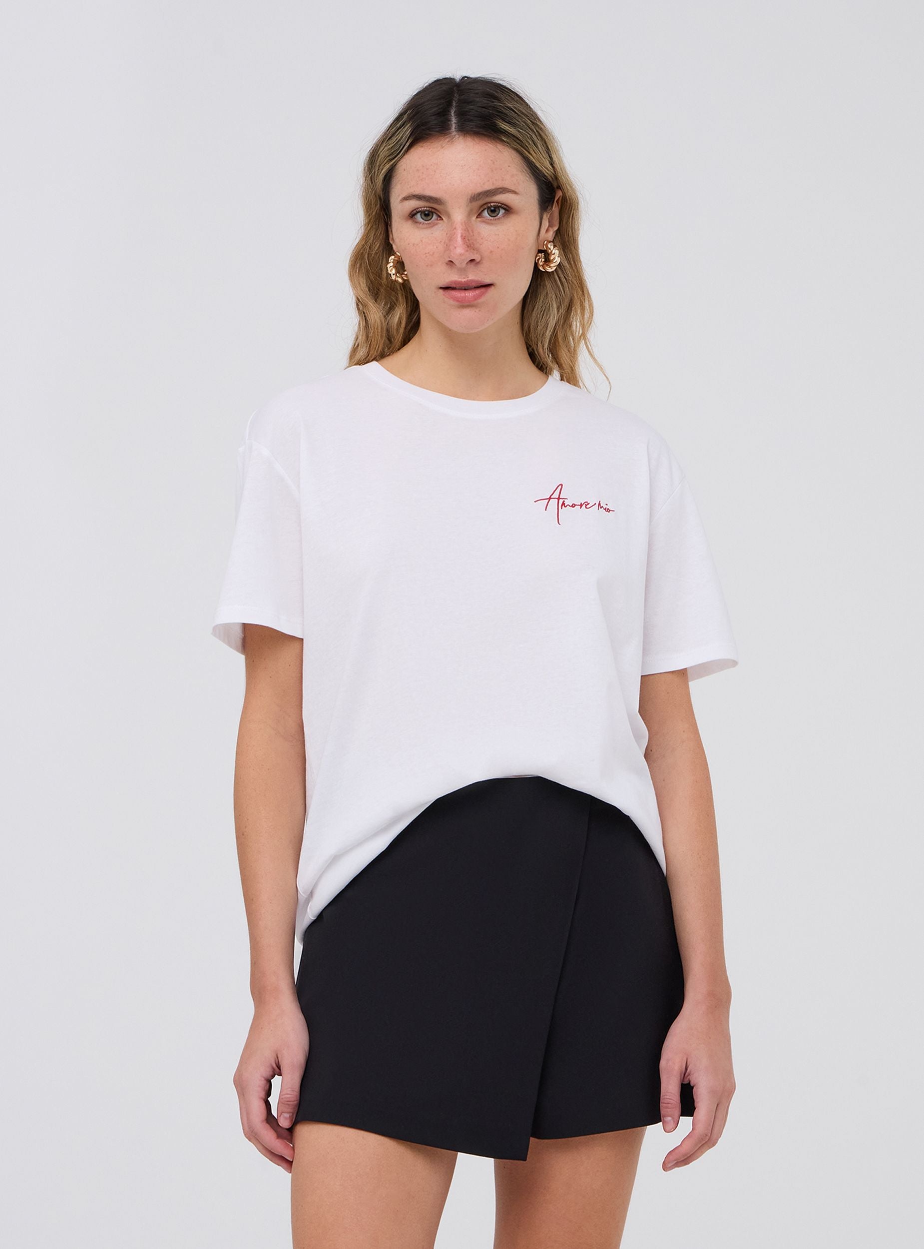 Maglietta da donna dal taglio ampio, con girocollo e maniche corte, ideale per un look casual e comodo. Il dettaglio distintivo di questa maglietta è il ricamo laterale sul davanti, che aggiunge un tocco di originalità e stile discreto. Perfetta per essere abbinata a diversi outfit quotidiani, è una scelta versatile per chi desidera un capo semplice ma con un dettaglio raffinato.Dettagli