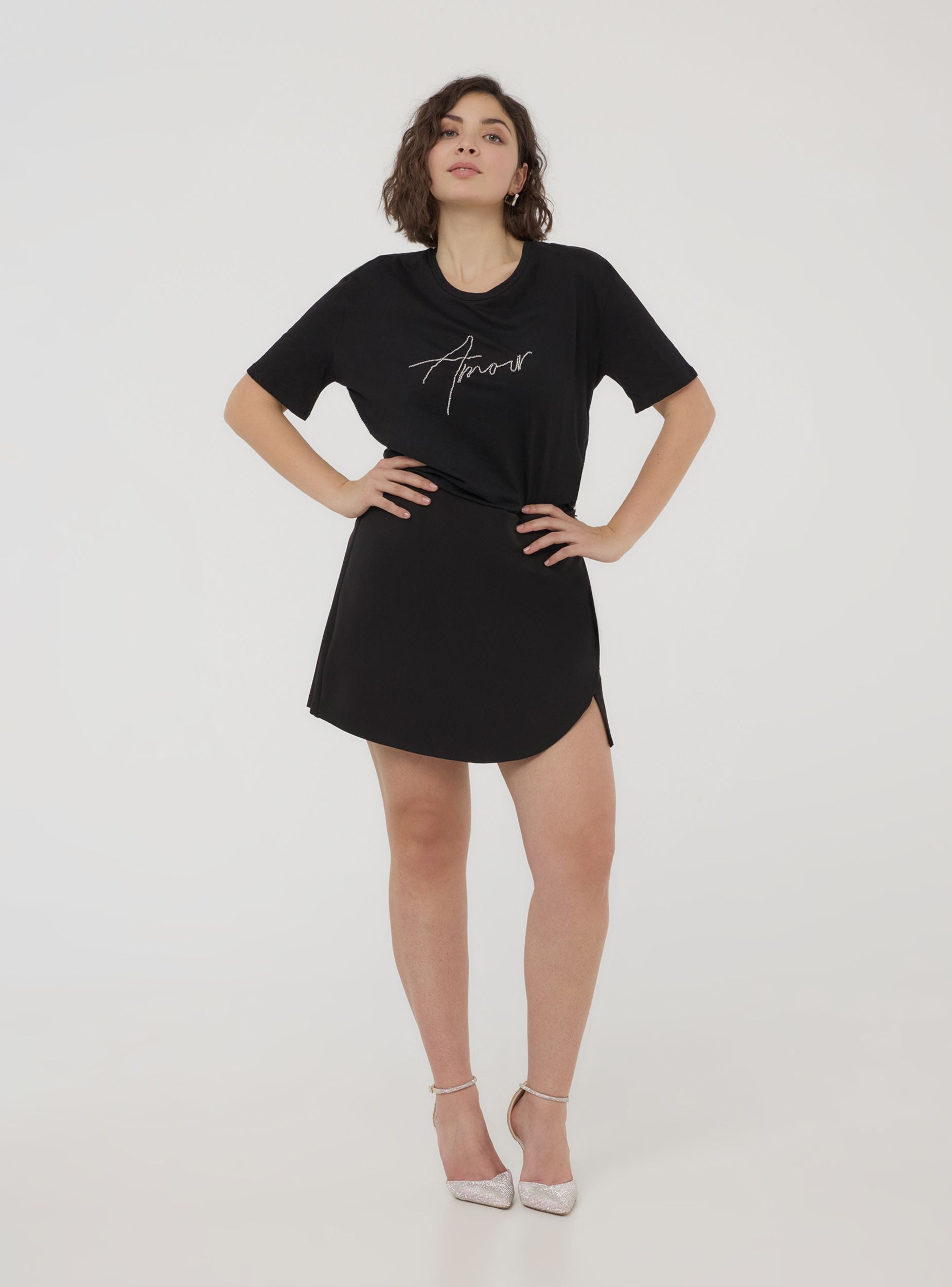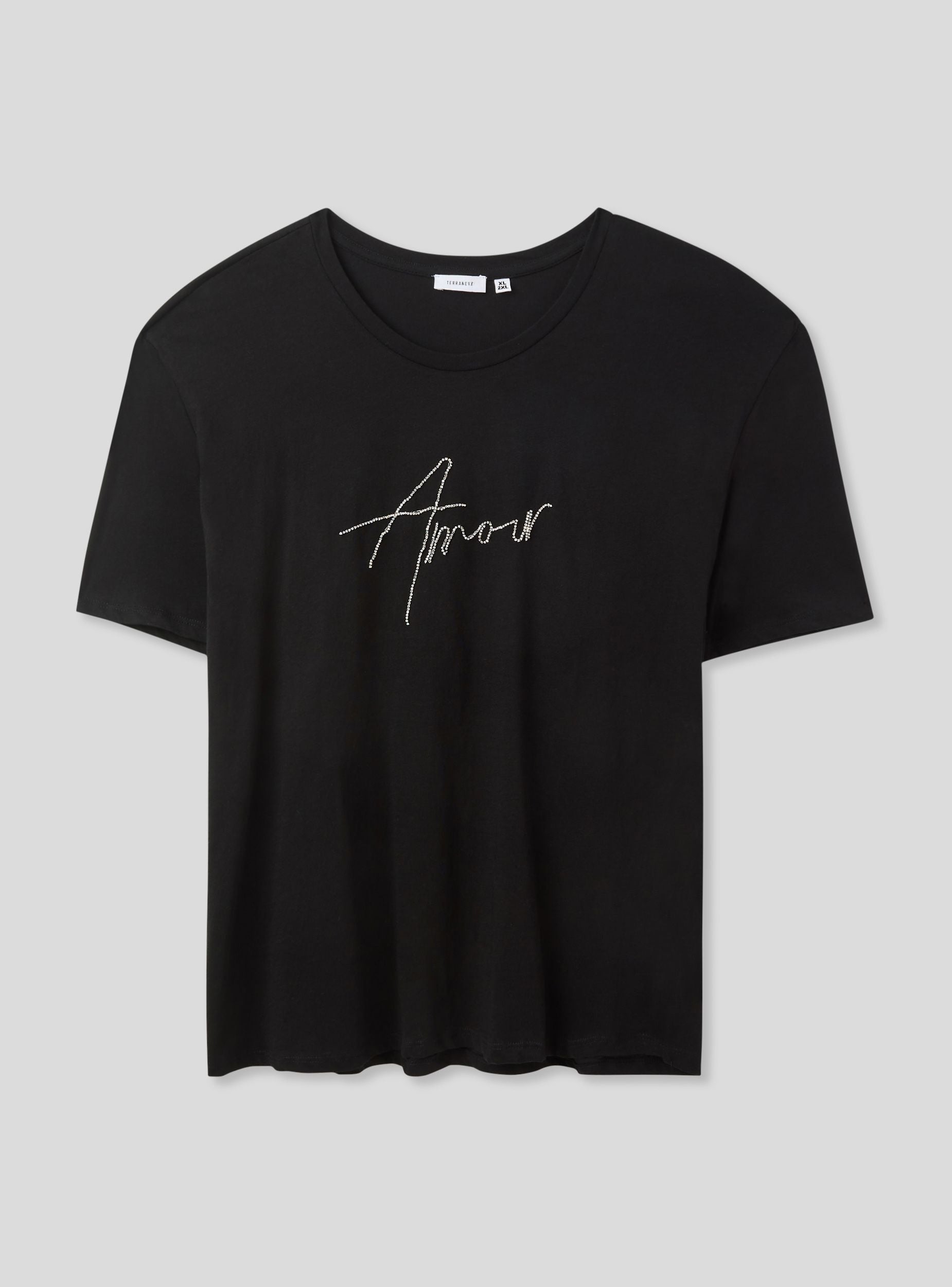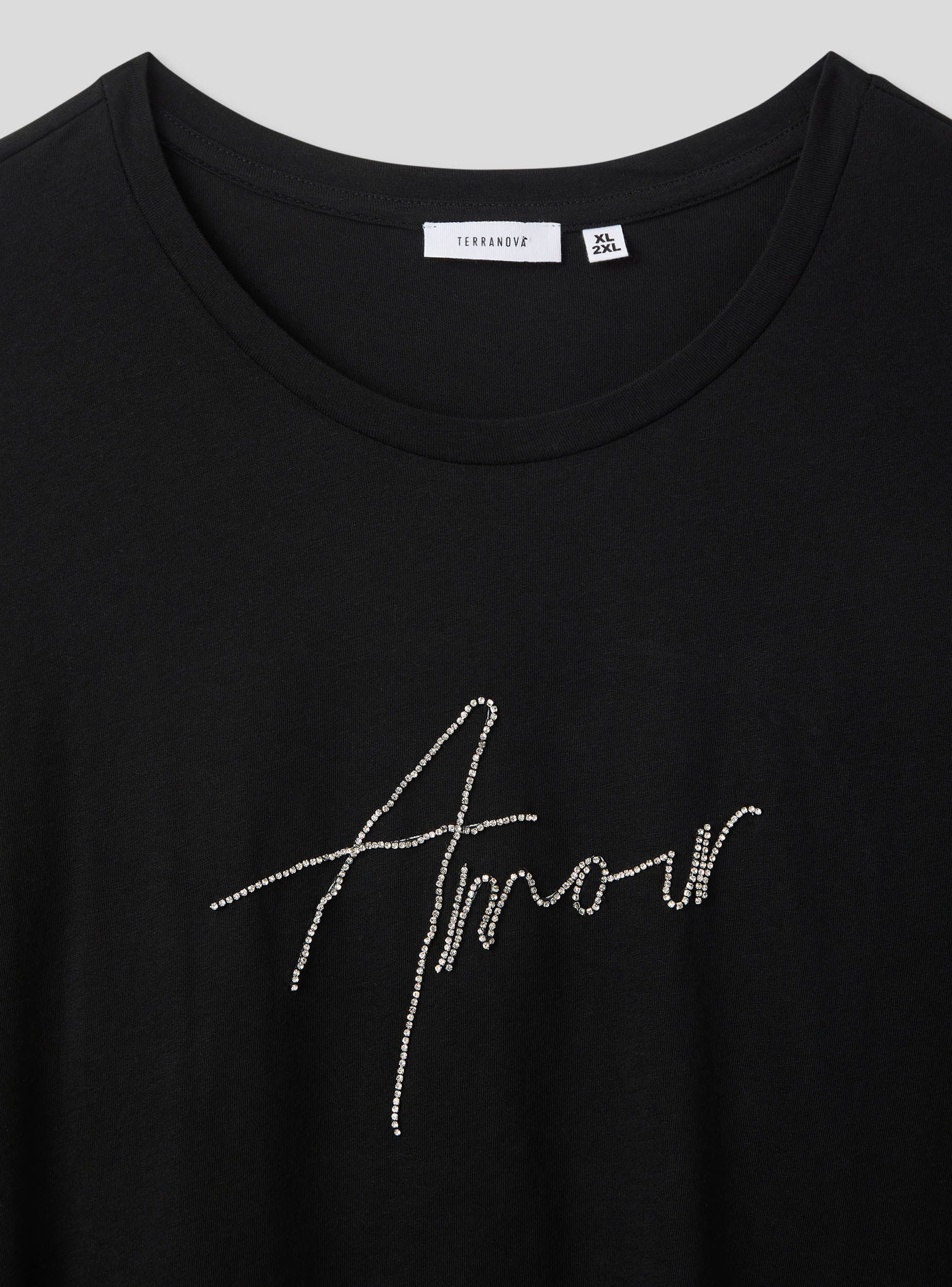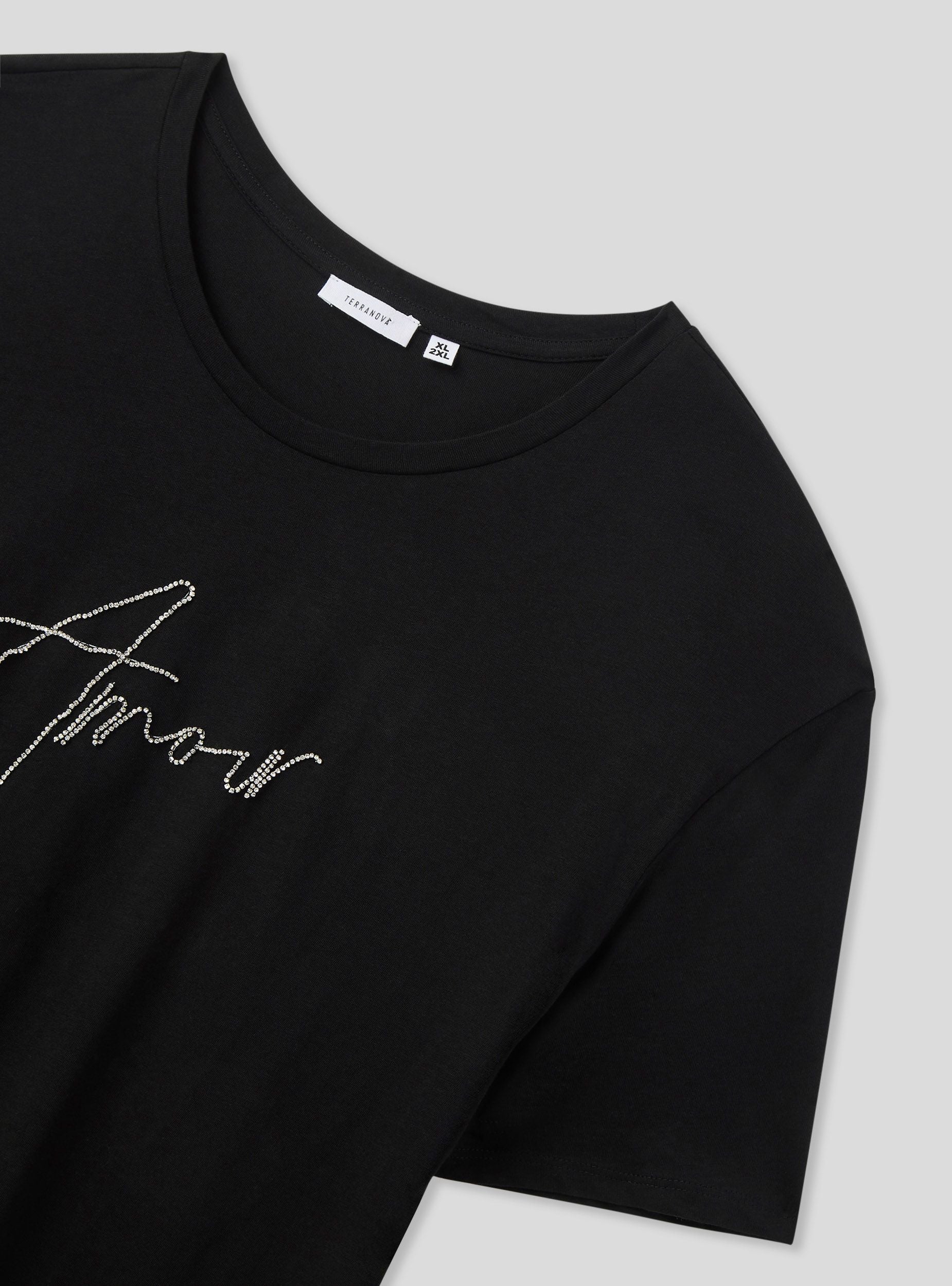 Maglietta ampia da donna ideale per un look casual-chic, perfetta per una serata informale o un'uscita con amici. Il design presenta una tinta unita arricchita da una scritta con strass che dona un tocco brillante e raffinato. Completa di maniche corte e girocollo, garantisce comfort e stile in ogni occasione. Abbinabile a jeans o gonne per un outfit versatile.Dettagli