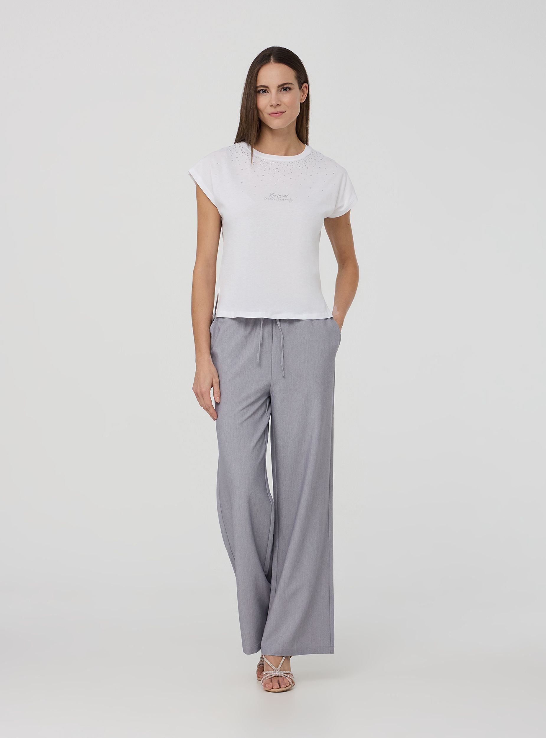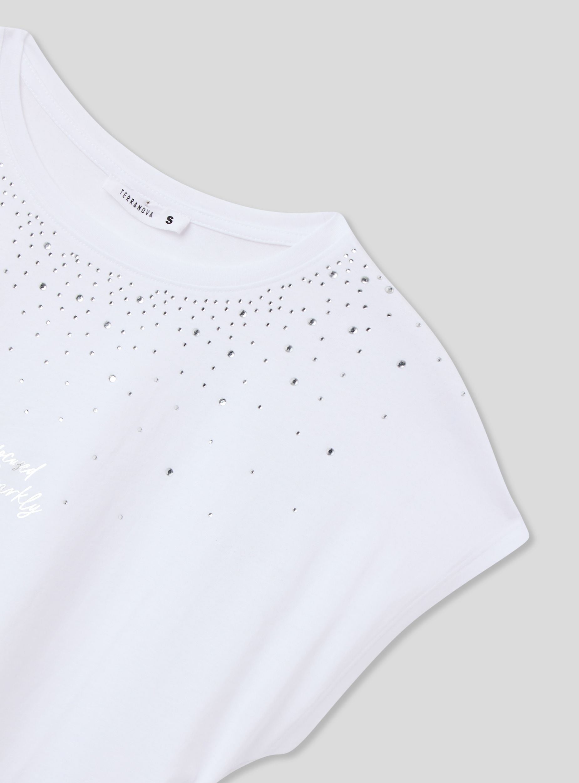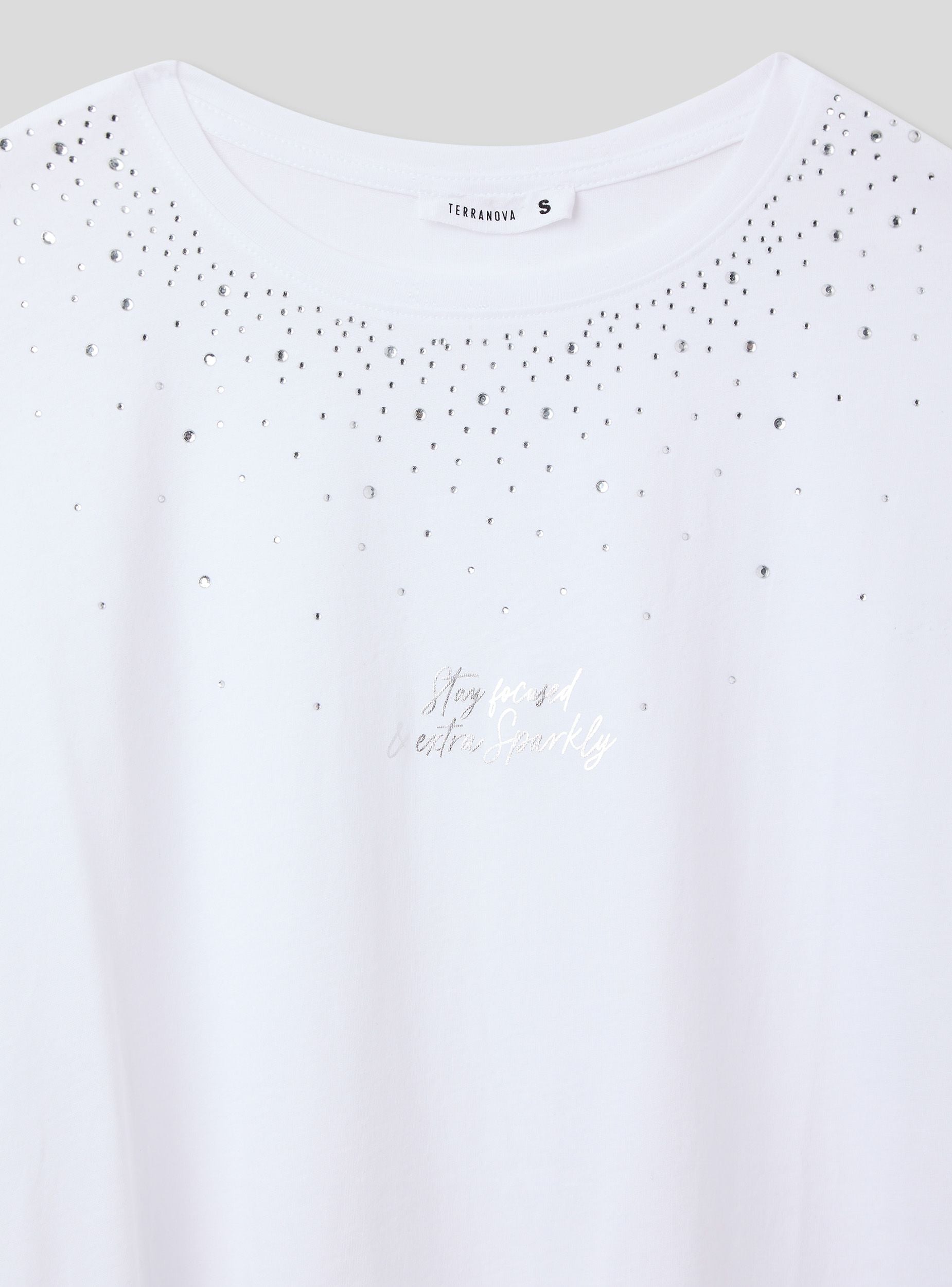 Maglietta da donna ampia, caratterizzata da un girocollo e maniche corte. Il design presenta una combinazione di strass che decorano la parte superiore del capo, creando un effetto luminoso e accattivante. Sul davanti, una scritta aggiunge un tocco distintivo. Questo capo è ideale per chi cerca un look casual ma con dettagli sofisticati, perfetto per arricchire qualsiasi outfit quotidiano con un tocco di originalità e luce.Dettagli