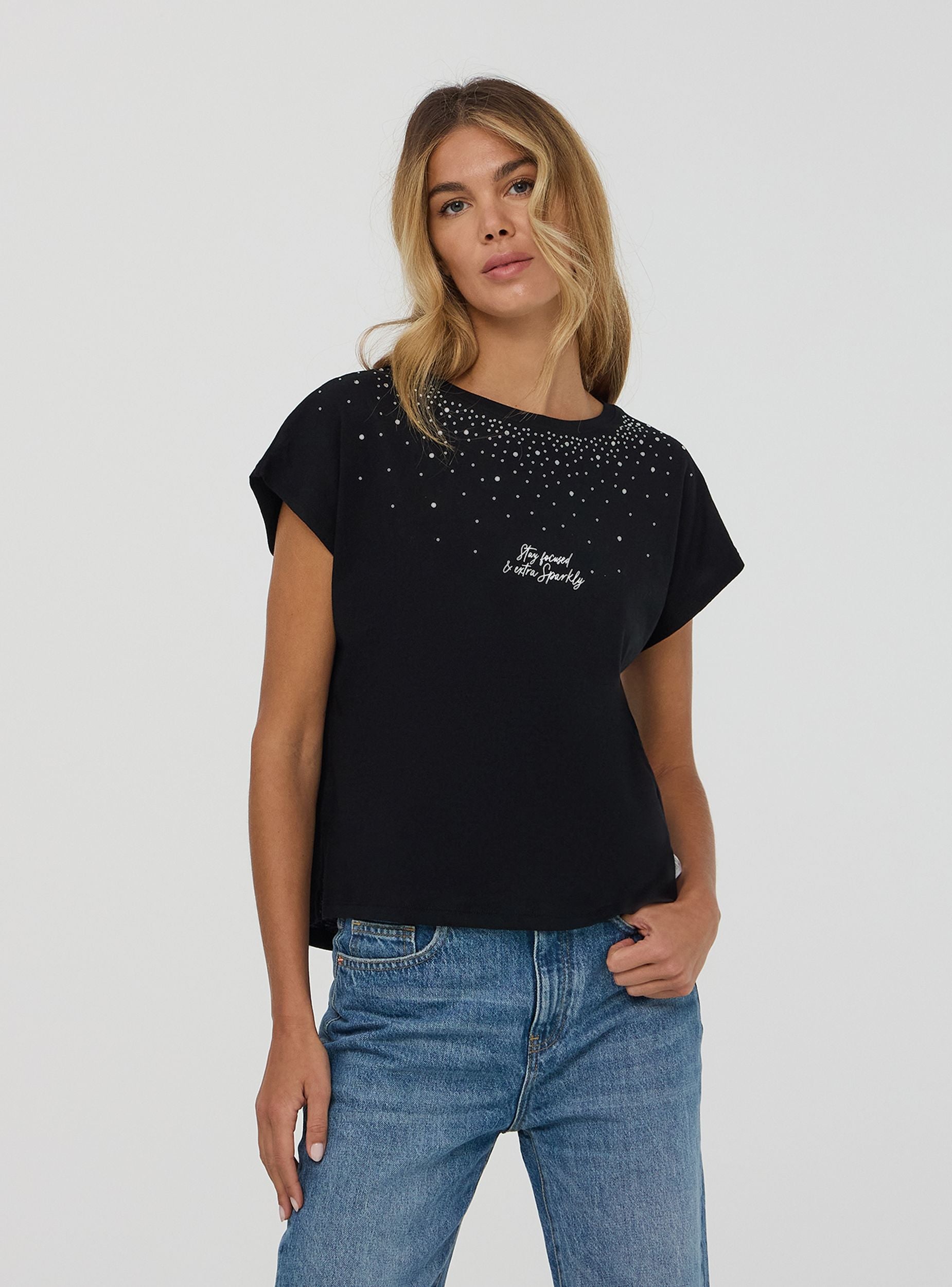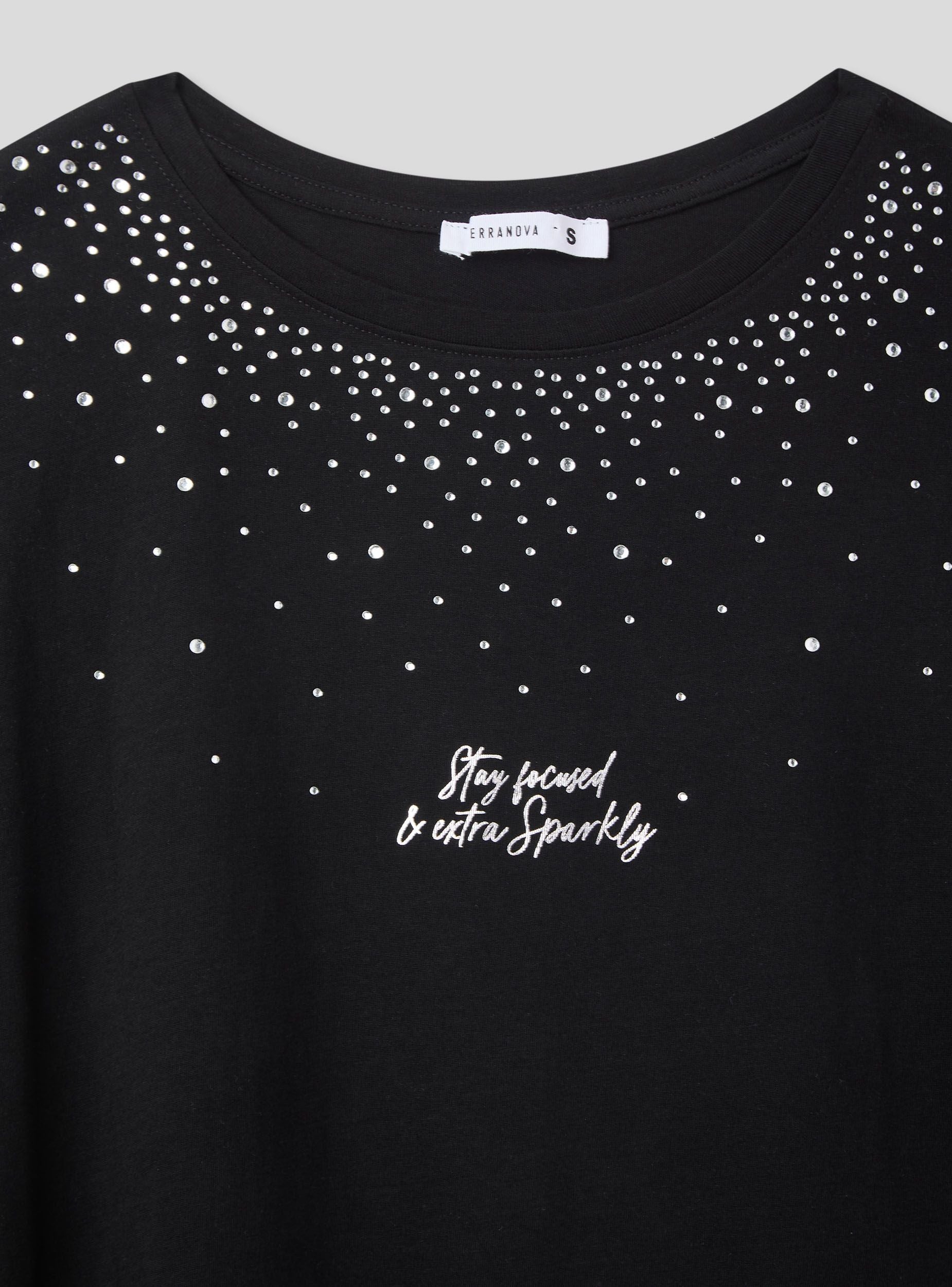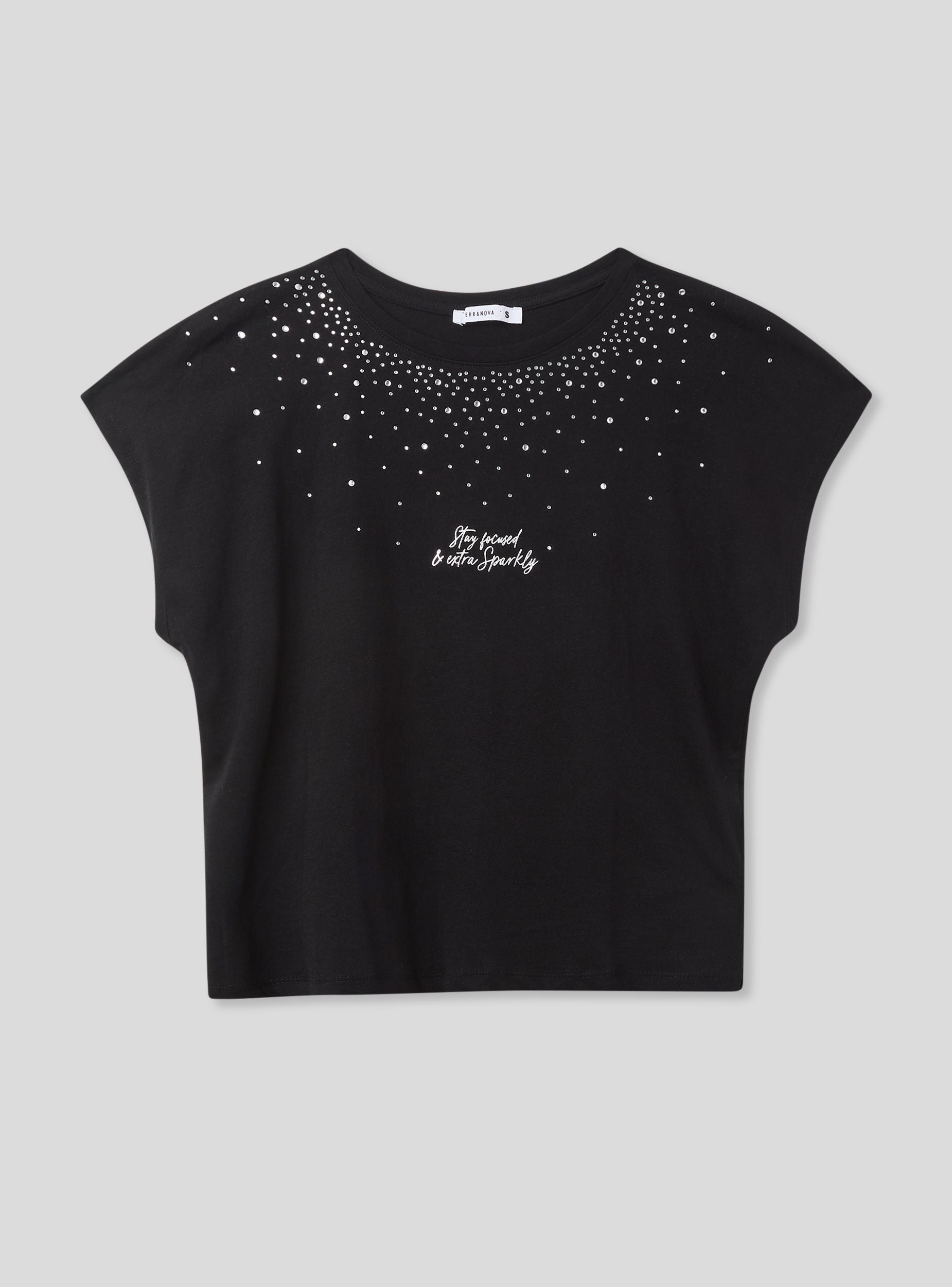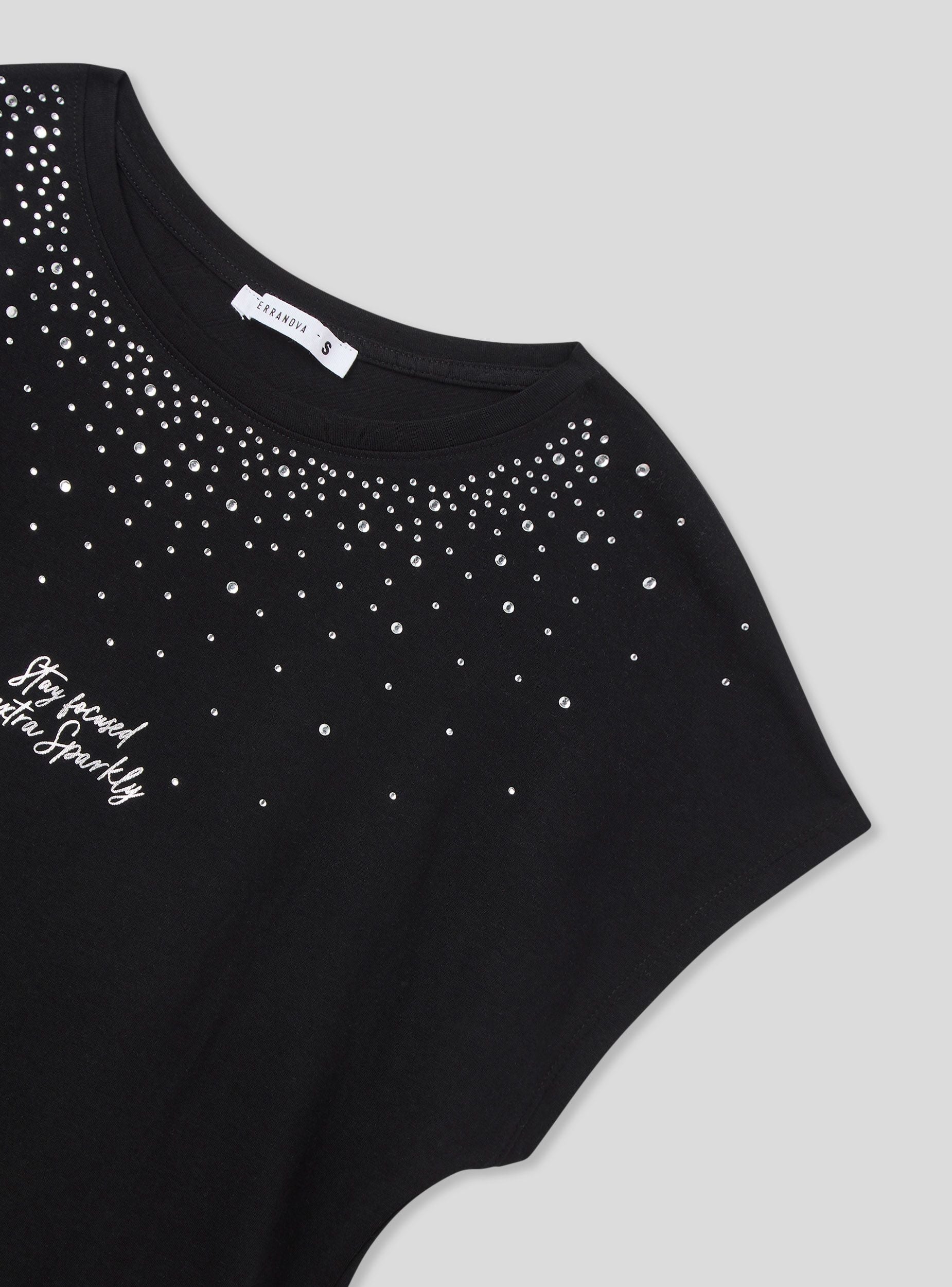 Maglietta da donna ampia, caratterizzata da un girocollo e maniche corte. Il design presenta una combinazione di strass che decorano la parte superiore del capo, creando un effetto luminoso e accattivante. Sul davanti, una scritta aggiunge un tocco distintivo. Questo capo è ideale per chi cerca un look casual ma con dettagli sofisticati, perfetto per arricchire qualsiasi outfit quotidiano con un tocco di originalità e luce.Dettagli