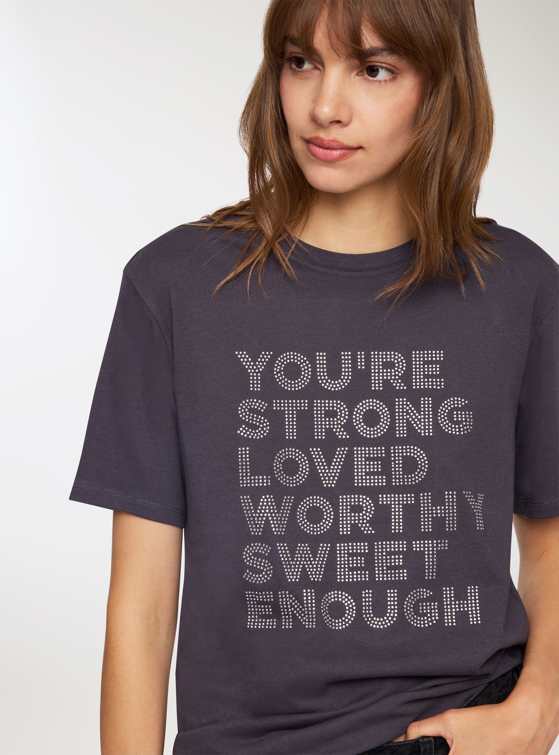 Maglietta da donna con vestibilità ampia, ideale per un look casual e confortevole. Presenta una scritta decorativa sul davanti con effetto luccicante che aggiunge un tocco di stile unico. Perfetta da abbinare a jeans o pantaloni per un outfit quotidiano. Il design a maniche corte e il girocollo la rendono versatile e adatta a diverse occasioni.Dettagli