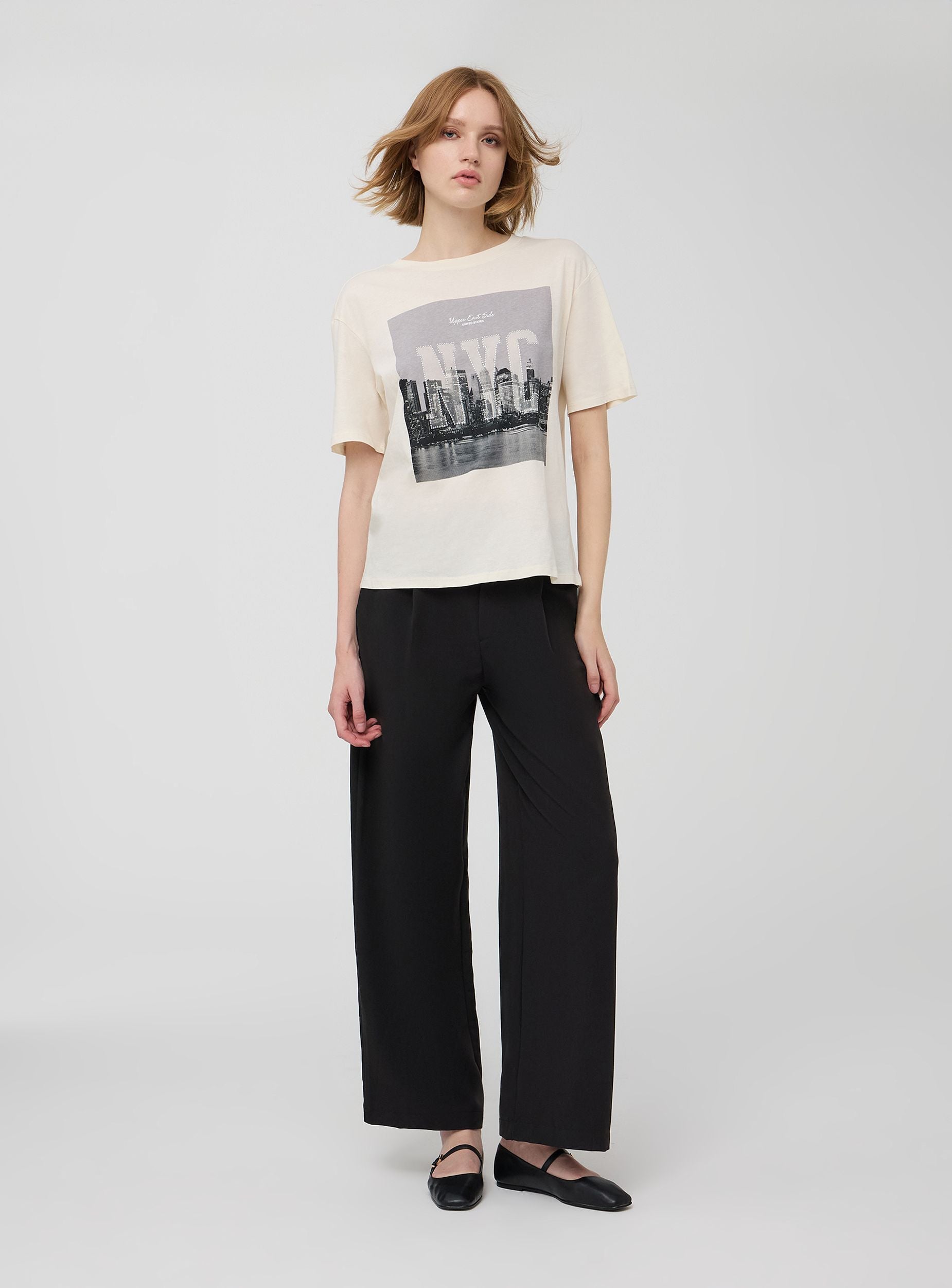 Maglietta da donna con maniche corte e girocollo. La parte frontale presenta una stampa della città di New York con la scritta "NYC" in grande. La parte posteriore è semplice e priva di decorazioni. Il design è casual e adatto per un look urban e alla moda.Dettagli
