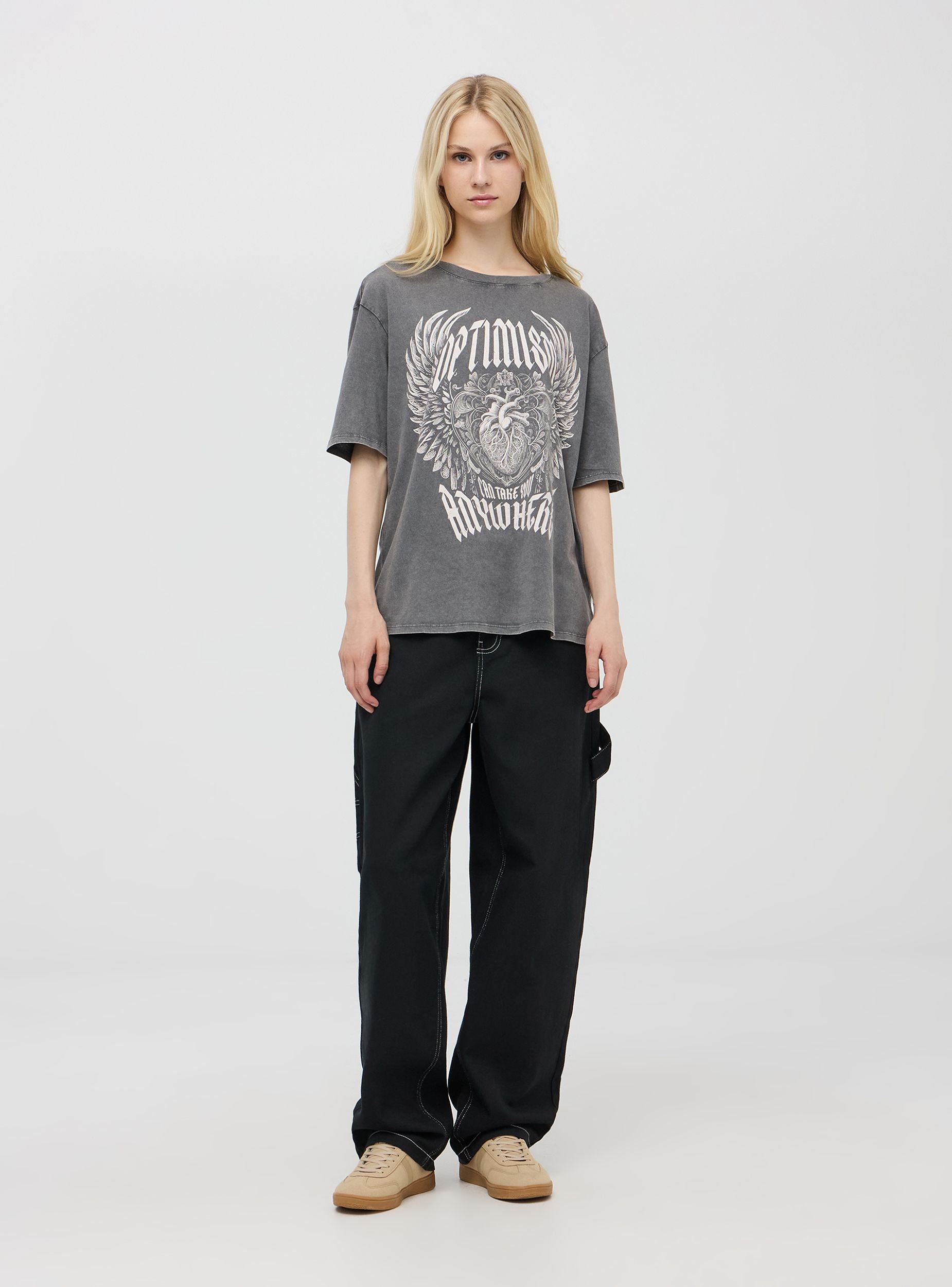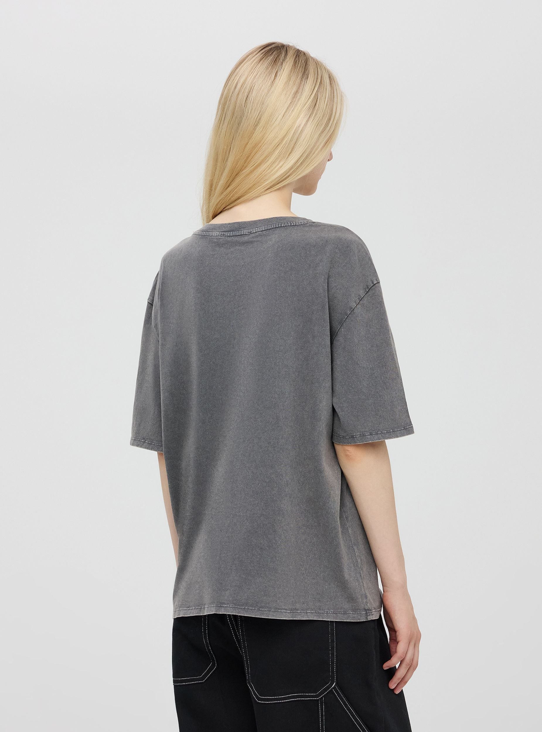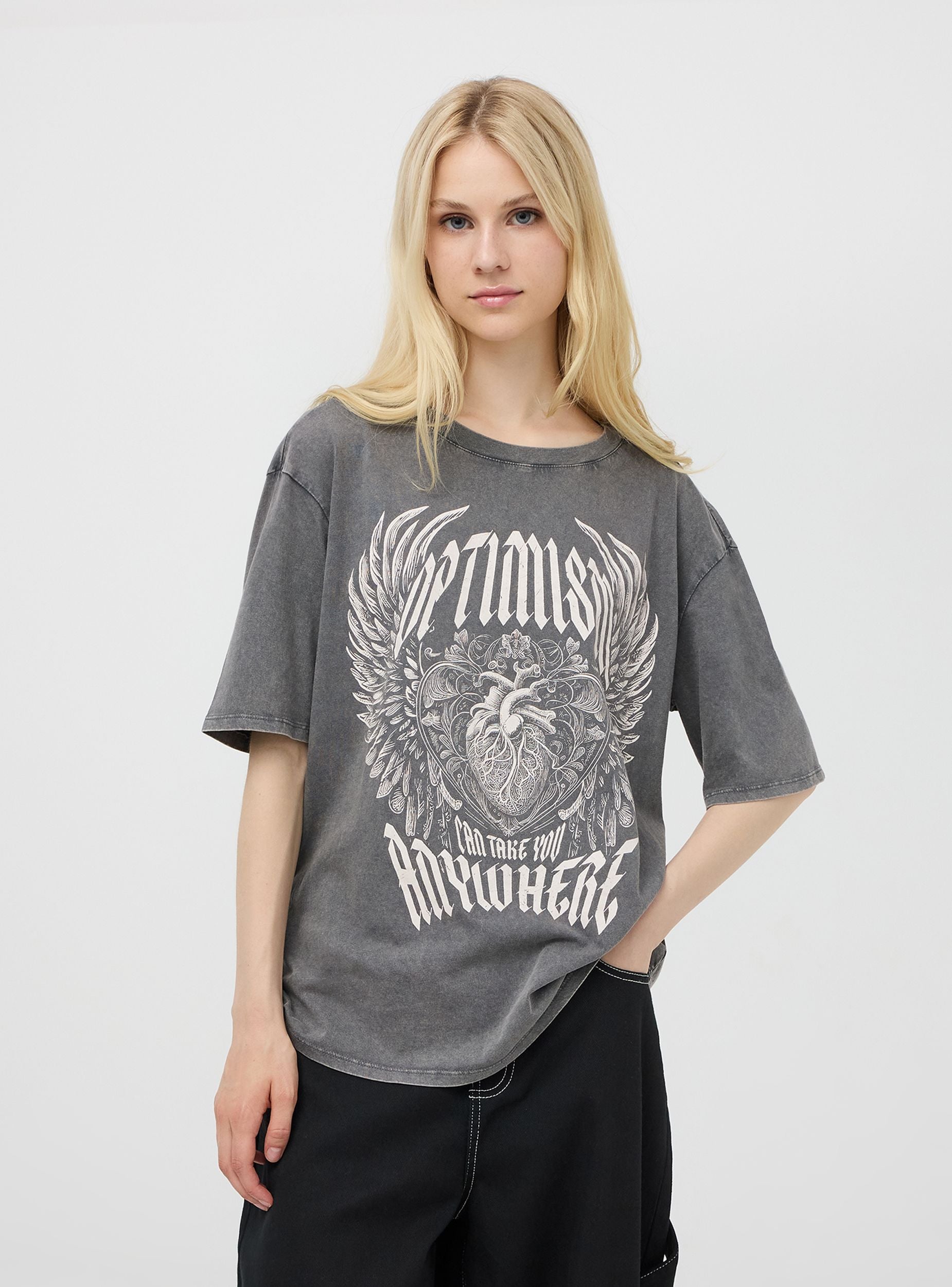 Maglietta da donna in jersey di cotone con stampa rock. Modello girocollo con maniche corte. Vestibilità ampia.Dettagli