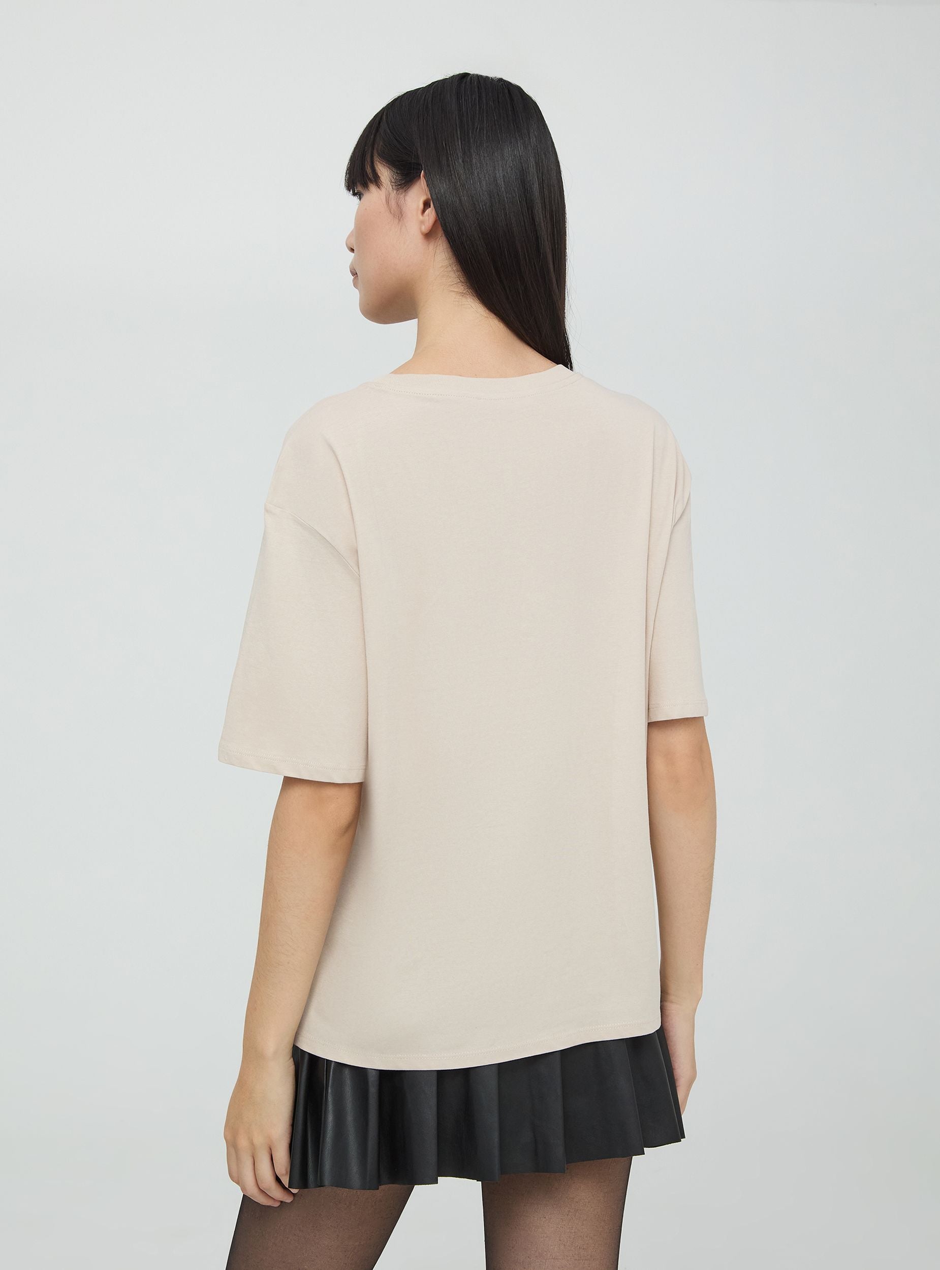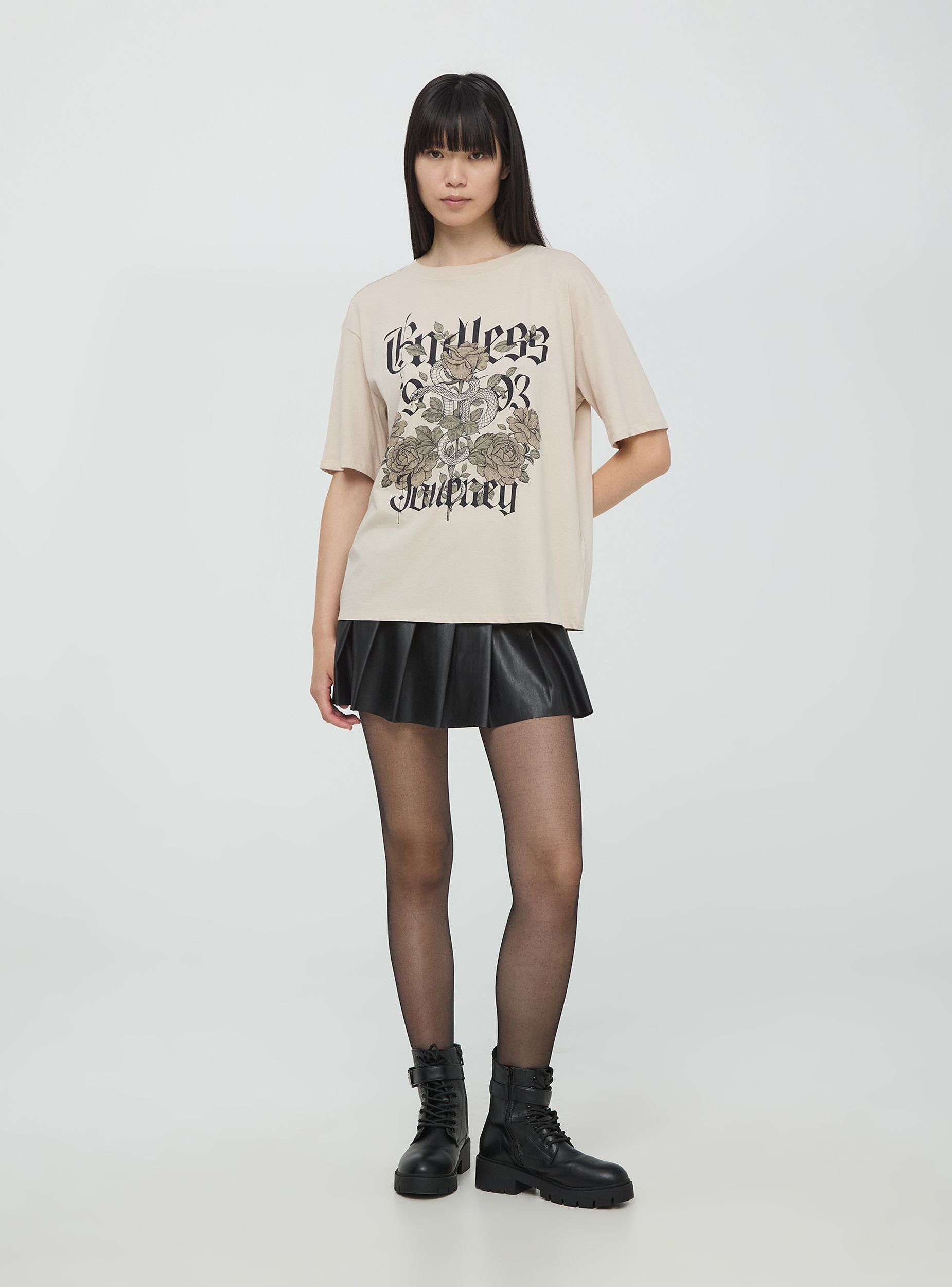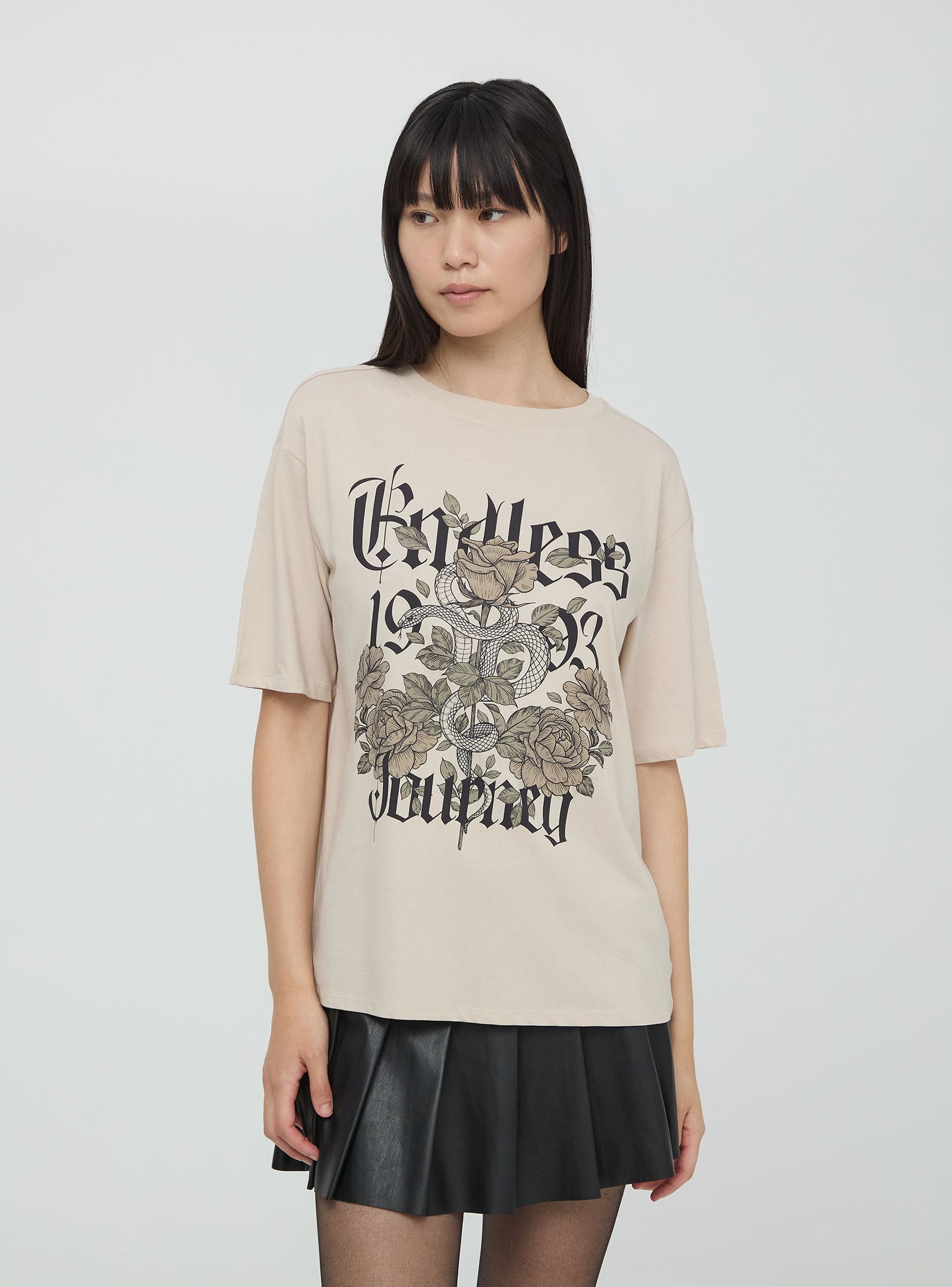 Maglietta da donna in jersey di cotone con stampa scritte e rose. Modello girocollo con maniche corte. Vestibilità ampia.Dettagli
