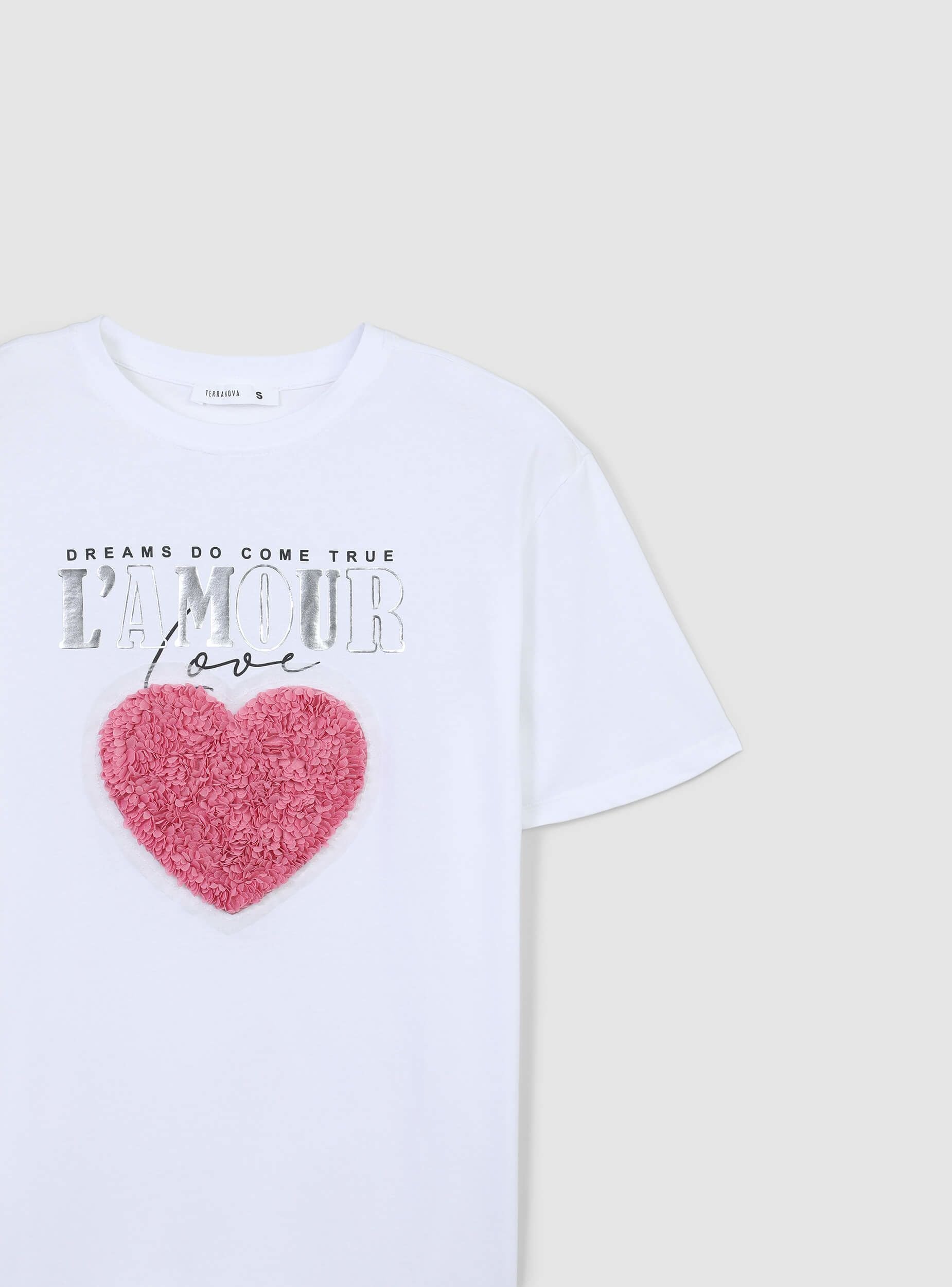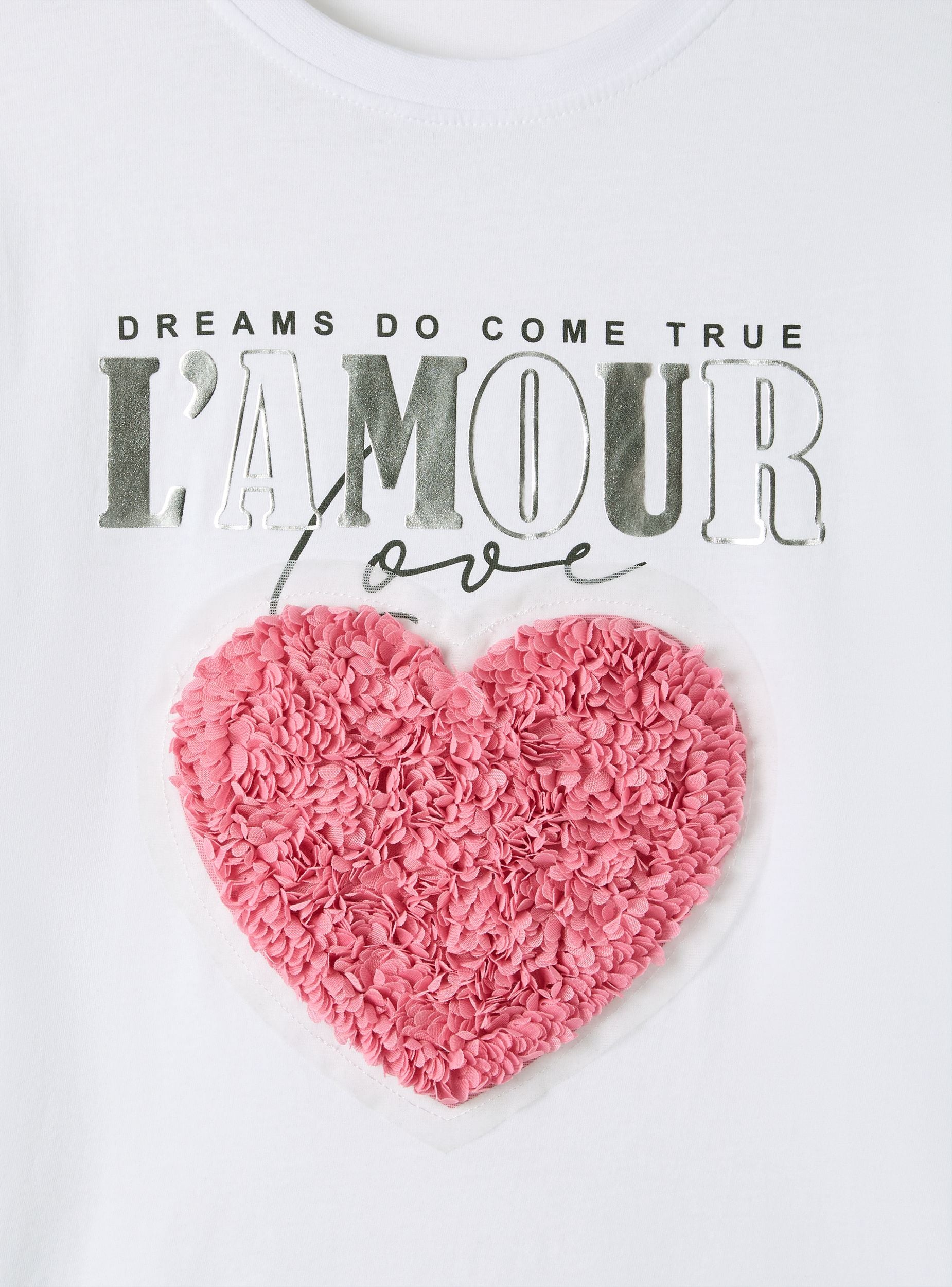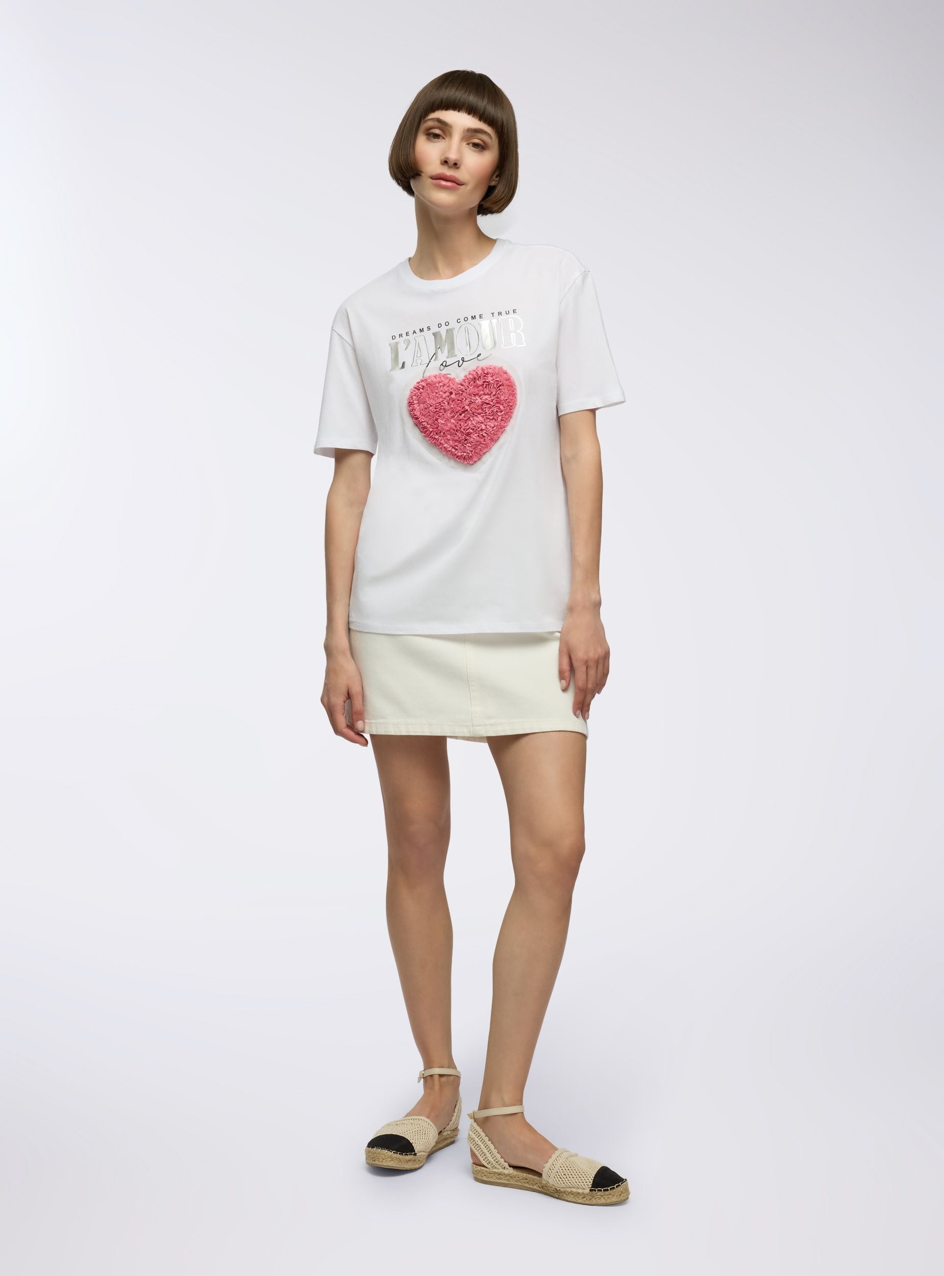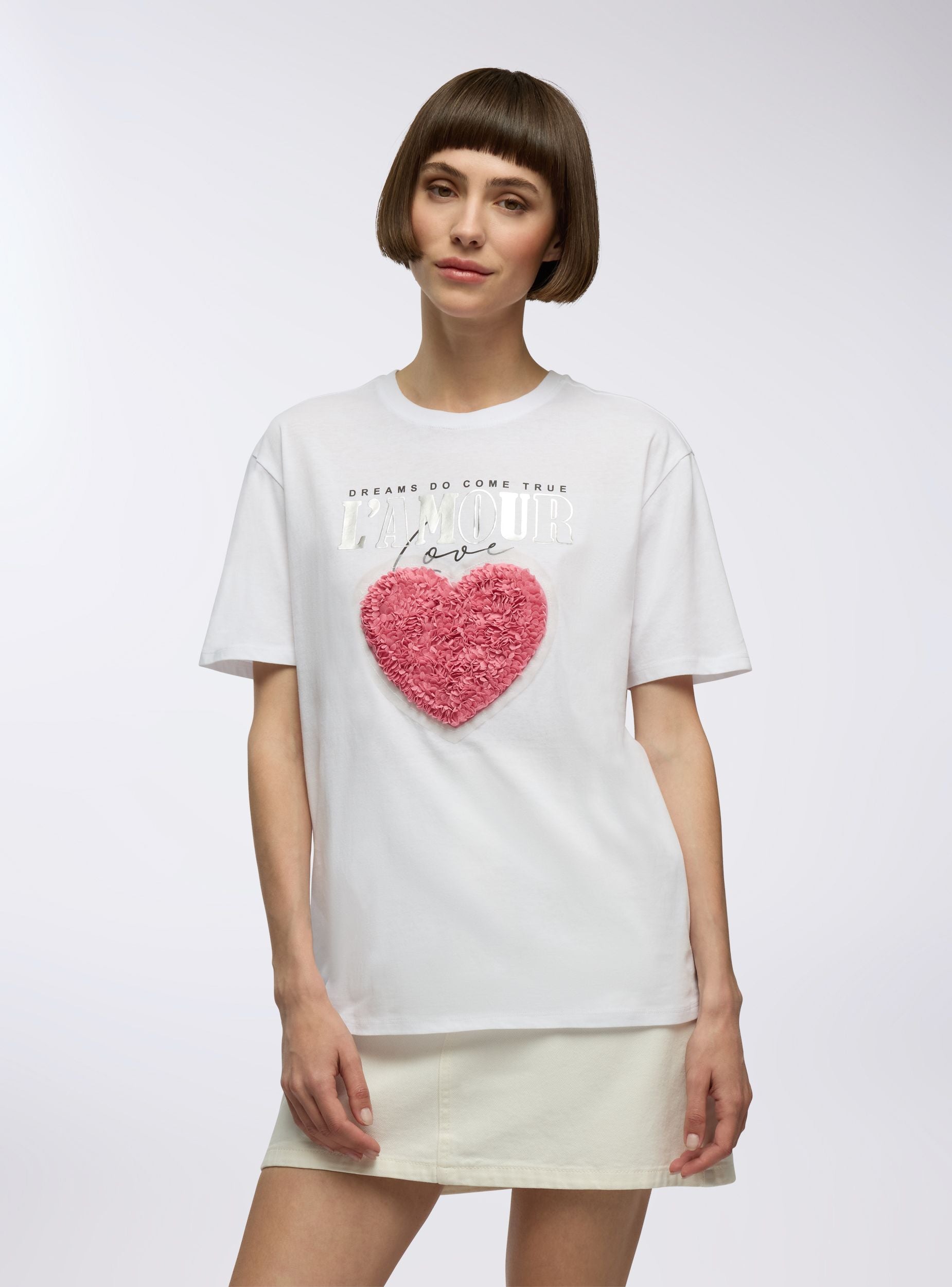 Maglietta da donna ideale per un look casual e moderno. Presenta un design con applicazioni decorative e una scritta sul davanti, perfetta per aggiungere un tocco di originalità al tuo outfit. Si abbina facilmente a jeans o pantaloni per un look quotidiano o informale. Vestibilità comoda e stile versatile per diverse occasioni.Dettagli