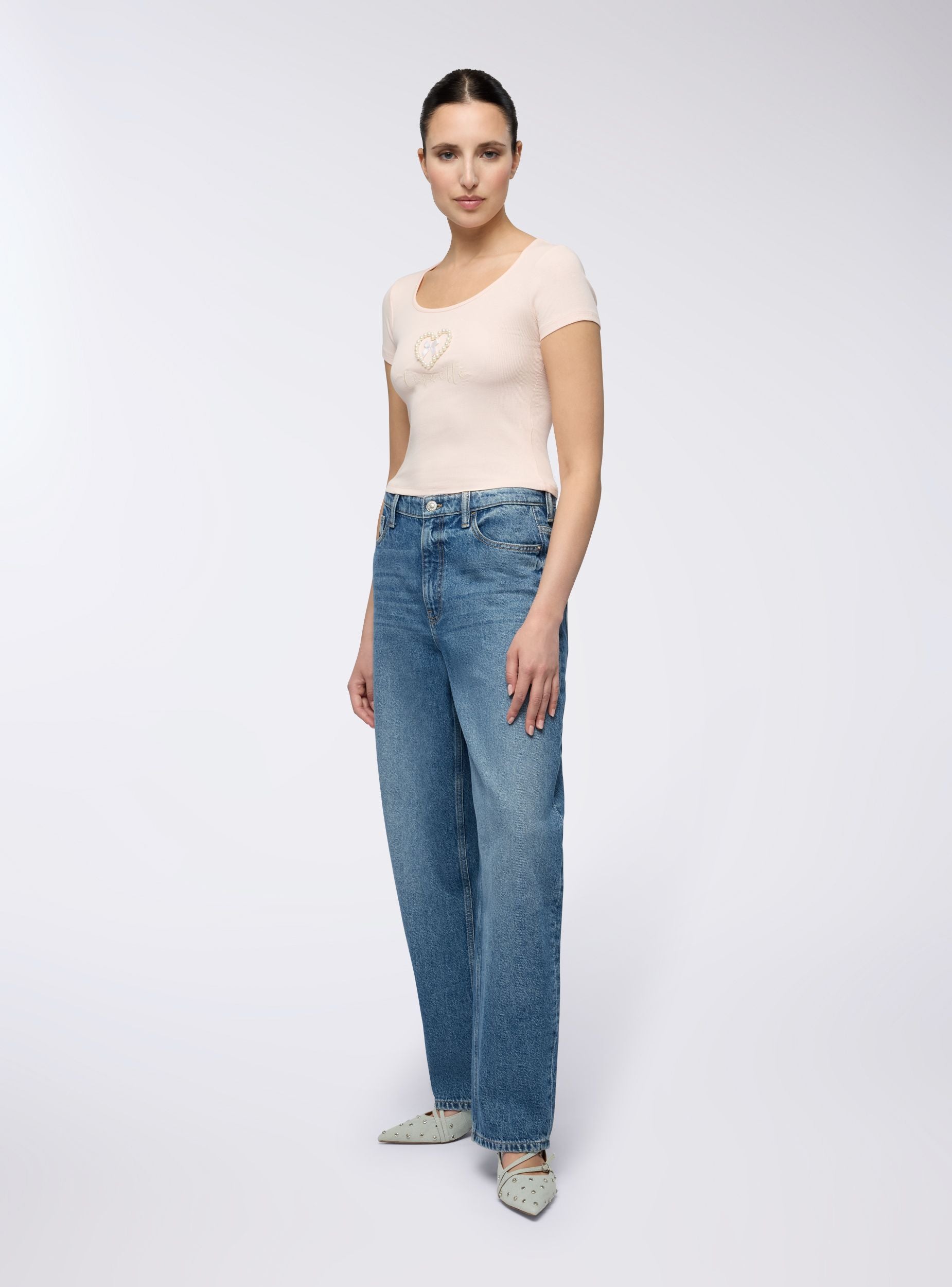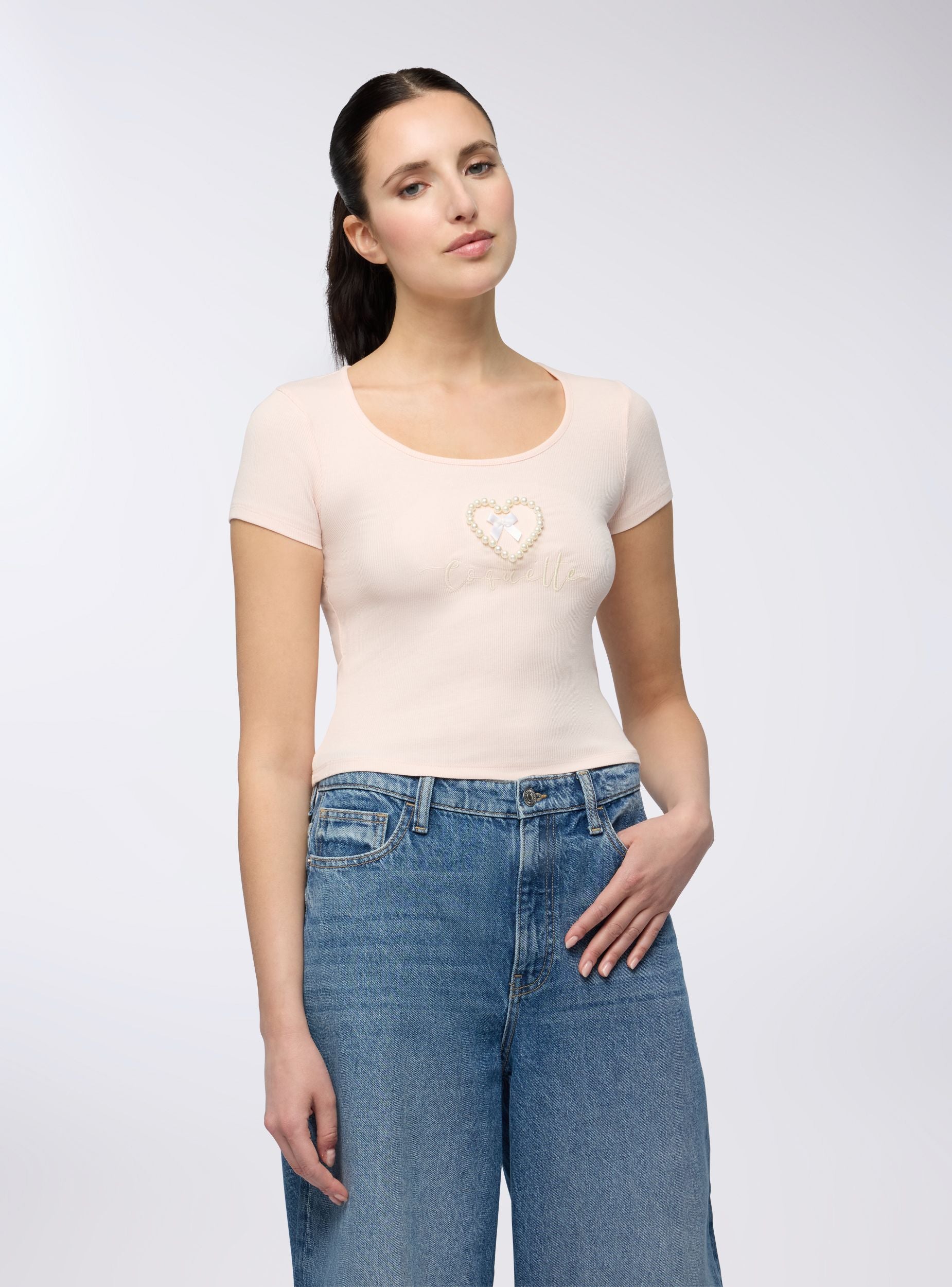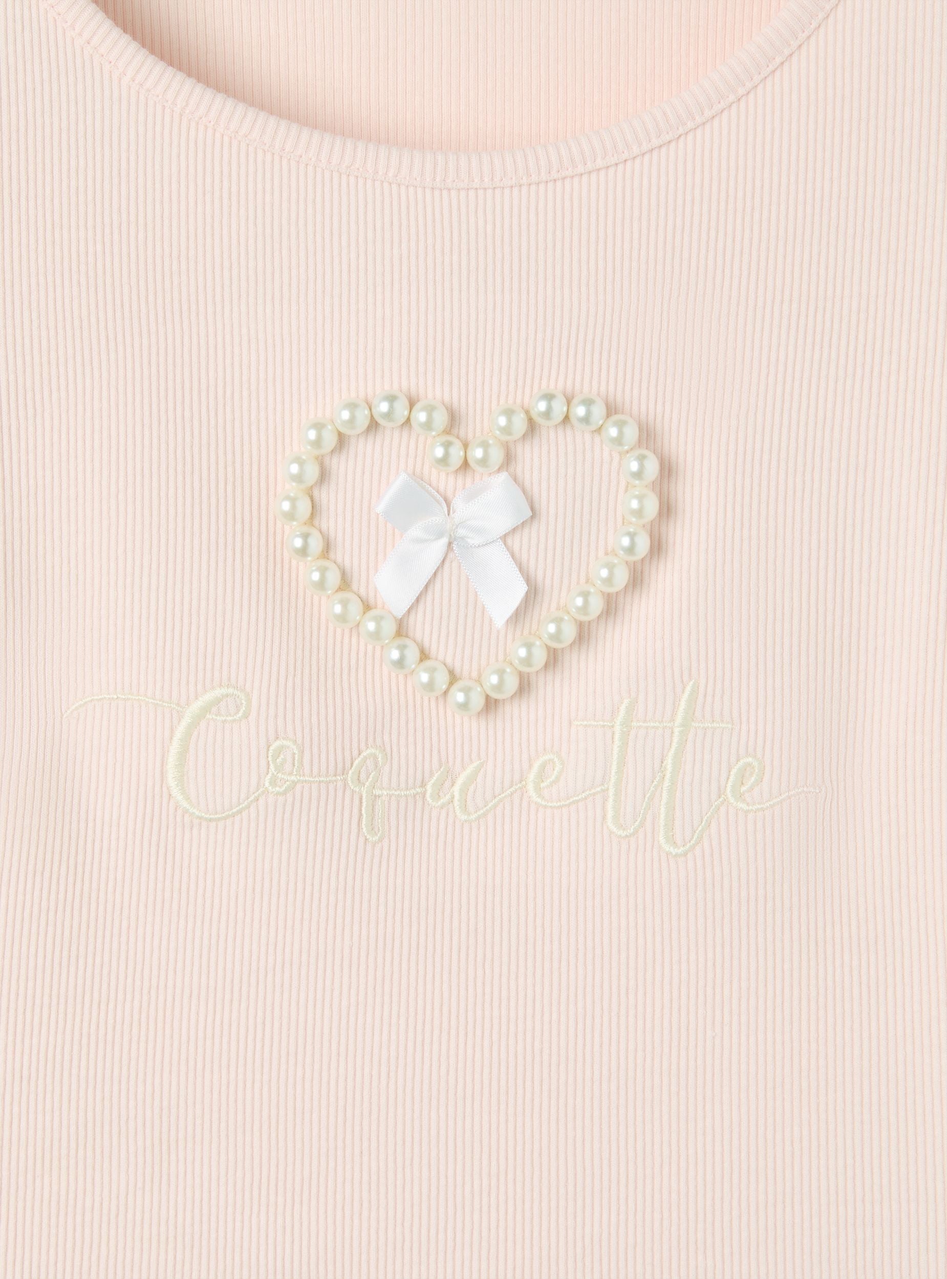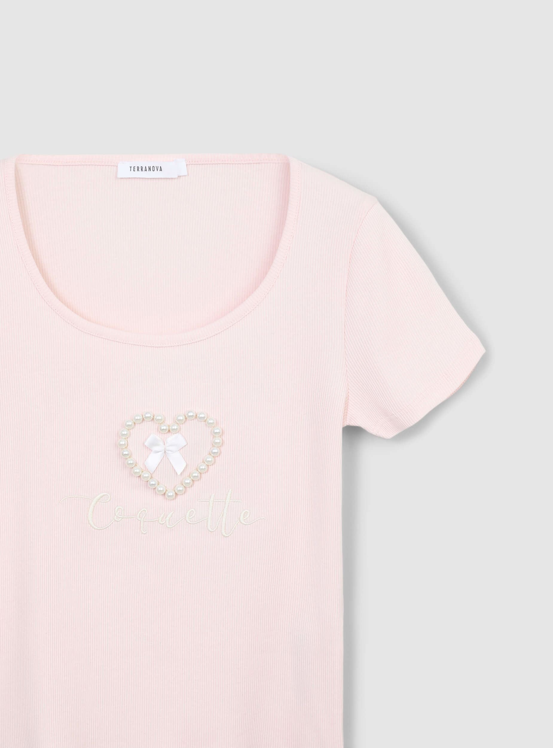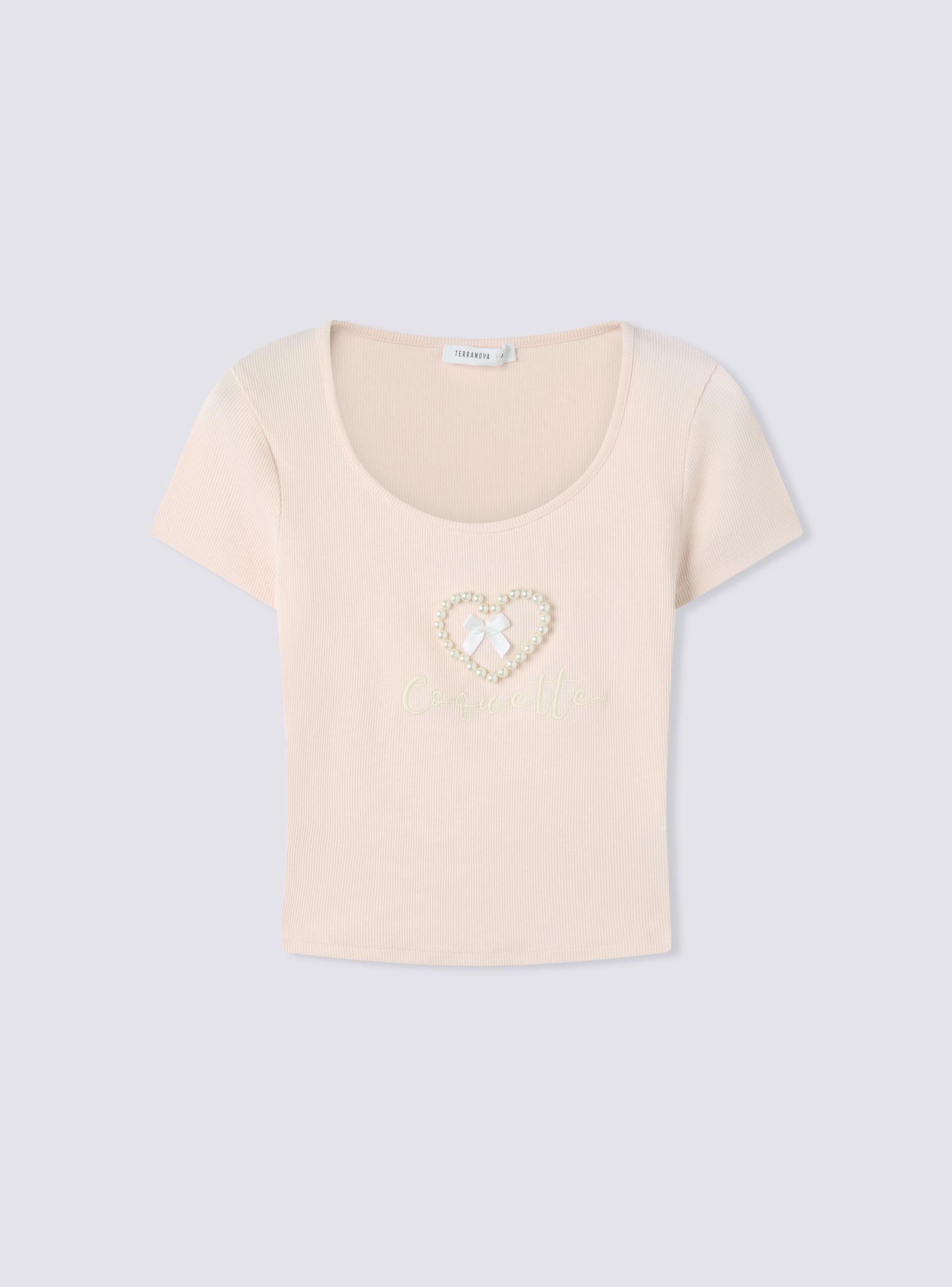Maglietta da donna ideale per un look casual e femminile, perfetta per il tempo libero o per un outfit informale. Caratterizzata da un tessuto elasticizzato a costine, presenta un design con scollo ampio e maniche corte. Dettagli decorativi come perle che formano un cuore, fiocco e scritta, aggiungono un tocco di eleganza al capo, rendendolo versatile e adatto a diverse occasioni.Dettagli